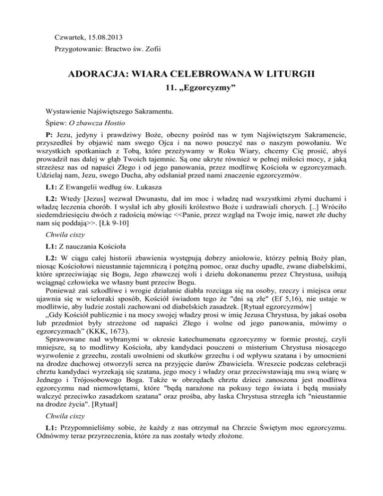 Czwartek, 15.08.2013 Przygotowanie: Bractwo św. Zofii ADORACJA: WIARA CELEBROWANA W LITURGII 11. „Egzorcyzmy” Wystawienie Najświętszego Sakramentu. Śpiew: O zbawcza Hostio P: Jezu, jedyny i prawdziwy BoŜe, obecny pośród nas w tym Najświętszym Sakramencie, przyszedłeś by objawić nam swego Ojca i na nowo pouczyć nas o naszym powołaniu. We wszystkich spotkaniach z Tobą, które przeŜywamy w Roku Wiary, chcemy Cię prosić, abyś prowadził nas dalej w głąb Twoich tajemnic. Są one ukryte równieŜ w pełnej miłości mocy, z jaką strzeŜesz nas od napaści Złego i od jego panowania, przez modlitwę Kościoła w egzorcyzmach. Udzielaj nam, Jezu, swego Ducha, aby odsłaniał przed nami znaczenie egzorcyzmów. L1: Z Ewangelii według św. Łukasza L2: Wtedy [Jezus] wezwał Dwunastu, dał im moc i władzę nad wszystkimi złymi duchami i władzę leczenia chorób. I wysłał ich aby głosili królestwo BoŜe i uzdrawiali chorych. [..] Wróciło siedemdziesięciu dwóch z radością mówiąc <<Panie, przez wzgląd na Twoje imię, nawet złe duchy nam się poddają>>. [Łk 9-10] Chwila ciszy L1: Z nauczania Kościoła L2: W ciągu całej historii zbawienia występują dobrzy aniołowie, którzy pełnią BoŜy plan, niosąc Kościołowi nieustannie tajemniczą i potęŜną pomoc, oraz duchy upadłe, zwane diabelskimi, które sprzeciwiając się Bogu, Jego zbawczej woli i dziełu dokonanemu przez Chrystusa, usiłują wciągnąć człowieka we własny bunt przeciw Bogu. PoniewaŜ zaś szkodliwe i wrogie działanie diabła rozciąga się na osoby, rzeczy i miejsca oraz ujawnia się w wieloraki sposób, Kościół świadom tego Ŝe "dni są złe" (Ef 5,16), nie ustaje w modlitwie, aby ludzie zostali zachowani od diabelskich zasadzek. [Rytuał egzorcyzmów] „Gdy Kościół publicznie i na mocy swojej władzy prosi w imię Jezusa Chrystusa, by jakaś osoba lub przedmiot były strzeŜone od napaści Złego i wolne od jego panowania, mówimy o egzorcyzmach” (KKK, 1673). Sprawowane nad wybranymi w okresie katechumenatu egzorcyzmy w formie prostej, czyli mniejsze, są to modlitwy Kościoła, aby kandydaci pouczeni o misterium Chrystusa niosącego wyzwolenie z grzechu, zostali uwolnieni od skutków grzechu i od wpływu szatana i by umocnieni na drodze duchowej otworzyli serca na przyjęcie darów Zbawiciela. Wreszcie podczas celebracji chrztu kandydaci wyrzekają się szatana, jego mocy i władzy oraz przeciwstawiają mu swą wiarę w Jednego i Trójosobowego Boga. TakŜe w obrzędach chrztu dzieci zanoszona jest modlitwa egzorcyzmu nad niemowlętami, które "będą naraŜone na pokusy tego świata i będą musiały walczyć przeciwko zasadzkom szatana" oraz prośba, aby łaska Chrystusa strzegła ich "nieustannie na drodze Ŝycia". [Rytuał] Chwila ciszy L1: Przypomnieliśmy sobie, Ŝe kaŜdy z nas otrzymał na Chrzcie Świętym moc egzorcyzmu. Odnówmy teraz przyrzeczenia, które za nas zostały wtedy złoŜone. ODNOWIENIE PRZYRZECZEŃ CHRZCIELNYCH P2: Przez misterium paschalne zostaliśmy w sakramencie chrztu pogrzebani wespół z Chrystusem w Jego śmierci, aby razem z Nim wkroczyć w nowe Ŝycie. Odnówmy przyrzeczenia chrztu świętego, w których niegdyś wyrzekliśmy się złego ducha i jego spraw, a przyrzekliśmy słuŜyć Bogu w świętym Kościele katolickim. A zatem pytam kaŜdego z was: Czy wyrzekasz się grzechu, aby Ŝyć w wolności dzieci BoŜych? W. Wyrzekam się. P2. Czy wyrzekasz się wszystkiego, co prowadzi do zła, aby ciebie grzech nie opanował? W Wyrzekam się. P2. Czy wyrzekasz się szatana, który jest głównym sprawcą grzechu? W. Wyrzekam się. P2. Czy wierzysz w Boga, Ojca Wszechmogącego, Stworzyciela nieba i ziemi? W. Wierzę. P2. Czy wierzysz w Jezusa Chrystusa, Syna Jego Jedynego, a naszego Pana narodzonego z Maryi Dziewicy, umęczonego i pogrzebanego, który powstał z martwych i zasiada po prawicy Ojca? W Wierzę. P2. Czy wierzysz w Ducha Świętego, święty Kościół powszechny, obcowanie świętych, odpuszczenie grzechów, zmartwychwstanie ciała i Ŝycie wieczne? W. Wierzę. P2. Bóg Wszechmogący Ojciec naszego Pana Jezusa Chrystusa, który nas odrodził z wody i Ducha Świętego, i który udzielił nam odpuszczenia grzechów, niech nas strzeŜe swoją łaską w naszym Panu Jezusie Chrystusie, na Ŝycie wieczne. W. Amen. Modlitwa w ciszy Śpiew: Com przyrzekł Bogu L1: Z nauczania Kościoła L2: ChociaŜ wierni odrodzili się w Chrystusie, doświadczają pokus tego świata. Dlatego winni czuwać na modlitwie i prowadzić trzeźwe Ŝycie, poniewaŜ ich przeciwnik, "diabeł, jak lew ryczący krąŜy, szukając, kogo poŜreć" (1 P 5, 8). Winni mu się przeciwstawiać mocni w wierze oraz utwierdzeni "w Panu siłą Jego potęgi" (Ef 6,10), a takŜe wspierani przez Kościół, który prosi za swoich synów, aby byli "bezpieczni od wszelkiego zamętu". Dzięki łasce płynącej z sakramentów, a zwłaszcza z częstego udziału w celebracji pokuty otrzymują oni moc do osiągnięcia pełnej wolności dzieci BoŜych (por. Rz 8,21). [Rytuał, 9] L1: Abba Ewagriuszu, spędziłeś lata swego Ŝycia na Egipskiej pustyni zmagając się z duchami nieczystymi. PomóŜ nam zgłębić znaczenie tych słów. Powiedz mi najpierw o demonie „jak lew ryczącym” L2: „Demon acedii [czyli duchowego zniechęcenia], nazywany takŜe demonem południa jest najuciąŜliwszy spośród wszystkich demonów. […] Najpierw sprawia, Ŝe […] dzień tak się dłuŜy, jakby miał pięćdziesiąt godzin. Następnie przymusza mnicha, aby ciągle wyglądał przez okno i wybiegał z celi, by wpatrywać się w słońce, jak daleko jeszcze do godziny dziewiątej; albo by oglądał się tu i ówdzie, czy któryś z braci nie [nadchodzi]. Wzbiera w nim jeszcze nienawiść do miejsca, [w którym mieszka], do takiego Ŝycia i do ręcznej pracy. I [podsuwa myśl], Ŝe zanikła miłość wśród braci, a nie ma nikogo, kto by go pocieszył. [...] Sprawia, Ŝe opanowuje go tęskn