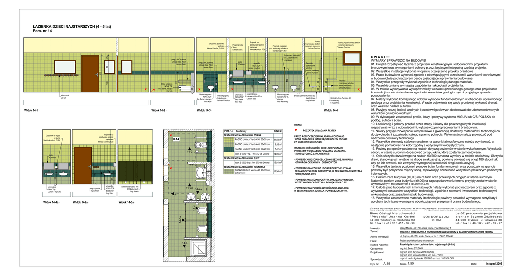 ŁAZIENKA DZIECI NAJSTARSZYCH (4 - 5 lat) Pom. nr 14 Siedzisko prysznicowe uchylne, montaż naścienny, Lehnen Function 130 Siedzisko prysznicowe uchylne, montaż naścienny, Lehnen Function Widok 14-2 Uchwyt papieru toaletowego Lehnen Function umywalka NOVA TOP Bez Barier f-my Koło poręcz ścienna łukowa uchylna 60cm Lehnen Basic Miska ustępowa lejowa KIND 6l, wisząca f-my Keramag 2 35 65 35 35 2 Miska ustępowa NOVA TOP Bez Barier, wisząca f-my Koło wieszaczki 20 szt Widok 14-1 40 umywalka NOVA TOP Junior, f- myKoło 112 100 Miska ustępowa NOVA TOP Bez Barier, wisząca f-my Koło Poręcz prysznicowa z gładkim ramieniem pionowym, Lehnen Function Systemowa kabina WC 015 Zieleń limonki f-my Alsanit 205 80 poręcz WC ścienna łukowa stała, 70cm Lehnen Basic Poręcz prysznicowa z gładkim ramieniem pionowym, Lehnen Function Pojemnik na papier toaletowy w listkach Merida Top PT3NT 35 lustro 50x60cm Pojemnik na pojedyncze ręczniki papierowe Merida Komfort, PZ8 40 poręcz WC ścienna łukowa stała, 70cm Lehnen Basic Poręcz prosta 30cm, Lehnen Basic 35 25 Dozownik do mydła w płynie Merida Komfort, D1BN Brodzik Lehnen Funktion 90 kwadratowy f-my Lehnen Widok 14-3 Brodzik Lehnen Funktion 90 kwadratowy f-my Lehnen Widok 14-4 UWAGI: POM. 14 Pojemnik na pojedyncze ręczniki papierowe Merida Komfort, PZ8 Dozownik do mydła w płynie Merida Komfort, D1BN RAZEM ZESTAWIENIE MATERIAŁÓW: ŚCIANA 0.14 14-2 lustro 40x60cm 65 RAGNO Unitech Verde 440, 20x20 cm 9,85 m 2 RAGNO Unitech Verde 430, 20x20 cm 7,42 m2 kolor: S 0510 Y np.: f-my STO lub Decoral 24,09 m2 WSZELKIE NIEŚCISŁOŚCI W DETALU POSADZKI, PROBLEMY W USTALENIU POCZĄTKU UKŁADANIA - KONSULTOWAĆ Z ARCHITEKTEM kolor: S 0502-B np.: f-my STO lub Decoral 15,84 m2 - POWIERZCHNIĘ ŚCIAN OBLICZONO BEZ ODEJMOWANIA OTWORÓW OKIENNYCH I DRZWIOWYCH ZESTAWIENIE MATERIAŁÓW: POSADZKA RAGNO Unitech Verde 440, 20x20 cm 15,94 m2 - POWIERZCHNIA PODŁÓG I ŚCIAN POKRYTA PŁYTKAMI CERAMICZNYMI ORAZ GRESOWYMI, W ZESTAWIENIACH ZOSTAŁA POWIĘKSZONA O 5% - POWIERZCHNIA ŚCIAN POKRYTA OKŁADZINĄ VINYLOWĄ W ZESTAWIENIACH ZOSTAŁA POWIĘKSZONA O 5% 14-2a 14-4a 14-1 Systemowa kabina WC 018 Zieleń jodły f-my Alsanit 14-3 Widok 14-3a - POWIERZCHNIA PODŁÓG WYKOŃCZONA LINOLEUM, W ZESTAWIENIACH ZOSTAŁA POWIĘKSZONA O 10% Prawa autorskie zastrzeżone. Wykorzystywanie, kopiowanie i rozpowszechnianie dokumentacji bez zgody projektanta zabronione. Projektant zastrzega sobie prawo wprowadzania zmian. Biuro Obsługi Nieruchomości "Phoenix" Joanna Korbel 44 -280 Rydułtowy, ul. Raciborska 363 tel. / fax : + 48 / 32 / 457 - 38 - 90 14-3a Widok 14-2a umywalka NOVA TOP Bez Barier f-my Koło PRZED ROZPOCZĘCIEM UKŁADANIA PORÓWNAĆ WZÓR POSADZKI Z ISTNIEJĄCYMI ODLEGŁOŚCIAMI PO WYMUROWANIU ŚCIAN 41,04 m 2 plytki gresowe 5 100 65 2 poręcz prosta f-my Lehnen - POCZĄTEK UKŁADANIA PŁYTEK RAGNO Unitech Verde 450, 20x20 cm ZESTAWIENIE MATERIAŁÓW: SUFIT umywalka Nova Top Junior, f-my Koło Widok 14-4a Sanitariaty U W A G I !!!: WYMIARY SPRAWDZIĆ NA BUDOWIE! 01. Projekt rozpatrywać łącznie z projektem konstrukcyjnym i odpowiednimi projektami branżowymi oraz wymaganiami ochrony p.poż, będącymi integralną częścią projektu. 02. Wszystkie instalacje wykonać w oparciu o załączone projekty branżowe 03. Prace budowlane wykonać zgodnie z obowiązującymi przepisami i warunkami technicznymi w budownictwie pod nadzorem osoby posiadającej uprawnienia budowlane. 04. Wszystkie przegrody wykonać zgodnie z technologią danego materiału. 05. Wszelkie zmiany wymagają uzgodnienia i akceptacji projektanta. 06. W trakcie wykonywania wykopów należy wezwać uprawnionego geologa oraz projektanta konstrukcji w celu stwierdzenia zgodności warunków geologicznych i przyjętego sposobu posadowienia. 07. Należy wykonać komisyjnego odbioru wykopów fundamentowych w obecności uprawnionego geologa oraz projektanta konstrukcji. W razie pojawienia się wody gruntowej wykonać drenaż oraz wezwać nadzór autorski. 08. Przyjęty rodzaj izolacji wodnych i przeciwwilgociowych dostosować do udokumentowanych warunków gruntowo-wodnych. 09. W dylatacjach zastosować profile, listwy i pokrywy systemu MIGUA lub C/S POLSKA do podłóg, sufitów i ścian. 10. Loaklizację i gabarty przebić przez stropy i ściany dla poszczególnych instalatacji rozpatrywać wraz z odpowiednimi, wykonawczymi opracowaniami branżowymi. 11. Należy przyjąć rozwiązanie kompleksowe z gwarancją dostawcy materiałów i technologii co do żywotności i szczelności całego systemu pokrycia. Wykonastwo należy prowadzić pod nadzorem dostawcy technologii. 12. Wszystkie elementy stalowe narażone na warunki atmosferyczne należy ocynkować, a następnie pomalować na kolor zgodny z wytycznymi kolorystycznymi. 13. Pozimy parapetów podane na rzutach dotyczą poziomów w stanie wykończonym. Wysokość otworu w stanie surowym dopasować do typu okna, które zostanie zamontowane. 14. Opis skrzydła drzwiowego na rzutach 90/200 oznacza wymiary w świetle ościeżnicy. Skrzydła drzwi, stanowiących wyjście na drogę ewakuacyjną, powinny otwierać się o kąt 180 stopni tak aby po ich otwarciu nie zawężały wymaganej szerokości drogi ewakuacyjnej. 15. Wszystkie izolacje poziome i pionowe ścian fundamentowych oraz posadzek na gruncie powinny być połączone między sobą, zapewniając szczelność wszystkich płaszczyzn poziomych i pionowych. 16. Poziom zera budynku (±0,00) na rzutach oraz przekrojach przyjęto w stanie surowym. Natomiat poziom zera budynku (±0,00) na zagospodarowaniu terenu przyjęty został w stanie wykończonym na poziomie 315,20m n.p.m. 17. Całość prac budowlanych i montażowych należy wykonać pod nadzorem oraz zgodnie z wytycznymi dostawców wszystkich technologii, zgodnie z normami i warunkami technicznymi wykonastwa oraz zasadami sztuki budowlanej. 18. Wszystkie zastosowane materiały i technologie powinny posiadać wymagane certyfikaty i aprobaty techniczne