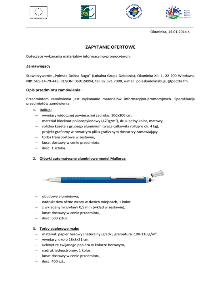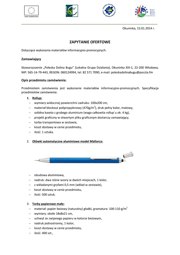 _____________________________________________ Okuninka, 15.01.2014 r. ZAPYTANIE OFERTOWE Dotyczące wykonania materiałów informacyjno-promocyjnych. Zamawiający Stowarzyszenie „Poleska Dolina Bugu” (Lokalna Grupa Działania), Okuninka XIII-1, 22-200 Włodawa, NIP: 565-14-79-443, REGON: 060124994, tel. 82 571 7090, e-mail: [email protected] Opis przedmiotu zamówienia: Przedmiotem zamówienia jest wykonanie materiałów informacyjno-promocyjnych. Specyfikacja przedmiotów zamówienia: 1. Rollup: − wymiary widocznej powierzchni zadruku: 100x200 cm, − materiał blockout polipropylenowy (470g/m2), druk pełny kolor, matowy, − solidna kaseta z grubego aluminium (waga całkowita rollup`u ok. 4 kg), − projekt graficzny w otwartym pliku graficznym dostarczy zamawiający, − torba transportowa w zestawie, − koszt dostawy w cenie przedmiotu, − ilość: 1 sztuka. 2. Ołówki automatyczne aluminiowe model Mallorca: − − − − − obudowa aluminiowa, nadruk: dwa różne wzory w dwóch miejscach, 1 kolor, z wkładanymi gryfami 0,5 mm (wkład w zestawie), koszt dostawy w cenie przedmiotu, ilość: 500 sztuk. 3. Torby papierowe małe: − materiał: papier beżowy (naturalny) gładki, gramatura: 100-110 g/m2 − wymiary: około 18x8x21 cm, − uchwyt ze zwijanego papieru w kolorze beżowym, − nadruk jednostronny, 1 kolor, − koszt dostawy w cenie przedmiotu, − ilość: 400 szt., _____________________________________________ 4. Torby papierowe duże: − materiał: papier beżowy (naturalny) gładki, gramatura: 100-110 g/m2 − wymiary: około 25x11x32 cm, − uchwyt ze zwijanego papieru w kolorze beżowym, − nadruk jednostronny, 1 kolor, − koszt dostawy w cenie przedmiotu, − ilość: 400 szt., 5. Wizytówki: − format 90x50 mm, − papier: kreda mat, folia mat, 350 g/m2, − zadruk jednostronny pełny kolor (4+0), − projekt graficzny (1 wzór) nawiązujący wizualnie do grafiki strony internetowej zamawiającego www.dolina-bugu.pl, − koszt dostawy w cenie przedmiotu, − ilość: 1000 szt. Kryteria wyboru oferty: 1. Cena brutto – waga 100 % Forma i termin składania ofert Oferta powinna być: • przesłana za pośrednictwem e-maila na adres: [email protected] Termin składania ofert upływa w dniu: 24.01.2014r. o godz.15.00 Termin realizacji i płatność: Termin realizacji: 20.02.2014 r. Płatność: przelew w terminie 14 dni od dnia wystawienia faktury VAT w oparciu o podpisany protokół zdawczo-odbiorczy. Informacje dodatkowe Oferta może być złożona na formularzu udostępnionym przez Stowarzyszenie na stronie www.dolinabugu.pl , na własnym formularzu lub wklejona w treść maila. Każdy z Oferentów może złożyć tylko jedną ofertę. Oferta powinna odnosić się do wszystkich przedmiotów objętych zapytaniem o cenę oraz powinna prezentować ceny cząstkowe brutto za każdy rodzaj przedmiotu zapytania. Zamawiający nie dopuszcza możliwości podzlecenia. Zamawiający zastrzega sobie prawo unieważnienia postępowania. Jednocześnie informujemy, że niniejsze zapytanie ofertowe nie stanowi zapytania w rozumieniu ustawy z dnia 29 stycznia 2004 r. Prawo zamówień publicznych (Dz. U. z 2010r. Nr 113, poz. 759 z późn. zm.).