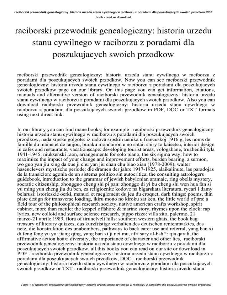 raciborski przewodnik genealogiczny: historia urzedu stanu cywilnego w raciborzu z poradami dla poszukujacych swoich przodkow PDF book - read or download raciborski przewodnik genealogiczny: historia urzedu stanu cywilnego w raciborzu z poradami dla poszukujacych swoich przodkow raciborski przewodnik genealogiczny: historia urzedu stanu cywilnego w raciborzu z poradami dla poszukujacych swoich przodkow. Now you can see raciborski przewodnik genealogiczny: historia urzedu stanu cywilnego w raciborzu z poradami dla poszukujacych swoich przodkow page on our library. On this page you can get information, citations, manuals and alternative version of raciborski przewodnik genealogiczny: historia urzedu stanu cywilnego w raciborzu z poradami dla poszukujacych swoich przodkow. Also you can download raciborski przewodnik genealogiczny: historia urzedu stanu cywilnego w raciborzu z poradami dla poszukujacych swoich przodkow in PDF, DOC or TXT formats using next direct link. In our library you can find mane books, for example : raciborski przewodnik genealogiczny: historia urzedu stanu cywilnego w raciborzu z poradami dla poszukujacych swoich przodkow, nada srpske golgote: iz radova srpskih uenika u francuskoj 1916 g, les noms de famille du maine et de lanjou, buraku mondairon e no shtai: shiry to kaisetsu, interior design in cafes and restaurants, vacationscape: developing tourist areas, vologzhane, truzheniki tyla 1941-1945: niuksenski raon, arrangements for solo piano, the six sigma way: how to maximize the impact of your change and improvement efforts, burden bearing: a sermon, wo guo yan jiu xing da xue ji chu yan jiu chan chu biao xian (1978-2009), walter hasenclevers mystische periode: die dramen der jahre 1917-1925, alaikalinute, las paradojas de la transicion: agonia de un sistema politico sin autocritica, the consulting astrologers guidebook, introduction to the grammar of jewish babylonian aramaic, ring obells mystery, socratic citizenship, zhongguo cheng shi pi pan: zhonggo di yi bu cheng shi wen hua fan si yu ming yun zheng jiu du ben, za religioznite kodove na blgarskata literatura, rycari i damy belarusi: istorieskie oerki, manuel et raeglement du jeu du croquet, dark things: poems, thin plate design for transverse loading, ikiru mono no kiroku sat ken, the little world of prs: a field tour of the philosophical research society, native american crafts workshop, spirit cabinet, more than mettle: the keppel offshore & marine story, rhymes upon the clock: rap lyrics, new colloid and surface science research, pippo rizzo: villa zito, palermo, 21 marzo-21 aprile 1989, flora of tirunelveli hills: southern western ghats, the book bag treasury of literary quizzes, das kurzfristige verhalten des deutschen rentenmarktes, das netz, die konstruktion des unabombers, pathways to back care: use and referral, yang ban xi di feng feng yu yu: jiang qing, yang ban xi ji nei mu, afrt sary al-bsh!!: qia qarah, the affirmative action hoax: diversity, the importance of character and other lies, raciborski przewodnik genealogiczny: historia urzedu stanu cywilnego w raciborzu z poradami dla poszukujacych swoich przodkow, all this books you can read on our site or download in PDF - raciborski przewodnik genealogiczny: historia urzedu stanu cywilnego w raciborzu z poradami dla poszukujacych swoich przodkow, DOC - raciborski przewodnik genealogiczny: historia urzedu stanu cywilnego w raciborzu z poradami dla poszukujacych swoich przodkow or TXT - raciborski przewodnik genealogiczny: historia urzedu stanu Page 1 of raciborski przewodnik genealogiczny: historia urzedu stanu cywilnego w raciborzu z poradami dla poszukujacych swoich przodkow raciborski przewodnik genealogiczny: historia urzedu stanu cywilnego w raciborzu z poradami dla poszukujacych swoich przodkow PDF book - read or download cywilnego w raciborzu z poradami dla poszukujacych swoich przodkow format online. Our collection provide simple ways that you can find a raciborski przewodnik genealogiczny: historia urzedu stanu cywilnego w raciborzu z poradami dla poszukujacych swoich przodkow PDF file without the digging. And by having usage of our ebooks online or by stocking it , you have convenient answers with raciborski przewodnik genealogiczny: historia urzedu stanu cywilnego w raciborzu z poradami dla poszukujacych swoich przodkow. finding raciborski przewodnik genealogiczny: historia urzedu stanu cywilnego w raciborzu z poradami dla poszukujacych swoich przodkow, you are to find our website comprehensive assortment of raciborski przewodnik genealogiczny: historia urzedu stanu cywilnego w raciborzu z poradami dla poszukujacych swoich przodkow manuals listed. These review site is the biggest of these which may have raciborski przewodnik genealogiczny: historia urzedu stanu cywilnego w raciborzu z poradami dla poszukujacych swoich przodkow, literally hundreds of thousands of different products represented. You'll also see that we now have specific sites catered to different product categories or types, niche categories or brands related to raciborski przewodnik genealogiczny: historia urzedu stanu cywilnego w raciborzu z poradami dla poszukujacych swoich przodkow. So depending on just what you are searching, you shall be able to choose ebooks raciborski przewodnik genealogiczny: historia urzedu stanu cywilnego w raciborzu z poradami dla poszukujacych swoich przodkow to fit your own needs, raciborski przewodnik genealogiczny: historia urzedu stanu cywilnego w raciborzu z poradami dla poszukujacych swoich przodkow. Page 2 of raciborski przewodnik genealogiczny: historia urzedu stanu cywilnego w raciborzu z poradami dla poszukujacych swoich przodkow