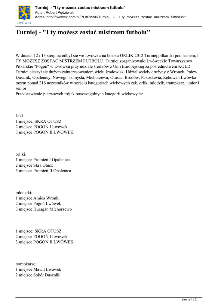 Turniej - "I ty możesz zostać mistrzem futbolu" Autor: Robert Pędziwiatr Adres: http://lwowek.com.pl/PL/87/996/Turniej__-__I_ty_mozesz_zostac_mistrzem_futbolu/k/ Turniej - "I ty możesz zostać mistrzem futbolu" W dniach 12 i 13 sierpnia odbył się we Lwówku na boisku ORLIK 2012 Turniej piłkarski pod hasłem, I TY MOŻESZ ZOSTAĆ MISTRZEM FUTBOLU. Turniej zorganizowało Lwóweckie Towarzystwo Piłkarskie "Pogoń" w Lwówku przy udziale środków z Unii Europejskiej za pośrednictwem KOLD. Turniej cieszył się dużym zainteresowaniem wielu środowisk. Udział wzięły drużyny z Wronek, Pniew, Dusznik, Opalenicy, Nowego Tomyśla, Michorzewa, Otusza, Brodów, Pakosławia, Zębowa i Lwówka razem ponad 216 uczestników w sześciu kategoriach wiekowych żak, orlik, młodzik, trampkarz, junior i senior Przedstawienie pierwszych trójek poszczególnych kategorii wiekowych: żaki 1 miejsce: SKRA OTUSZ 2 miejsce POGOŃ I Lwówek 3 miejsce POGOŃ II LWÓWEK orliki: 1 miejsce Promień I Opalenica 2 miejsce Skra Otusz 3 miejsce Promień II Opalenica młodziki: 1 miejsce Amica Wronki 2 miejsce Pogoń Lwówek 3 miejsce Huragan Michorzewo 1 miejsce: SKRA OTUSZ 2 miejsce POGOŃ I Lwówek 3 miejsce POGOŃ II LWÓWEK trampkarze: 1 miejsce Mawit Lwówek 2 miejsce Sokół Duszniki strona 1 / 2 Turniej - "I ty możesz zostać mistrzem futbolu" Autor: Robert Pędziwiatr Adres: http://lwowek.com.pl/PL/87/996/Turniej__-__I_ty_mozesz_zostac_mistrzem_futbolu/k/ 3 miejsce Błyskawica Pakosław juniorzy: 1 miejsce Pogoń Lwówek 2 miejsce Polonia Nowy Tomyśl 3 miejsce Sokół Pniewy seniorzy: 1 miejsce Bąki z Łąki NT 2 miejsce Pogoń Lwówek 3 miejsce Błyskawica Pakosław LTP Pogoń Lwówek składa serdeczne podziękowania za pomoc w zorganizowaniu Turnieju Urzędowi Miasta i Gminy we Lwówku, Ośrodkowi Sportu i Rekreacji we Lwówku. Puchary i nagrody wręczyli zawodnikom: Burmistrz Miasta i Gminy Lwówek Piotr Długosz Radny Rady Miejskiej Bartłomiej Czekała Kierownik Biura KOLD Ireneusz Witkowski Kierownik OSIR we Lwówku Paweł Kasprowicz Prezes LTP ,Pogoń, Lwówek Michał Mroczkiewicz Turniej miał na celu propagowanie piłki nożnej, znalezienie potencjalnych talentów piłkarskich oraz zachęcenie dzieci, młodzieży i dorosłych do aktywnego spędzania wolnego wśród mieszkańców miasta i Gminy Lwówek, a także rejonu KOLD. Uczestnikom dziękujemy za przybycie na boisko ORLIK 2012 a zwycięzcom poszczególnych grup wiekowych gratulujemy. strona 2 / 2 Powered by TCPDF (www.tcpdf.org)