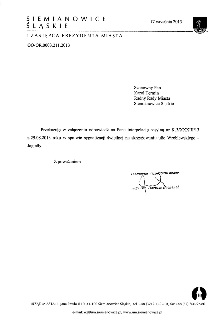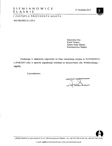 SI EM IAN OWI CE SLASKIE 17 wrzeSnia 2013 I ZASTEPCA PREZYDENTA MIASTA OO-OR.0003.21 1.2013 Szanowny Pan Karol Termin Radny Rady Miasta Siemianowice S l4skie Przekazujg w za4czeniu odpowied乞 na Pana interpelacjg sesyjn4 nr 813/XXXIII/13 z 29.08.20 13 roku w sprawie sygnalizacji g wietlnej na skrzyZowaniu ulic Wr6blewskiego 一 Jagie即. Z powaaniem ・酬01に ro" rr1に酬Rに刊n負 Ml血ot誠 *:、 b,・議r瓜元奪$:自oche匁e占 tも URZAD MIASTA ul. Jana Pawta 1110, 41-100 Siemianowice 引askie, tel. +48 (32) 760-52-04, fax +48 (32) 760-52-80 e-mail: [email protected], www.um.siemianowice.pI URZAD MIASTA SIEMIANOWICE S L SKIE Wydzi融」 nfrastpjktury I Rozwoju Miasta Reたrat Gospodarki Komunalnej 111. Michalkowicka 105 41103 SiernianowiCe 5 i ョskie Siemianowice 5 lskie 12.09.2013r OO-OR.0003.21 1.2013 Wydzial Organizacji i Obslugi Rady Miasta Referat Organizacyjny w miejscu W odpowiedzi na interpelacjq sesyjn4nr 813/XXXIH/2013 z dnia 29.08.2013 radnego Rady Miasta Pana Karola Termina, dotyczc4 sprawozdania, decyzji i uzasadnienia wykonania sygnalizacji g wietlnej na skrzyZowaniu ulic Wr6blewskiego, Jagiely oraz montau systemu kontroli drogowej na tym skrzyZowaniu informujemy Z e Referat Gospodarki Komunalnej niestety nie dysponuje j吐 materialami z posiedzeh Komisji d/s Organizacji Ruchu z okresu budowy sygnalizacji(zostaa wybrakowana zgodnie z Rozporz叩zeniem Prezesa Rady Ministrw z dnia 18.01.2011 rw sprawie instrukcji kancelaryjnej, jednolitych rzeczowych wykaz6w akt oraz instrukcji w sprawie organizacji i zakresu dziaania archiw6w zakadowych). Natomiast w za czeniu przes外amy, dla pana radnego, protokoly z posiedzeh Komisji d/s Organizacji Ruchu, dotyczce instalacji rejestrator6w przejazdu pojazd6w na czerwonym S wietle oraz zmian programu powyzszej sygnalizacji. 一 Protok61 z dnia 01.03.201 jr. 一 Protok61 z dnia 24.10.2012r. 一 Protok61 z dnia 34.01.2013r. 一 Protok61 z dnia 27.03.2013r. 一 Protok61 z dnia 29.05.2013r. 一 Protok61 z dnia 08.08.2013r. NA Wydziau Otrzymuj: 1 .Adresat x-2 ,』,さ 舞 1[T 1K 酬鵬ね Piotr Dzie刀 dziel ー一一一可 Protok61 叫 Z posiedzenia Komisji d!s Organizacji Ruchu kt6re odbylo si早 w dniu 08 sierpnia 2013r. Obecni: Zgodnie z list4 obecnogci Ustalenia: I. Komisja Po zapoznaniu siq z wnioskiem z dnia 05・ 08・ 2012r zlo2onym prze子 Miejskie Przedsi早biorstwo Gospodarki Komunalnej i Mieszkaniowej Sp. z o.o., ul. Smilowskiego 15, 41100 Siernianowice 5 lskie, dotyczcym zatwierdzenia dokumentacji projektowej ,,DOTYCZ CEJ OZANKOWANIA ROBOT W UL・ MICHALKOWICKIEJ NA ODCINKU OD UL. SPOKO取EJ DO PRZEJSCIA DLA PIESZYCH PRZED WJAZDEM NA MYJNIE SAMOCHODOWA W ZWIAZKU Z PRZYST PIENIEM DO MODERNIZACJI CHODNIKA NA TYM ODCINKU ,, -projekt czasowej organizacji ruchu, postanowila projekt zaopiniowa6 pozytywnie. 2. Po zapozn面u siq z interpelacj4 mi早dzysesyjn4nr 292/2013 z dnia 26.07.2013 radnego Rady Miasta Pana Mariana Jadwiszczoka, dotyczc4 wytyczenia dw6ch przejg6 dla pieszych na ul. Stawowej, Komisja po przeanalizowaniu tematu, powyZszy wniosek zaopiniowala pozytywnie w czqgci dotyczcej wytyczenia przejgcia dla pieszych na ul. Stawowej od strony ul. Orzeszkowej. Natomiast wniosek dot. wytyczenia przejgcia dla pieszych w rejonie s虹zyZowania ul. Stawowej z ul. Wyzwolenia Komisja zaopiniowala negatywnie . Ulice Stawowa i Wyzwolenia, na tym odcinku, to ulice wewntrzosiedlowe o uspokojonym ruchu. 3・ Komisja po z叩oznaniu siq z z tregciapisma SMF/PA!1674/2013 z dnia 25・ 07.201 3r. zloZonego przez Sp6ldzielniq Mieszkaniow4 Fabud, ul. Kapicy 3, 4 1-100 Siemianowice Si耶kie, stwierdzila koniecznog6 przeprowadzenia konsultacji, na temat problem6w poruszonych w pigmie, z przedstawicielami Sp6ldzielni Mieszkaniowej,,FABUD". 4. Po zapoznaniu siq z interpelacj4 miqdzysesyjn4 nr 291/2013 z dnia 26.07.2013 radnego Rady Miasta Pana Mariana Jadwiszczoka, dotyczc4 叩rowadzenia ograniczenia ruchu dla samochod6w o masie powyZej 3,5 t na ul. Olimpijskiej, Komisja, Po przeanalizowaniu tematu, Po町Zszy wniosek zaopiniowaa negatywnie. Wprowadzenie takiego ograniczenia moglo by mie6 negatywny wplyw na dzialalnog6 firm majcych siedziby w tym rejonie a ponadto, zgodnie z przedstawion4 opini4 Policji, nie odnotowano na tym obszarze Z adnych zdarzeh drogowych . ・ 5. Komisja po zapoznaniu siマ z wnioskiem z dnia 22.07.2013r オoZonym przez Przedsi早biorstwo Wielobranzowe 、、 KANAD" Jerzy Namyslowski, ul. Kwiatowa 10, 41-902 Bytom, dotyczcym zatwierdzenia dokumentacji,,PROJEKT ZMIAN PROGRAMU SYGNALIZACJI SWIETLNEJ NA SKRZYZOWANIU 旦L・ WROBLEWSKIEGO Z UL・ JAGIELLY I UL・ GRUNWALDZK W SIEMIANOWICACH SLASKICH ,, -projekt docelowej organizacji ruchu, wniosek zaopiniowaa pozytywnie. 6. Po ponownym przeanalizowaniu interpelacji mi早dzysesyjnej nr 281/2013 z dnia 14.06.2013 radnych Rady Miasta Pana Stefana Wieczorka oraz Pana Grzegorza Jurkiewicza, dotyczc4 zmiany organizacji ruchu, wzdluZ budynk6w na ul. Wルwolenia9i 11, Komisja, z uwagi na skomplikowany, uklad ruchu drogowego tego obszaru oraz koniecznogd wykonania aktualizacji dokumentacji projektowej umo之liwiajcej modernizacjq przedmiotowego parkingu w chwili obecnej nie widzi mo之liwogci wprowadzenia zmian w organizacji ruchu w tym rejonie. JednakZe w zwizku z planowanymi konsultacjami z przedstawicielami SM Fabud, miqdzy innymi dotyczcymi tego problemu, temat ten b早dzie nadal analizowany. 左 -27. Komisja po zapoznaniu si早 z wnioskiem dotyczcym likwidacji oznakowania przejazdu kolejowego na al. Spacerowej w zwizku z likwidacj4 tego przejazdu wniosek opini可e pozytywnie. 言 」 叫 〔 8. Po przeanalizowaniu wniosku zawartego w mailu z dnia 26.07.2013r przeslanym przez Pana Janusz L aweckiego dotyczcego zamontowania progu zwalniajcego na ul. Fabrycznej, Komisja, powyZszy wniosek zaopiniowala negatywnie. Obowizujce przepisy zabraniaj4 montau prog6w zwalniajcych na ulicach na kt6rych poruszaj4 si早 pojazdy komunikacji publicznej 9. Komisja DO zapoznaniu sic z wnioskiem zawa