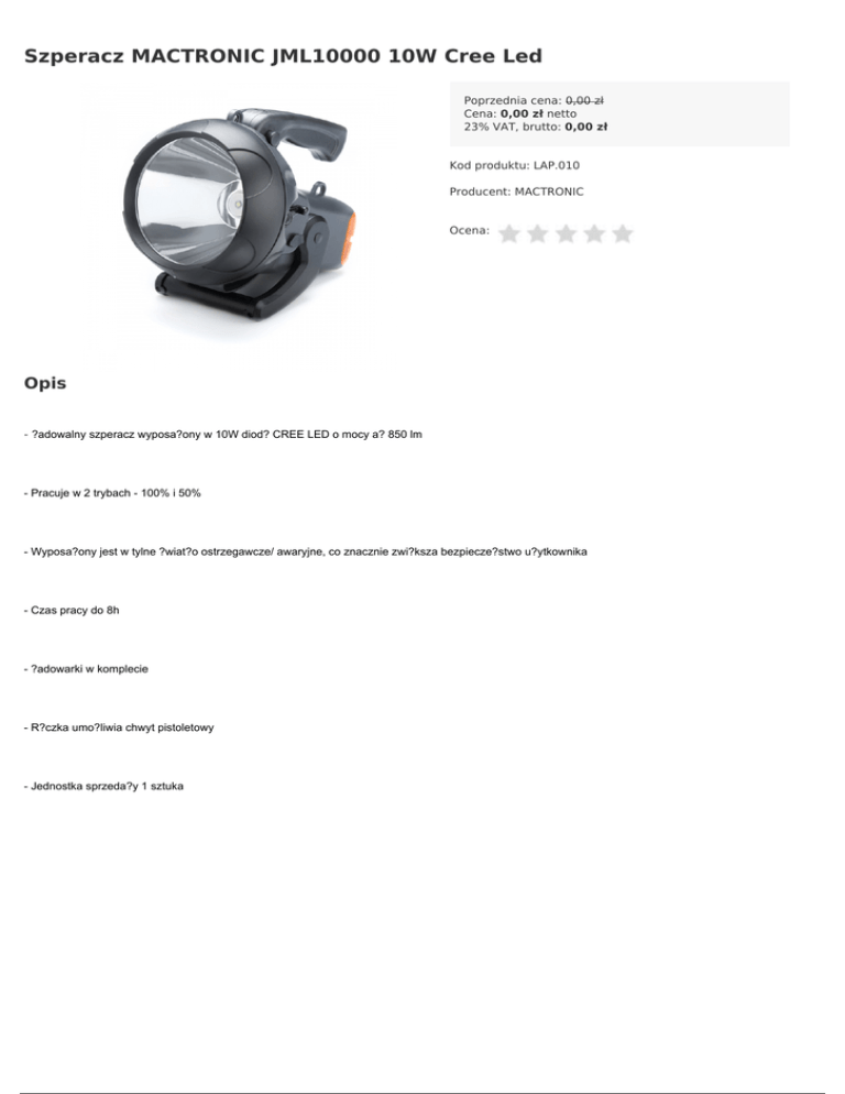 Szperacz MACTRONIC JML10000 10W Cree Led Poprzednia cena: 0,00 zł Cena: 0,00 zł netto 23% VAT, brutto: 0,00 zł Kod produktu: LAP.010 Producent: MACTRONIC Ocena: Opis - ?adowalny szperacz wyposa?ony w 10W diod? CREE LED o mocy a? 850 lm - Pracuje w 2 trybach - 100% i 50% - Wyposa?ony jest w tylne ?wiat?o ostrzegawcze/ awaryjne, co znacznie zwi?ksza bezpiecze?stwo u?ytkownika - Czas pracy do 8h - ?adowarki w komplecie - R?czka umo?liwia chwyt pistoletowy - Jednostka sprzeda?y 1 sztuka Powered by TCPDF (www.tcpdf.org)