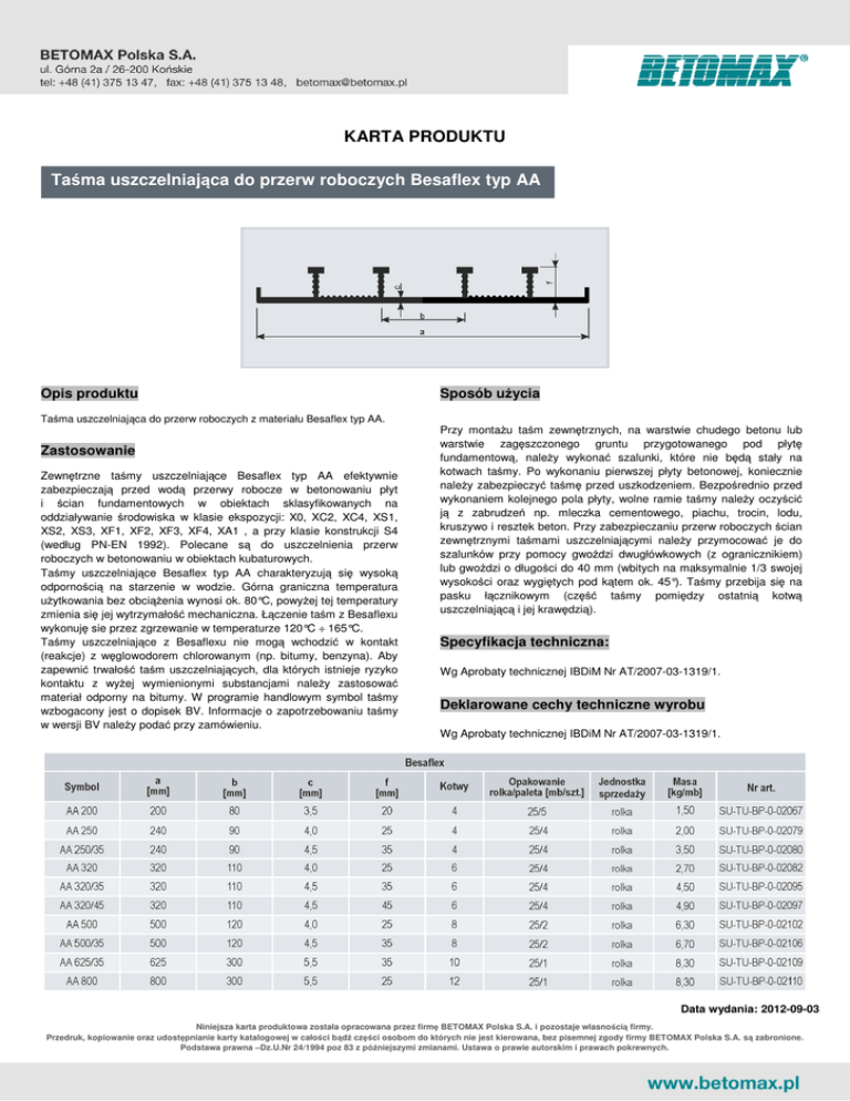 KARTA PRODUKTU Taśma uszczelniająca do przerw roboczych Besaflex typ AA Opis produktu Sposób użycia Taśma uszczelniająca do przerw roboczych z materiału Besaflex typ AA. Zastosowanie Zewnętrzne taśmy uszczelniające Besaflex typ AA efektywnie zabezpieczają przed wodą przerwy robocze w betonowaniu płyt i ścian fundamentowych w obiektach sklasyfikowanych na oddziaływanie środowiska w klasie ekspozycji: X0, XC2, XC4, XS1, XS2, XS3, XF1, XF2, XF3, XF4, XA1 , a przy klasie konstrukcji S4 (według PN-EN 1992). Polecane są do uszczelnienia przerw roboczych w betonowaniu w obiektach kubaturowych. Taśmy uszczelniające Besaflex typ AA charakteryzują się wysoką odpornością na starzenie w wodzie. Górna graniczna temperatura użytkowania bez obciążenia wynosi ok. 80°C, powyżej tej temperatury zmienia się jej wytrzymałość mechaniczna. Łączenie taśm z Besaflexu wykonuję sie przez zgrzewanie w temperaturze 120°C ÷ 165°C. Taśmy uszczelniające z Besaflexu nie mogą wchodzić w kontakt (reakcje) z węglowodorem chlorowanym (np. bitumy, benzyna). Aby zapewnić trwałość taśm uszczelniających, dla których istnieje ryzyko kontaktu z wyżej wymienionymi substancjami należy zastosować materiał odporny na bitumy. W programie handlowym symbol taśmy wzbogacony jest o dopisek BV. Informacje o zapotrzebowaniu taśmy w wersji BV należy podać przy zamówieniu. Przy montażu taśm zewnętrznych, na warstwie chudego betonu lub warstwie zagęszczonego gruntu przygotowanego pod płytę fundamentową, należy wykonać szalunki, które nie będą stały na kotwach taśmy. Po wykonaniu pierwszej płyty betonowej, koniecznie należy zabezpieczyć taśmę przed uszkodzeniem. Bezpośrednio przed wykonaniem kolejnego pola płyty, wolne ramie taśmy należy oczyścić ją z zabrudzeń np. mleczka cementowego, piachu, trocin, lodu, kruszywo i resztek beton. Przy zabezpieczaniu przerw roboczych ścian zewnętrznymi taśmami uszczelniającymi należy przymocować je do szalunków przy pomocy gwoździ dwugłówkowych (z ogranicznikiem) lub gwoździ o długości do 40 mm (wbitych na maksymalnie 1/3 swojej wysokości oraz wygiętych pod kątem ok. 45°). Taśmy przebija się na pasku łącznikowym (część taśmy pomiędzy ostatnią kotwą uszczelniającą i jej krawędzią). Specyfikacja techniczna: Wg Aprobaty technicznej IBDiM Nr AT/2007-03-1319/1. Deklarowane cechy techniczne wyrobu Wg Aprobaty technicznej IBDiM Nr AT/2007-03-1319/1. Data wydania: 2012-09-03 Niniejsza karta produktowa została opracowana przez firmę BETOMAX Polska S.A. i pozostaje własnością firmy. Przedruk, kopiowanie oraz udostępnianie karty katalogowej w całości bądź części osobom do których nie jest kierowana, bez pisemnej zgody firmy BETOMAX Polska S.A. są zabronione. Podstawa prawna –Dz.U.Nr 24/1994 poz 83 z późniejszymi zmianami. Ustawa o prawie autorskim i prawach pokrewnych.