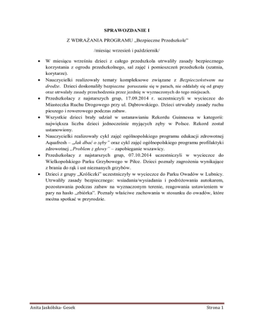 SPRAWOZDANIE I Z WDRAŻANIA PROGRAMU „Bezpieczne Przedszkole” /miesiąc wrzesień i październik/ W miesiącu wrześniu dzieci z całego przedszkola utrwaliły zasady bezpiecznego korzystania z ogrodu przedszkolnego, sal zajęć i pomieszczeń przedszkola (szatnia, korytarze). Nauczycielki realizowały tematy kompleksowe związane z Bezpieczeństwem na drodze. Dzieci doskonaliły bezpieczne poruszanie się w parach, nie oddalały się od grupy oraz utrwalały zasady przechodzenia przez jezdnię w wyznaczonych do tego miejscach. Przedszkolacy z najstarszych grup, 17.09.2014 r. uczestniczyli w wycieczce do Miasteczka Ruchu Drogowego przy ul. Dąbrowskiego. Dzieci utrwalały zasady ruchu pieszego i rowerowego podczas zabaw. Wszystkie dzieci brały udział w ustanawianiu Rekordu Guinnessa w kategorii: największa liczba dzieci jednocześnie myjących zęby w Polsce. Rekord został ustanowiony. Nauczycielki realizowały cykl zajęć ogólnopolskiego programu edukacji zdrowotnej Aquafresh – „Jak dbać o zęby” oraz cykl zajęć ogólnopolskiego programu profilaktyki zdrowotnej „Problem z głowy” – zapobieganie wszawicy. Przedszkolacy z najstarszych grup, 07.10.2014 uczestniczyli w wycieczce do Wielkopolskiego Parku Grzybowego w Piłce. Dzieci poznały zagrożenia wynikające z brania do rąk i ust nieznanych grzybów. Dzieci z grupy „Króliczki” uczestniczyły w wycieczce do Parku Owadów w Lubnicy. Utrwaliły zasady bezpiecznego: wsiadania/wysiadania i podróżowania autokarem, pozostawania podczas zabaw na wyznaczonym terenie, reagowania ustawieniem w pary na hasło „zbiórka”. Poznały właściwe zachowania w stosunku do owadów, które można spotkać w przyrodzie. Anita Jaskólska- Gesek Strona 1