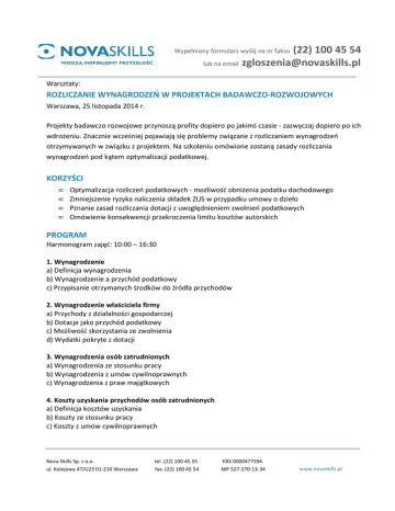 (22) 100 45 54 lub na email [email protected] Wypełniony formularz wyślij na nr faksu Warsztaty: ROZLICZANIE WYNAGRODZEŃ W PROJEKTACH BADAWCZO-ROZWOJOWYCH Warszawa, 25 listopada 2014 r. Projekty badawczo rozwojowe przynoszą profity dopiero po jakimś czasie - zazwyczaj dopiero po ich wdrożeniu. Znacznie wcześniej pojawiają się problemy związane z rozliczaniem wynagrodzeń otrzymywanych w związku z projektem. Na szkoleniu omówione zostaną zasady rozliczania wynagrodzeń pod kątem optymalizacji podatkowej. KORZYŚCI • • • • Optymalizacja rozliczeń podatkowych - możliwość obniżenia podatku dochodowego Zmniejszenie ryzyka naliczenia składek ZUS w przypadku umowy o dzieło Pznanie zasad rozliczania dotacji z uwzględnieniem zwolnień podatkowych Omówienie konsekwencji przekroczenia limitu kosztów autorskich PROGRAM Harmonogram zajęć: 10:00 – 16:30 1. Wynagrodzenie a) Definicja wynagrodzenia b) Wynagrodzenie a przychód podatkowy c) Przypisanie otrzymanych środków do źródła przychodów 2. Wynagrodzenie właściciela firmy a) Przychody z działalności gospodarczej b) Dotacje jako przychód podatkowy c) Możliwość skorzystania ze zwolnienia d) Wydatki pokryte z dotacji 3. Wynagrodzenia osób zatrudnionych a) Wynagrodzenia ze stosunku pracy b) Wynagrodzenia z umów cywilnoprawnych c) Wynagrodzenia z praw majątkowych 4. Koszty uzyskania przychodów osób zatrudnionych a) Definicja kosztów uzyskania b) Koszty ze stosunku pracy c) Koszty z umów cywilnoprawnych Nova Skills Sp. z o.o. ul. Kolejowa 47/U23 01-210 Warszawa tel. (22) 100 45 55 fax. (22) 100 45 54 KRS 0000477594 NIP 527-270-13-34 www.novaskills.pl (22) 100 45 54 lub na email [email protected] Wypełniony formularz wyślij na nr faksu 5. Rozliczanie honorariów autorskich a) Prawa autorskie b) Utwór i jego twórca c) Koszty autorskie a źródła przychodów d) Limit kosztów autorskich - kara za twórczość? e) Obowiązki płatnika związane z limitem f) Optymalizacja strat związanych z przekroczeniem limitu 6. Umowa o dzieło z prawami autorskimi a) Honorarium z umowy o dzieło z prawami autorskimi a źródło przychodów b) Dopuszczalność zawierania umowy o dzieło c) Umowa o dzieło na celowniku ZUS - jak się bronić przed składka EKSPERT: PAWEŁ ZIÓŁKOWSKI - prawnik, trener, publicysta, konsultant Posiada kilkunastoletnie doświadczenie zawodowe w zakresie tematyki prawnej. Od 2000 r. wykonuje działalność gospodarczą w zakresie konsultingu, w ramach której pomaga zakładać, prowadzić i likwidować inne firmy. Autor ponad 10.000 publikacji w prasie fachowej i portalach elektronicznych. Zrealizował ponad 900 szkoleń o tematyce prawnej. Prowadzi zajęcia dla słuchaczów studiów podyplomowych Zarządzanie Zespołem Sprzedaży (Akademia Leona Koźmińskiego w Warszawie), Kadry i Płace - Prawo i Praktyka Gospodarcza (GWSH w Katowicach) oraz na Studiach Podyplomowych Rachunkowości i Podatków (Uniwersytet Ekonomiczny w Poznaniu). Specjalizuje się w podatkach, prawie pracy i prawie działalności gospodarczej. Nova Skills Sp. z o.o. ul. Kolejowa 47/U23 01-210 Warszawa tel. (22) 100 45 55 fax. (22) 100 45 54 KRS 0000477594 NIP 527-270-13-34 www.novaskills.pl (22) 100 45 54 lub na email [email protected] Wypełniony formularz wyślij na nr faksu DANE UCZESTNIKÓW 1 osoba Imię i Nazwisko FORMULARZ ZGŁOSZENIOWY Telefon Warsztaty: ROZLICZANIE WYNAGRODZEŃ W PROJEKTACH BADAWCZO-ROZWOJOWYCH Warszawa, 25 listopada 2014 r. 2 osoba Golden Floor Millenium Plaza Stanowisko Email Imię i Nazwisko 550.00 PLN + VAT (do 18 listopada 2014 r.) 690.00 PLN + VAT (od 19 listopada 2014 r.) Stanowisko Email Telefon 3 osoba W ramach uczestnictwa zapewniamy również: materiały drukowane, lunch bufet, nielimitowany bufet kawowy (kawa, herbata, soki, woda, ciastka, owoce) oraz certyfikat ukończenia szkolenia. Imię i Nazwisko Stanowisko Email Telefon DANE OSOBY ZGŁASZAJĄCEJ (DO KONTAKTU) Imię i Nazwisko Stanowisko Email 2. Po otrzymaniu formularza zgłoszeniowego najpóźniej na 7 dni przed szkoleniem prześlemy Państwu oficjalne potwierdzenie uczestnictwa w szkoleniu na adres e-mail osoby do kontaktu wskazanej w formularzu. Telefon DANE FIRMY Nazwa Adres NIP Telefon/fax □ Oświadczam, że zapoznałem się z Regulaminem określającym warunkami uczestnictwa i akceptuję zobowiązanie do zapłaty całości kwot wynikających z niniejszego zgłoszenia. Jednocześnie oświadczam, że jestem osobą upoważnioną do zaciągania wynikających z niniejszego zgłoszenia zobowiązań wobec Nova Skills sp. z o.o. □ Zgodnie z ustawą z dnia 29 sierpnia 1997 r. o ochronie danych osobowych (Dz.U. 1997r. Nr 133 poz. 833) Nova Skills sp. z o. o. z siedzibą w Warszawie (dalej NS), informuje, że jest administratorem danych osobowych. Wyrażam zgodę na przetwarzanie danych osobowych w celach promocji i marketingu działalności prowadzonej przez NS, świadczonych usług oraz oferowanych produktów, a także w celu promocji ofert klientów i partnerów NS. Zgodnie z ustawą z dnia 18.07.2002 r. (Dz. Ust. 144 poz. 1204) o świadczeniu usług drogą elektroniczną wyrażamy zgodę na otrzymywanie drogą elektroniczną ofert oraz informacji handlowych dotyczących NS oraz partnerów i klientów NS. Wyrażającemu zgodę na przetwarzanie danych osobowych przysługuje prawo kontroli przetwarzania danych, które jej dotyczą, w tym także prawo ich poprawiania. □ Zgodnie z §3 rozporządzenia Ministra Finansów z dnia 17 grudnia 2010 r. w sprawie przesyłania faktur w formie elektronicznej, zasad przechowywania oraz trybu udostępniania organowi podatkowemu lub organowi kontroli skarbowej (Dz. U. z 2010 r. Nr 249 poz. 1661), oświadczam, iż zgadzam się na wystawianie oraz przesyłanie mi faktur elektronicznych na adres e-mail księgowości wskazany w formularzu zgłoszeniowym. Nova Skills Sp. z o.o. ul. Kolejowa 47/U23 01-210 Warszawa REGULAMIN ZGŁOSZENIA 1. Warunkiem uczestnictwa w szkoleniu jest przesłanie