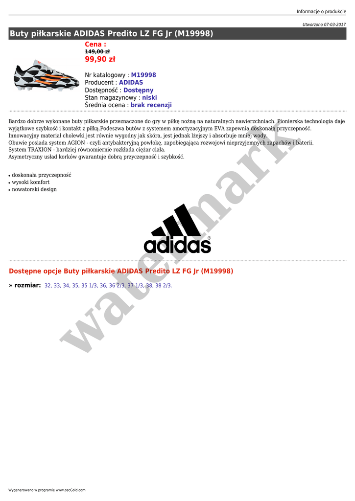 Informacje o produkcie Utworzono 07-03-2017 Buty piłkarskie ADIDAS Predito LZ FG Jr (M19998) Cena : 149,00 zł 99,90 zł Nr katalogowy : M19998 Producent : ADIDAS Dostępność : Dostępny Stan magazynowy : niski Średnia ocena : brak recenzji ● ● ● doskonała przyczepność wysoki komfort nowatorski design er m ar k Bardzo dobrze wykonane buty piłkarskie przeznaczone do gry w piłkę nożną na naturalnych nawierzchniach. Pionierska technologia daje wyjątkowe szybkość i kontakt z piłką.Podeszwa butów z systemem amortyzacyjnym EVA zapewnia doskonałą przyczepność. Innowacyjny materiał cholewki jest równie wygodny jak skóra, jest jednak lżejszy i absorbuje mniej wody. Obuwie posiada system AGION - czyli antybakteryjną powłokę, zapobiegająca rozwojowi nieprzyjemnych zapachów i baterii. System TRAXION - bardziej równomiernie rozkłada ciężar ciała. Asymetryczny usład korków gwarantuje dobrą przyczepność i szybkość. Dostępne opcje Buty piłkarskie ADIDAS Predito LZ FG Jr (M19998) w at » rozmiar: 32, 33, 34, 35, 35 1/3, 36, 36 2/3, 37 1/3, 38, 38 2/3. Wygenerowano w programie www.oscGold.com