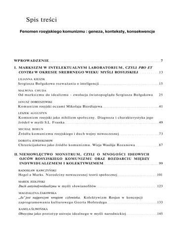 Spis treści Fenomen rosyjskiego komunizmu : geneza, konteksty, konsekwencje WPROWADZENIE I. MARKSIZM W INTELEKTUALNYM LABORATORIUM, CZYLI PRO ET CONTRA W OKRESIE SREBRNEGO WIEKU MYŚLI ROSYJSKIEJ 7 13 LILIANNA KIEJZIK Sergiusza Bułgakowa rozważania o inteligencji 15 MALWINA CHUDA Od marksizmu do idealizmu - ewolucja światopoglądu Sergiusza Bułgakowa 25 JANUSZ DOBEESZEWSKI K o m u n i z m rosyjski oczami Mikołaja Bierdiajewa 41 LESZEK AUGUSTYN K o m u n i z m rosyjski jako nihilizm społeczny. Diagnoza i charakterystyka jego źródeł w myśli S.L. Franka 49 MICHAŁ BOHUN Źródła k o m u n i z m u rosyjskiego i d u c h wojny nowoczesnej 73 DOROTA JEWDOKIMOW Chrześcijaństwo jako źródło k o m u n i z m u . Wizja Wasilija Rozanowa II. NIEMOWLĘCTWO MONSTRUM, CZYLI O MNOGOŚCI IDEOWYCH OJCÓW ROSYJSKIEGO KOMUNIZMU ORAZ ROZDARCIU MIĘDZY INDYWIDUALIZMEM I KOLEKTYWIZMEM 87 99 RADOSŁAW KAWCZYŃSKI Hegel a Marks. N a r o d z i n y nowoczesnej teorii społecznej 101 MAREK JEDLIŃSKI Duch antyindywidualizmu w myśli słowianofilów 123 MAGDALENA ŻAKOWSKA „Ja" jest najgorszym wrogiem człowieka. Kolektywizm Rosjan w koncepcji zaprogramowania kulturowego Geerta Hofstedego 133 KAMILA ŚLIWIŃSKA Obszczina jako p r o t o t y p ustroju idealnego w myśli narodnickiej 145 BARTOSZ HORDECKI Konserwatywny r o m a n t y z m - źródło k o m u n i z m u rosyjskiego? 151 ANNA KURKIEWICZ Dialektyka prawdy w rosyjskim i m p e r i u m III. M O N S T R U M ROZSZALAŁE, CZYLI O DESTRUKTYWNYM WPŁYWIE KOMUNIZMU NA KULTURĘ 165 175 MONIKA POPOW Ci, którzy Torę zamienili na Manifest Komunistyczny - portrety żydowskich k o m u n i s t ó w w rosyjskiej literaturze żydowskiej 177 AGATA DOLACIŃSKA Literatura wobec k o m u n i z m u . W p ł y w systemu na losy i twórczość rosyjskich pisarzy i poetów 185 KAROLINA MAZUREK Rosyjski Kościół Prawosławny a rewolucja bolszewicka 205 PAULINA CYNALEWSKA-KUCZMA Straty w rosyjskiej architekturze cerkiewnej w okresie k o m u n i z m u 215 ANNA KURKOWIAK Polityka antyreligijna Rosji Radzieckiej i ZSRR w latach 1918-1991 IV. MARKSIZM ZAFAŁSZOWANY, CZYLI O WYPACZANIU IDEI 227 241 OLGA NADSKAKUŁA Socjalizm w j e d n y m kraju - znacjonalizowany k o m u n i z m w ojczyźnie internacjonalizmu 243 ANDRZEJ W. NOWAK K o m u n i z m a ambiwalencje nowoczesności 259 IVAN PESHKOV Razem i osobno. Harbiński głos w debacie n a d azjatyckim sposobem produkcji 269 V. POLSCY MYŚLICIELE O MARKSIZMIE I ROSYJSKIM KOMUNIZMIE... 279 EDWARD JELIŃSKI Rewolucja rosyjska a polska myśl socjalistyczna (na wybranych przykładach) 281 MAREK FIGURA Studnicki o Rosji i rosyjskim k o m u n i z m i e 293