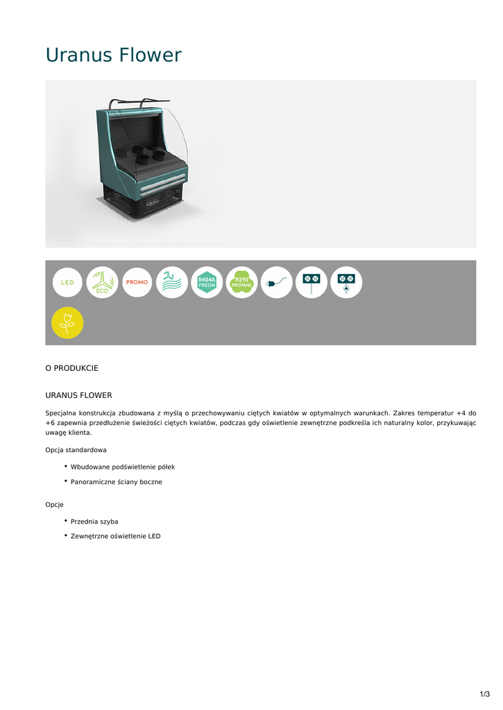 Uranus Flower O PRODUKCIE URANUS FLOWER Specjalna konstrukcja zbudowana z myślą o przechowywaniu ciętych kwiatów w optymalnych warunkach. Zakres temperatur +4 do +6 zapewnia przedłużenie świeżości ciętych kwiatów, podczas gdy oświetlenie zewnętrzne podkreśla ich naturalny kolor, przykuwając uwagę klienta. Opcja standardowa Wbudowane podświetlenie półek Panoramiczne ściany boczne Opcje Przednia szyba Zewnętrzne oświetlenie LED 1/3 RYSUNKI Notice: Undefined variable: page_id in /home/frrcom/domains/freor.com/public_html/wpcontent/themes/freor/pdftempalte.php on line 179 2/3 SPECYFIKACJE TECHNICZNE Model Uranus Flower Długość z bokami temperatura C (+25 C, 60 % RH) Obszar ekspozycji Оbjętość m² m³ V H1 ( 1/ 10 °C) 0.25 230 H1 ( 1/ 10 °C) 0.33 230 mm H1 1014 1330 Napicie znamionowe 3/3
