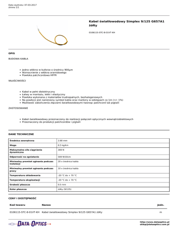 Data wydruku: 07-03-2017 strona 1/1 Kabel światłowodowy Simplex 9/125 G657A1 żółty 0106115-STC-8-01VT-KH OPIS BUDOWA KABLA Jedno włókno w buforze o średnicy 900µm Wzmocnienie z włókna aramidowego Powłoka patchcordowa HFFR WŁAŚCIWOŚCI Kabel w pełni dielektryczny Łatwy w montażu, lekki i elastyczny Powłoka wykonana z materiałów trudnopalnych, bezhalogenowych Na powłoce jest naniesiony symbol kabla oraz markery w odstępach co 1m (+/- 1%) Możliwość zakończenia złączami światłowodowymi tworząc patchcord lub pigtaili ZASTOSOWANIE Kabel światłowodowy przeznaczony do realizacji połączeń optycznych wewnątrzobiektowych Przeznaczony do produkcji patchcordów i pigtaili DANE TECHNICZNE Średnica zewnętrzna 2.80 mm Waga 6.5 kg/km Maksymalna siła ciągnienia dynamiczna 300 N Odporność na zgniatanie 500 N/10cm Minimalny promień zginania podczas instalacji 20 x średnica kabla Minimalny promień zginania podczas pracy 10 x średnica kabla Temperatura składowania -20 °C do + 70 °C Temperatura eksploatacji -20 °C do + 70 °C Grubość płaszcza 0.5 mm Kolor płaszcza żółty (9/125) CENY I DOSTĘPNOŚĆ Kod towaru Nazwa 0106115-STC-8-01VT-KH Kabel światłowodowy Simplex 9/125 G657A1 żółty Jedn. m http://www.dataoptics.pl [email protected] Powered by TCPDF (www.tcpdf.org)