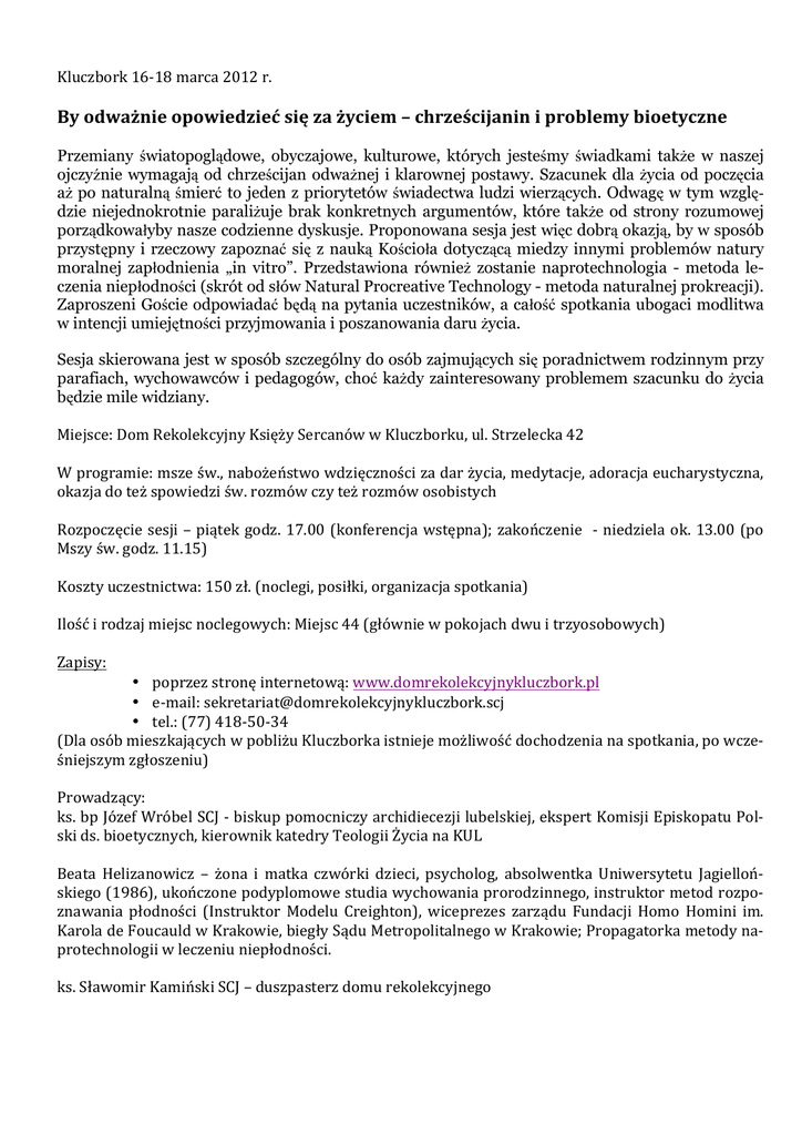 Kluczbork 16-‐18 marca 2012 r. By odważnie opowiedzieć się za życiem – chrześcijanin i problemy bioetyczne Przemiany światopoglądowe, obyczajowe, kulturowe, których jesteśmy świadkami także w naszej ojczyźnie wymagają od chrześcijan odważnej i klarownej postawy. Szacunek dla życia od poczęcia aż po naturalną śmierć to jeden z priorytetów świadectwa ludzi wierzących. Odwagę w tym względzie niejednokrotnie paraliżuje brak konkretnych argumentów, które także od strony rozumowej porządkowałyby nasze codzienne dyskusje. Proponowana sesja jest więc dobrą okazją, by w sposób przystępny i rzeczowy zapoznać się z nauką Kościoła dotyczącą miedzy innymi problemów natury moralnej zapłodnienia „in vitro”. Przedstawiona również zostanie naprotechnologia - metoda leczenia niepłodności (skrót od słów Natural Procreative Technology - metoda naturalnej prokreacji). Zaproszeni Goście odpowiadać będą na pytania uczestników, a całość spotkania ubogaci modlitwa w intencji umiejętności przyjmowania i poszanowania daru życia. Sesja skierowana jest w sposób szczególny do osób zajmujących się poradnictwem rodzinnym przy parafiach, wychowawców i pedagogów, choć każdy zainteresowany problemem szacunku do życia będzie mile widziany. Miejsce: Dom Rekolekcyjny Księży Sercanów w Kluczborku, ul. Strzelecka 42 W programie: msze św., nabożeństwo wdzięczności za dar życia, medytacje, adoracja eucharystyczna, okazja do też spowiedzi św. rozmów czy też rozmów osobistych Rozpoczęcie sesji – piątek godz. 17.00 (konferencja wstępna); zakończenie -‐ niedziela ok. 13.00 (po Mszy św. godz. 11.15) Koszty uczestnictwa: 150 zł. (noclegi, posiłki, organizacja spotkania) Ilość i rodzaj miejsc noclegowych: Miejsc 44 (głównie w pokojach dwu i trzyosobowych) Zapisy: • poprzez stronę internetową: www.domrekolekcyjnykluczbork.pl • e-‐mail: [email protected] • tel.: (77) 418-‐50-‐34 (Dla osób mieszkających w pobliżu Kluczborka istnieje możliwość dochodzenia na spotkania, po wcze-‐ śniejszym zgłoszeniu) Prowadzący: ks. bp Józef Wróbel SCJ -‐ biskup pomocniczy archidiecezji lubelskiej, ekspert Komisji Episkopatu Pol-‐ ski ds. bioetycznych, kierownik katedry Teologii Życia na KUL Beata Helizanowicz – żona i matka czwórki dzieci, psycholog, absolwentka Uniwersytetu Jagielloń-‐ skiego (1986), ukończone podyplomowe studia wychowania prorodzinnego, instruktor metod rozpo-‐ znawania płodności (Instruktor Modelu Creighton), wiceprezes zarządu Fundacji Homo Homini im. Karola de Foucauld w Krakowie, biegły Sądu Metropolitalnego w Krakowie; Propagatorka metody na-‐ protechnologii w leczeniu niepłodności. ks. Sławomir Kamiński SCJ – duszpasterz domu rekolekcyjnego