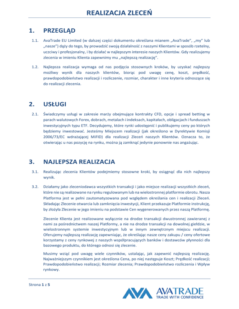 REALIZACJA ZLECEŃ 1. PRZEGLĄD 1.1. AvaTrade EU Limited (w dalszej części dokumentu określana mianem „AvaTrade”, „my” lub „nasze”) dąży do tego, by prowadzić swoją działalność z naszymi Klientami w sposób rzetelny, uczciwy i profesjonalny, i by działać w najlepszym interesie naszych Klientów. Gdy realizujemy zlecenia w imieniu Klienta zapewnimy mu „najlepszą realizację”. 1.2. Najlepsza realizacja wymaga od nas podjęcia stosownych kroków, by uzyskać najlepszy możliwy wynik dla naszych klientów, biorąc pod uwagę cenę, koszt, prędkość, prawdopodobieństwo realizacji i rozliczenie, rozmiar, charakter i inne kryteria odnoszące się do realizacji zlecenia. 2. 2.1. 3. USŁUGI Świadczymy usługi w zakresie marży obejmujące kontrakty CFD, opcje i spread betting w parach walutowych Forex, dobrach, metalach i indeksach, kapitałach, obligacjach i funduszach inwestycyjnych typu ETF. Decydujemy, które rynki udostępnić i publikujemy ceny po których będziemy inwestować. Jesteśmy Miejscem realizacji (jak określono w Dyrektywie Komisji 2006/73/EC wdrażającej MiFID) dla realizacji Zleceń naszych Klientów. Oznacza to, że otwierając u nas pozycję na rynku, można ją zamknąć jedynie ponownie nas angażując. NAJLEPSZA REALIZACJA 3.1. Realizując zlecenia Klientów podejmiemy stosowne kroki, by osiągnąć dla nich najlepszy wynik. 3.2. Działamy jako zleceniodawca wszystkich transakcji i jako miejsce realizacji wszystkich zleceń, które nie są realizowane na rynku regulowanym lub na wielostronnej platformie obrotu. Nasza Platforma jest w pełni zautomatyzowana pod względem określania cen i realizacji Zleceń. Składając Zlecenie otwarcia lub zamknięcia inwestycji, Klient przekazuje Platformie instrukcję, by złożyła Zlecenie w jego imieniu na podstawie Cen wygenerowanych przez naszą Platformę. Zlecenie Klienta jest realizowane wyłącznie na drodze transakcji dwustronnej zawieranej z nami za pośrednictwem naszej Platformy, a nie na drodze transakcji na dowolnej giełdzie, w wielostronnym systemie inwestycyjnym lub w innym zewnętrznym miejscu realizacji. Oferujemy najlepszą realizację zapewniając, że określając nasze ceny zakupu / ceny ofertowe korzystamy z ceny rynkowej z naszych współpracujących banków i dostawców płynności dla bazowego produktu, do którego odnosi się zlecenie. Musimy wziąć pod uwagę wiele czynników, ustalając, jak zapewnić najlepszą realizację. Najważniejszym czynnikiem jest określona Cena, po niej następuje Koszt; Prędkość realizacji; Prawdopodobieństwo realizacji; Rozmiar zlecenia; Prawdopodobieństwo rozliczenia i Wpływ rynkowy. Strona 1 z 5 REALIZACJA ZLECEŃ a) Cena: Dla każdego instrumentu finansowego podamy dwie ceny: wyższą cenę (ASK), po której Klient może kupić (otworzyć długą pozycję) taki instrument oraz niższą (BID) po której Klient może go sprzedać (otworzyć krótką pozycję). Nasza cena dla danego instrumentu finansowego jest obliczana w odniesieniu do ceny odpowiedniego bazowego waloru, którą uzyskamy z zewnętrznych źródeł referencyjnych stron trzecich. Wszystkie ceny znajdują się na naszych platformach inwestycyjnych. Ceny aktualizujemy z taką częstotliwością, na jaką pozwalają nam ograniczenia technologiczne i połączenia komunikacyjne. Stale przeglądamy źródła referencyjne stron trzecich, by się upewnić, że uzyskane dane w dalszym ciągu są konkurencyjne. Jeżeli cena osiągnie zlecenie określone przez klienta, czyli: Zamknij na poziomie cięcia strat, Zamknij na poziomie zysku, Krocząca cena zamknięcia, Zlecenie rynkowe lub Zlecenie z limitem ceny te zlecenia są natychmiastowo realizowane. Jednak, zgodnie z niektórymi warunkami inwestycyjnymi, realizacja zleceń (Zamknij na poziomie cięcia strat, Zamknij na poziomie zysku, Krocząca cena zamknięcia, Zlecenie rynkowe, Zlecenie z limitem ceny) po cenie Klienta może być niemożliwa. W takim przypadku zlecenie zostanie zrealizowane po pierwszej dostępnej cenie. b) Koszt: Nasze spready dotyczące ceny kupna i sprzedaży określane są na podstawie cen podanych przez naszych dostawców płynności. AvaTrade chce oferować konkurencyjne spready odnoszące się do rynków, a różnice w spreadach odzwierciedlają zmienność związaną z odpowiednim instrumentem bazowym. Spready odnoszące się do naszych produktów opisane są na stronie Warunki i opłaty inwestycyjne. Poza otwieraniem pozycji Klient może zostać zobligowany do zapłaty opłat finansowych, których kwota również podana jest na naszej stronie. c) Prędkość realizacji: Kładziemy duży nacisk na realizację Zleceń Klienta i dążymy do tego, by oferować dużą prędkość realizacji w ramach ograniczeń technologicznych i tych związanych z łączami komunikacyjnymi. d) Prawdopodobieństwo realizacji: Prawdopodobieństwo realizacji zależy od dostępności cen innych organizatorów rynku/instytucji finansowych. W niektórych przypadkach realizacja Zlecenia może być niemożliwa, na przykład gdy ogłaszane są wiadomości, gdy rozpoczynają się sesje inwestycyjne, na zmiennych rynkach, gdy ceny mogą gwałtownie rosnąć lub spadać, tym samym różniąc się od zdeklarowanych cen, gdy ma miejsce szybka zmiana cen, gdy brak jest wystarczającej płynności na potrzeby realizacji określonego wolumenu po określonej cenie, lub gdy miało miejsce zdarzenie siły wyższej. W przypadku gdy nie będziemy w stanie przeprowadzić Zlecenia w odniesieniu do ceny, rozmiaru lub z innego powodu, Zlecenie nie zostanie zrealizowane. Co więcej AvaTrade jest upoważniona, by w dowolnym czasie i we własnym zakresie, bez informowania lub wyjaśnienia, odmówić lub odstąpić od przesłania lub przygotowania realizacji dowolnego Zlecenia lub Żądania lub Instrukcji Klienta, gdy będą miały miejsce okoliczności opisane w naszych Warunkach. Strona 2 z 5 REALIZACJA ZLECEŃ e) Rozmiar zlecenia: Minimalny rozmia
