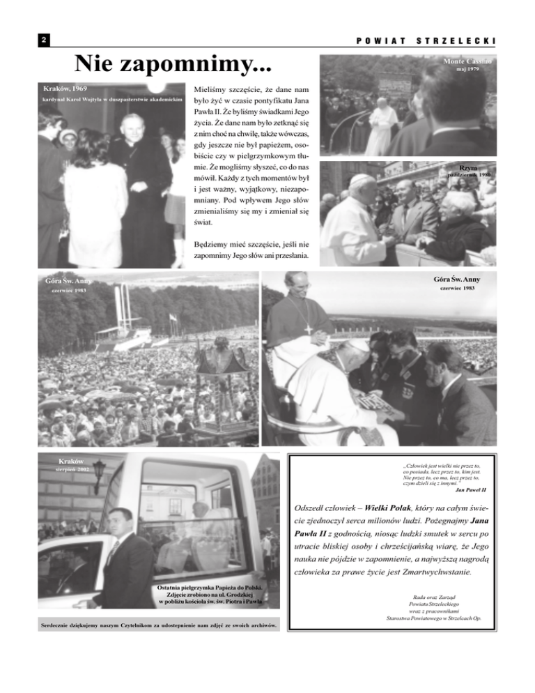 2 P O W I A T Nie zapomnimy... S T R Z E L E C K I Mo nt eCas s i no maj 1 9 7 9 Kraków, 1 9 6 9 Mielimy szczêcie, ¿e dane nam kardyna³ Karol Wojty³a w duszpasterstwie akademickim b y³ o¿yæw czasie p o nt yf ik at uJ ana P aw³ aI I . ¯e b ylimy wiadk ami J eg o ¿ycia. ¯e dane nam b y³ ozet k n¹ æsiê z nim ch o æna ch wilê, t ak ¿e wó wczas, g dy j eszcze nie b y³ p ap ie¿em, o so b icie czy w p ielg r zymk o wym t ³ u mie. ¯e mo g limy s³ yszeæ , codonas mó wi³ . Ka¿dy z t ychmo ment ó wb y³ Rz ym pa dziernik 1 9 8 0 i j estwa¿ny, wyj ¹ t k o wy, niezap o mniany.Po d wp ³ ywem J eg o s³ ó w zmienialimy siê my i zmienia³siê wiat . Bêdziemy mieæszczêcie, j eli nie zap o mnimy J eg os³ ó w ani p r zes³ ania. Góra w. Anny Góra w. Anny czerwiec 1 9 8 3 czerwiec 1 9 8 3 Krak ów Cz³owiek jest wielki nie przez to, sierpieñ 2 0 0 2 c o posia d a , lec z przez to, kim jest. Nie przez to, c o ma , lec z przez to, c zy md zieli siêz inny mi. Jan Pawe³ II Odsze d³ c z³o wie kWie lk i Po la k , k tó ryn ac a ³y m wie c iezje dn o c zy ³ se rc amilio n ó w lu dzi. Po ¿e g n a jmyJ a na Pa w³ aI Iz g o dn o c i¹ , n io s¹ clu dzk i smu te kw se rc up o u tra c ieb lisk ie j o so b yi c h rze c ija ñ sk ¹ wia rê , ¿eJ e g o n a u k an iep ó jdziew za p o mn ie n ie , an a jwy ¿sz¹n a g ro d¹ c z³o wie k a za p ra we¿y c ieje st Zma rtwy c h wsta n ie . Ostatnia pielgrzymka Papie¿a do Polski. Zdj ê c ie zrob iono na u l. Grodzkiej w pobli¿uko c io³ a w. w. Piotra i Paw³ a Ra d a ora z Za rz¹ d Powia tuS trzelec kieg o wra z z pra c ownika mi S ta rostwaPowia toweg o w S trzelc a c hOp. Serdecznie dziê kujemy naszym Czytelnikom za udostepnienie nam zdjê æ ze swoich archiwó w.