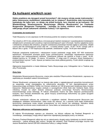 Za kulisami wielkich scen Gdzie przebiera się dyrygent przed koncertem? Jak muzycy stroją swoje instrumenty i jakie historyczne osobistości odwiedziły już to miejsce? Austriackie sale koncertowe zaskakują nie tylko tym, co dzieje się przed kurtyną, lecz również za jej kulisami. Od Wiedeńskiego Stowarzyszenia Muzycznego (Wiener Musikverein) po Festiwale Bregenckie (Bregenzer Festspiele) : zerkając za kulisy wielkich scen, zwiedzający odkrywają ukryte zakamarki obiektów kultury i ich tajemnice. Z warsztatu do kostiumerii Teatr Muzyczny w Linz zaprasza na 90-minutową podróż do wnętrza machiny teatralnej. Ten otwarty w 2013 roku obiekt kultury z innowacyjnym teatrem studyjnym i wysokiej jakości instalacjami dźwiękowymi uznawany jest za jedną z najnowocześniejszych oper w Europie. Oprócz oglądania sceny i orkiestronu (miejsca dla orkiestry), program zwiedzania przewiduje również wgląd w warsztaty. Obiekt czynny jest dla zwiedzających przez cały rok – w każdą sobotę o godz. 14.00 i 16.00. Uwaga: jeśli w danym dniu o godz. 17.00 rozpoczyna się spektakl, zwiedzanie o godz. 16.00 jest niemożliwe. Podczas zwiedzania kostiumerii i rekwizytorni turyści podziwiać mogą około 107 000 kostiumów teatralnych. Przewodnik prowadzi gości przez pomieszczenia, zdradzając najciekawsze tajemnice dotyczące tych nadzwyczajnych skarbów. Zwiedzanie odbywa się zawsze w środy o godz. 16.00. Kolejne terminy to: 15 lutego, 15 marca, 19 kwietnia, 17 maja oraz 21 czerwca. Koszt zwiedzania z przewodnikiem wynosi 7 euro. Spacer po teatrze trwa około półtorej godziny. Punkt zbiórki znajduje się we foyer teatru. Zgłoszenia bezpośrednio w kasie biletowej Teatru Muzycznego przy Volksgarten lub w Teatrze przy ulicy Promenade. Złota Sala Wiedeńskie Stowarzyszenie Muzyczne, znane jako siedziba Filharmoników Wiedeńskich, zaprasza na wędrówkę po okazałych salach koncertowych. Wiener Musikverein uznawane jest na świecie jako jeden z najpiękniejszych gmachów koncertowych ze wspaniałą, wciąż nieosiągalną do odtworzenia akustyką. W tym zaprojektowanym przez klasycystycznego architekta Teofila von Hansen obiekcie od 146 lat grana jest światowej klasy muzyka klasyczna. Międzynarodowy rozgłos zdobyła w szczególności Złota Sala (der Goldene Saal), którą miłośnicy muzyki na całym świecie zobaczyć podczas corocznego Koncertu Noworocznego transmitowanego przez telewizję. W trakcie zwiedzania można nie tylko obejrzeć pomieszczenia budynku, lecz również dowiedzieć się, gdzie muzycy przechowują instrumenty czy gdzie dyrygent przebiera się w swój frak. Otwarte zwiedzanie odbywa się codziennie z wyjątkiem niedziel. Stowarzyszenie Muzyczne jest działającym obiektem koncertowym, toteż może się zdarzyć, że z powodu prób bądź przebudowy technicznej zwiedzanie może zostać przeniesione na inny termin lub odwołane. Aktualna oferta dostępna jest na stronie www.musikverein.at. Cena biletu za zwiedzanie wynosi 6,50 euro. Wyprawa odkrywcza nad brzegiem jeziora W trakcie 50-minutowego spaceru po obszarze, na którym odbywa się Festiwal Bregencki w Vorarlbergu, zwiedzający mogą odkryć tajemnice największej pływającej sceny na świecie. Pierwszy Festiwal Bregencki odbył się rok po zakończeniu drugiej wojny światowej na dwóch barkach żwirowych – jednej służącej jako scena i drugiej dla orkiestry. Dziś Festiwal przyciąga rocznie nad Jezioro Bodeńskie niemal 228 000 miłośników kultury z całego świata. Od 29 maja do 17 lipca – w każdy poniedziałek, środę i piątek o godz. 16.00 (punkt zbiórki przy głównym wejściu) – goście mogą wybrać się za kulisy festiwalu. Od 19 lipca do 20 sierpnia zwiedzanie odbywa się między godz. 10.30 a 15.30 (punkt zbiórki przy głównym wejściu). Cena biletu wynosi 7,50 euro, dzieci do 10. roku życia wchodzą za darmo. Uwaga: ze względu na próby, przebudowę lub czynniki pogodowe program zwiedzania może ulec zmianie. Dwudziestominutowa prezentacja umożliwia zapoznanie się z fascynującymi rozwiązaniami technicznymi sceny oraz pozwala podejrzeć próby muzyczne (terminy: 17 i 24 czerwca oraz 1 i 8 lipca 2017 r. o godz. 14.00). Wstęp wolny. Kulisy Konzerthaus Konzerthaus, czyli Wiedeńska Sala Koncertowa zachwyca bogatą tradycją i nowoczesnością wyznaczając tym samym nowe ścieżki w architekturze teatralnej. Imponująca sala koncertowa, zbudowana przez słynnych architektów teatralnych Ferdinanda Fellner i Hermanna Helmer Gottlieb we współpracy z Ludwigiem Baumannem, od ponad wieku kształtuje życie kulturalne Wiednia. Wspaniała budowla jest nie tylko popularnym miejscem spotkań słynnych artystów z całego świata, ale także licznych artystów austriackich: swoją siedzibę mają tutaj Wiedeńska Orkiestra Symfoniczna, Wiedeńska Orkiestra Kameralna i Klangforum Wiedeń. Na scenie sali koncertowej w sezonie granych jest ponad 800 koncertów. Program zwiedzania prowadzi od backstagu poprzez pomieszczenia solistów aż do pomieszczeń garderoby. Najczęściej zwiedzający mają możliwość uczestniczyć także w próbach i posłuchać przygotowujących się do koncertu muzyków. Zwiedzanie trwa około godziny. Miejsce spotkania – wejście główne Konzerthaus w Wiedniu (foyer przy wejściu) na ulicy Lothringestraße.