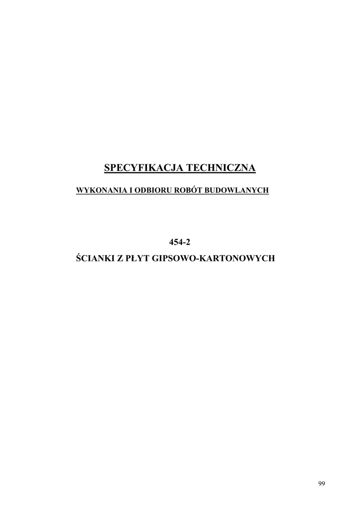 SPECYFIKACJA TECHNICZNA WYKONANIA I ODBIORU ROBÓT BUDOWLANYCH 454-2 ŚCIANKI Z PŁYT GIPSOWO-KARTONOWYCH 99 SPIS TREŚCI 1. WSTĘP .................................................................................................................................................... 101 2. MATERIAŁY ......................................................................................................................................... 101 3. SPRZĘT ……………………………………………………………………………………………….103 4. TRANSPORT …………………………………………………………………………………………..103 5. WYKONANIE ROBÓT ……………………………………………………………………………….103 6. KONTROLA JAKOŚCI ROBÓT ........................................................................................................ 106 7. OBMIAR ROBÓT ................................................................................................................................. 106 8. ODBIÓR ROBÓT .................................................................................................................................. 106 9. PODSTAWA PŁATNOŚCI ....……………………………………………………………………….106 8. PRZEPISY ZWIĄZANE ....................................................................................................................... 106 100 454. ROBOTY WYKOŃCZENIOWE 454-2 ŚCIANKI Z PŁYT GIPSOWO-KARTONOWYCH 1. WSTĘP 1.1. Przedmiot SST Przedmiotem niniejszej szczegółowej specyfikacji technicznej są wymagania dotyczące wykonania i odbioru systemów ścian działowych płyt gipsowo-kartonowych na ruszcie stalowym związanych z przebudową budynku socjalno-higienicznego na zespół szatniowo-sanitarny. Klasyfikacja wg Wspólnego Słownika Zamówień (CPV) Grupa Klasa Kategoria 454 00 000-1 454 20 000-7 454 21 000-4 454 21 141-4 Opis Roboty wykończeniowe w zakresie obiektów budowlanych. Roboty w zakresie zakładania stolarki budowlanej oraz roboty ciesielskie. Roboty w zakresie stolarki budowlanej. Instalowanie przegród. 1.2. Zakres stosowania SST Szczegółowa specyfikacja techniczna jest stosowana jako dokument przetargowy i kontraktowy przy zlecaniu i realizacji robót wymienionych w pkt. 1.1. 1.3. Określenia podstawowe Określenia i nazewnictwo użyte w niniejszej szczegółowej specyfikacji technicznej są zgodne z obowiązującymi podanymi w normach PN i przepisach Prawa budowlanego. roboty budowlane przy wykonywaniu okładzin z płyt - wszystkie prace budowlane związane z wykonywaniem okładzin z płyt zgodnie z dokumentacją projektową, konstrukcja - uporządkowany zespół połączonych części, zaprojektowany w celu zapewnienia określonego stopnia sztywności, 1.4. Zakres robót objętych SST Ustalenia zawarte w niniejszej szczegółowej specyfikacji technicznej obejmują wszystkie czynności umożliwiające i mające na celu wykonanie ścian działowych z płyt gipsowo-kartonowych na ruszcie stalowym, do których wykonania zostały użyte materiały odpowiadające wymaganiom norm lub aprobat technicznych. 1.5. Ogólne wymagania dotyczące robót Wykonawca robót jest odpowiedzialny za jakość wykonania robót, ich zgodność z dokumentacją projektową, SST i poleceniami Inspektora Nadzoru. Ogólne wymagania dotyczące robót podano w „Wymaganiach ogólnych" pkt. 2 ogólnej specyfikacji technicznej. 2. MATERIAŁY 2.1. Wymagania ogólne Ogólne wymagania dotyczące materiałów, ich pozyskiwania i składowania podano w OST „Wymagania ogólne" pkt. 3.1. 101 2.2. Materiały potrzebne do wykonania robót Płyty gipsowo- kartonowe Płyty gipsowo-kartonowe impregnowane zwykłe gr. 12,5 mm, (GKI) - płyty zapewniające zmniejszone wchłanianie wody – nasiąkliwość mniejsza niż 10%, przeznaczone do pomieszczeń, w których okresowo (do 10 godzin) wilgotność względna powietrza nie przekracza 85%; Profile stalowe zimnogięte Do wykonania rusztów ścian, okładzin ścian powinny być stosowane kształtowniki zimnogięte z blachy stalowej, ocynkowanej wg PN-H-92125:1989, gatunku St0S wg PN-EN 10025:2002 lub gatunku DX51D+Z wg PN-EN 10142+A1: 1997. Kształtowniki stalowe powinny być powierzchniowo zabezpieczone przed korozją powłoką cynkową (nanoszoną ogniowo) charakteryzującą się : - grubością >7um (100g/m2 lub >19 urn (275g/m2) badaną wg PN-EN ISO 2178: 1998 (badanie masy powłoki wg PN-EN 10142+A1: 1997), - przyczepnością - brak złuszczeń wg PN-EN 10142+A1: 1997, - wyglądem powierzchni - bez wad wg PN-EN 10142+A1: 1997. Kształtowniki potrzebne do wykonania okładziny ściennej: - Kształtowniki profilowane UW 50, - Kształtowniki profilowane CW 50, - Kształtowniki profilowane UW 100, - Kształtowniki profilowane CW 100, Akcesoria stalowe służą do łączenia kształtowników konstrukcji nośnej z podłożem i między sobą: - łączniki wzdłużne, - uchwyty bezpośrednie długie, - uchwyty bezpośrednie krótkie, - kołki rozporowe plastikowe, metalowe, - kołki szybkiego montażu, - kołki wstrzeliwane. Wszystkie akcesoria powinny być wykonane ze stali ocynkowanej wg wymagań jak dla kształtowników stalowych wg pkt. 2.3. Inne akcesoria Akcesoria stosowane do wykonania systemów suchej zabudowy: - taśmy spoinowe: z włókna szklanego, samoprzylepna z włókna szklanego, perforowana papierowa - do wzmacniania spoin między płytami gipsowo-kartonowymi oraz spoin narożnych i obwodowych, - uszczelki obwodowe: polietylenowe grubości 3, 4 mm, filcowe 5 mm, z wełny mineralnej do 10 mm- do uszczelniania połączeń konstrukcji ze stropem i ścianami bocznymi. Wkręty Do mocowania płyt gipsowo-kartonowych do kształtowników nośnych, łączenia kształtowników między sobą oraz mocowania profili w uchwytach powinny być stosowane - wkręty stalowe, blachowkręty samogwintujące. Masa szpachlowa - g