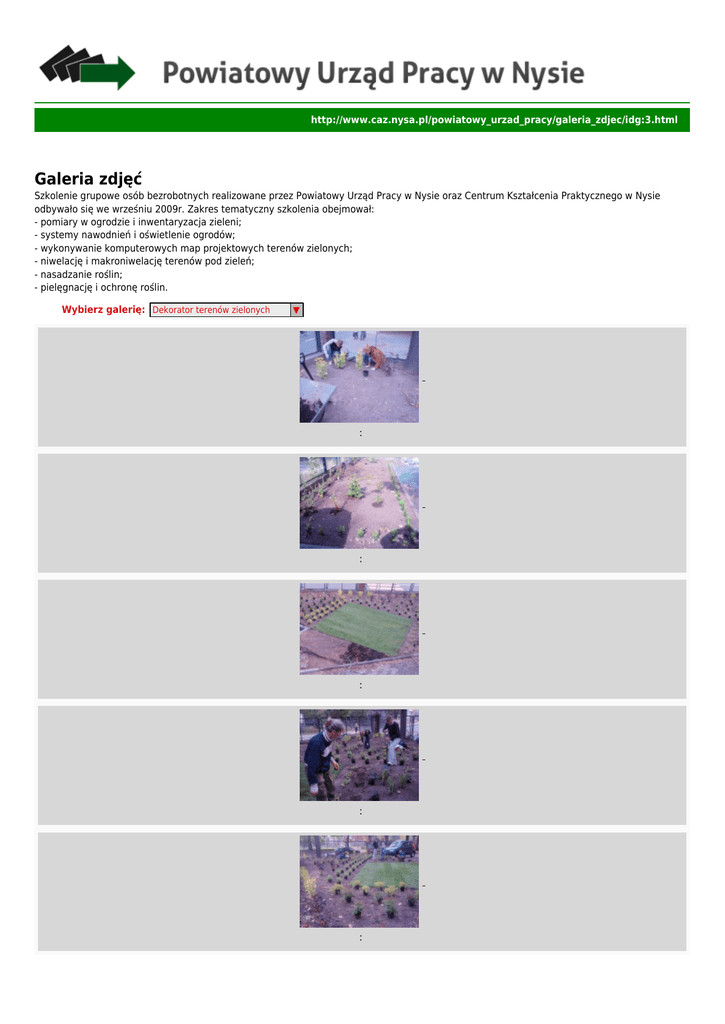 http://www.caz.nysa.pl/powiatowy_urzad_pracy/galeria_zdjec/idg:3.html Galeria zdjęć Szkolenie grupowe osób bezrobotnych realizowane przez Powiatowy Urząd Pracy w Nysie oraz Centrum Kształcenia Praktycznego w Nysie odbywało się we wrześniu 2009r. Zakres tematyczny szkolenia obejmował: - pomiary w ogrodzie i inwentaryzacja zieleni; - systemy nawodnień i oświetlenie ogrodów; - wykonywanie komputerowych map projektowych terenów zielonych; - niwelację i makroniwelację terenów pod zieleń; - nasadzanie roślin; - pielęgnację i ochronę roślin. Wybierz galerię: Dekorator terenów zielonych ▼ : : : : : :