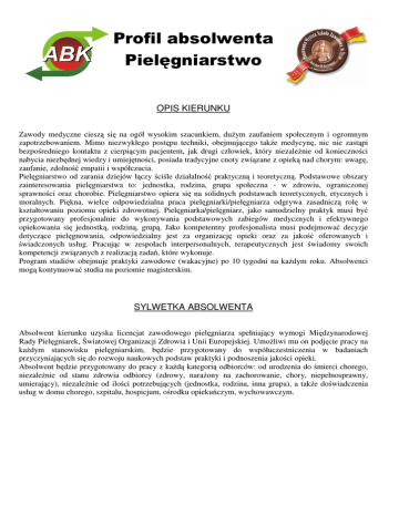 Profil absolwenta Pielęgniarstwo OPIS KIERUNKU Zawody medyczne cieszą się na ogół wysokim szacunkiem, dużym zaufaniem społecznym i ogromnym zapotrzebowaniem. Mimo niezwykłego postępu techniki, obejmującego także medycynę, nic nie zastąpi bezpośredniego kontaktu z cierpiącym pacjentem, jak drugi człowiek, który niezależnie od konieczności nabycia niezbędnej wiedzy i umiejętności, posiada tradycyjne cnoty związane z opieką nad chorym: uwagę, zaufanie, zdolność empatii i współczucia. Pielęgniarstwo od zarania dziejów łączy ściśle działalność praktyczną i teoretyczną. Podstawowe obszary zainteresowania pielęgniarstwa to: jednostka, rodzina, grupa społeczna - w zdrowiu, ograniczonej sprawności oraz chorobie. Pielęgniarstwo opiera się na solidnych podstawach teoretycznych, etycznych i moralnych. Piękna, wielce odpowiedzialna praca pielęgniarki/pielęgniarza odgrywa zasadniczą rolę w kształtowaniu poziomu opieki zdrowotnej. Pielęgniarka/pielęgniarz, jako samodzielny praktyk musi być przygotowany profesjonalnie do wykonywania podstawowych zabiegów medycznych i efektywnego opiekowania się jednostką, rodziną, grupą. Jako kompetentny profesjonalista musi podejmować decyzje dotyczące pielęgnowania, odpowiedzialny jest za organizację opieki oraz za jakość oferowanych i świadczonych usług. Pracując w zespołach interpersonalnych, terapeutycznych jest świadomy swoich kompetencji związanych z realizacją zadań, które wykonuje. Program studiów obejmuje praktyki zawodowe (wakacyjne) po 10 tygodni na każdym roku. Absolwenci mogą kontynuować studia na poziomie magisterskim. SYLWETKA ABSOLWENTA Absolwent kierunku uzyska licencjat zawodowego pielęgniarza spełniający wymogi Międzynarodowej Rady Pielęgniarek, Światowej Organizacji Zdrowia i Unii Europejskiej. Umożliwi mu on podjęcie pracy na każdym stanowisku pielęgniarskim, będzie przygotowany do współuczestniczenia w badaniach przyczyniających się do rozwoju naukowych podstaw praktyki i podnoszenia jakości opieki. Absolwent będzie przygotowany do pracy z każdą kategorią odbiorców: od urodzenia do śmierci chorego, niezależnie od stanu zdrowia odbiorcy (zdrowy, narażony na zachorowanie, chory, niepełnosprawny, umierający), niezależnie od ilości potrzebujących (jednostka, rodzina, inna grupa), a także doświadczenia usług w domu chorego, szpitalu, hospicjum, ośrodku opiekuńczym, wychowawczym. Profil absolwenta Pielęgniarstwo PROGRAM STUDIÓW