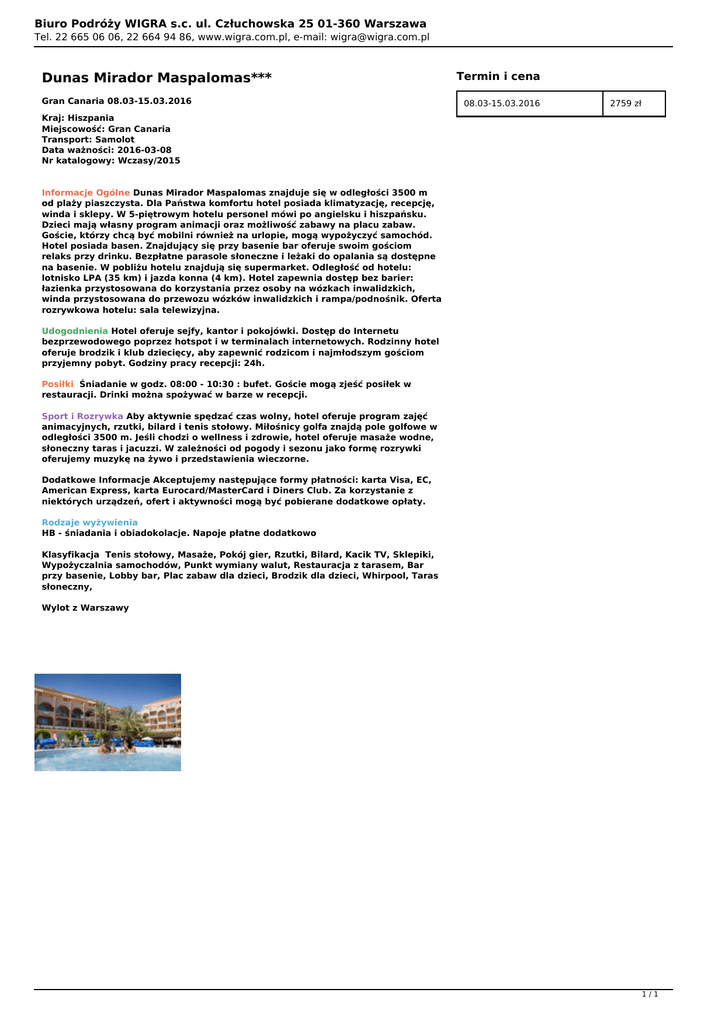 Biuro Podróży WIGRA s.c. ul. Człuchowska 25 01-360 Warszawa Tel. 22 665 06 06, 22 664 94 86, www.wigra.com.pl, e-mail: [email protected] Dunas Mirador Maspalomas*** Gran Canaria 08.03-15.03.2016 Termin i cena 08.03-15.03.2016 2759 zł Kraj: Hiszpania Miejscowość: Gran Canaria Transport: Samolot Data ważności: 2016-03-08 Nr katalogowy: Wczasy/2015 Informacje Ogólne Dunas Mirador Maspalomas znajduje się w odległości 3500 m od plaży piaszczysta. Dla Państwa komfortu hotel posiada klimatyzację, recepcję, winda i sklepy. W 5-piętrowym hotelu personel mówi po angielsku i hiszpańsku. Dzieci mają własny program animacji oraz możliwość zabawy na placu zabaw. Goście, którzy chcą być mobilni również na urlopie, mogą wypożyczyć samochód. Hotel posiada basen. Znajdujący się przy basenie bar oferuje swoim gościom relaks przy drinku. Bezpłatne parasole słoneczne i leżaki do opalania są dostępne na basenie. W pobliżu hotelu znajdują się supermarket. Odległość od hotelu: lotnisko LPA (35 km) i jazda konna (4 km). Hotel zapewnia dostęp bez barier: łazienka przystosowana do korzystania przez osoby na wózkach inwalidzkich, winda przystosowana do przewozu wózków inwalidzkich i rampa/podnośnik. Oferta rozrywkowa hotelu: sala telewizyjna. Udogodnienia Hotel oferuje sejfy, kantor i pokojówki. Dostęp do Internetu bezprzewodowego poprzez hotspot i w terminalach internetowych. Rodzinny hotel oferuje brodzik i klub dziecięcy, aby zapewnić rodzicom i najmłodszym gościom przyjemny pobyt. Godziny pracy recepcji: 24h. Posiłki Śniadanie w godz. 08:00 - 10:30 : bufet. Goście mogą zjeść posiłek w restauracji. Drinki można spożywać w barze w recepcji. Sport i Rozrywka Aby aktywnie spędzać czas wolny, hotel oferuje program zajęć animacyjnych, rzutki, bilard i tenis stołowy. Miłośnicy golfa znajdą pole golfowe w odległości 3500 m. Jeśli chodzi o wellness i zdrowie, hotel oferuje masaże wodne, słoneczny taras i jacuzzi. W zależności od pogody i sezonu jako formę rozrywki oferujemy muzykę na żywo i przedstawienia wieczorne. Dodatkowe Informacje Akceptujemy następujące formy płatności: karta Visa, EC, American Express, karta Eurocard/MasterCard i Diners Club. Za korzystanie z niektórych urządzeń, ofert i aktywności mogą być pobierane dodatkowe opłaty. Rodzaje wyżywienia HB - śniadania i obiadokolacje. Napoje płatne dodatkowo Klasyfikacja Tenis stołowy, Masaże, Pokój gier, Rzutki, Bilard, Kacik TV, Sklepiki, Wypożyczalnia samochodów, Punkt wymiany walut, Restauracja z tarasem, Bar przy basenie, Lobby bar, Plac zabaw dla dzieci, Brodzik dla dzieci, Whirpool, Taras słoneczny, Wylot z Warszawy 1/1 Powered by TCPDF (www.tcpdf.org)