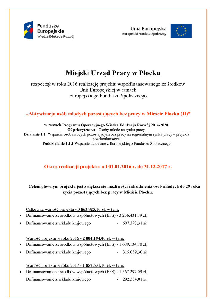 Miejski Urząd Pracy w Płocku rozpoczął w roku 2016 realizację projektu współfinansowanego ze środków Unii Europejskiej w ramach Europejskiego Funduszu Społecznego „Aktywizacja osób młodych pozostających bez pracy w Mieście Płocku (II)” w ramach Programu Operacyjnego Wiedza Edukacja Rozwój 2014-2020, Oś priorytetowa I Osoby młode na rynku pracy, Działanie 1.1 Wsparcie osób młodych pozostających bez pracy na regionalnym rynku pracy – projekty pozakonkursowe, Poddziałanie 1.1.1 Wsparcie udzielane z Europejskiego Funduszu Społecznego Okres realizacji projektu: od 01.01.2016 r. do 31.12.2017 r. Celem głównym projektu jest zwiększenie możliwości zatrudnienia osób młodych do 29 roku życia pozostających bez pracy w Mieście Płocku. Całkowita wartość projektu - 3 863.825,10 zł, w tym: Dofinansowanie ze środków wspólnotowych (EFS) - 3 256.431,79 zł, Dofinansowanie z wkładu krajowego Wartość projektu w roku 2016 - 2 004.194,00 zł, w tym: Dofinansowanie ze środków wspólnotowych (EFS) - 1 689.134,70 zł, Dofinansowanie z wkładu krajowego Wartość projektu w roku 2017 - 1 859.631,10 zł, w tym: Dofinansowanie ze środków wspólnotowych (EFS) - 1 567.297,09 zł, Dofinansowanie z wkładu krajowego - 607.393,31 zł - 315.059,30 zł - 292.334,01 zł W ramach projektu zaplanowano: Zorganizowanie stażu dla 362 osób: 2016 rok – 207 osób, 2017 rok – 155 osób. Zorganizowanie szkoleń grupowych dla 64 osób: 2016 rok – 30 osób 2017 rok – 34 osoby. Ww. działania przyczynią się do: - nabycia lub uzupełnienia doświadczenia zawodowego oraz praktycznych umiejętności w zakresie wykonywania danego zawodu, a także nauczą zachowań w miejscu pracy i zasad funkcjonowania różnego rodzaju instytucji, - nabycia, podwyższenia lub dostosowania kompetencji i kwalifikacji do potrzeb rynku pracy. Uczestnikami projektu są osoby młode w wieku 18-29 lat bez pracy, zarejestrowane w Miejskim Urzędzie Pracy w Płocku jako bezrobotne, dla których ustalono I lub II profil pomocy (w przypadku profilu I tylko w uzasadnionych przypadkach), które nie uczestniczą w kształceniu i szkoleniu (tzw. młodzież NEET) zgodnie z definicją osoby z kategorii NEET przyjętą w Programie Operacyjnym Wiedza Edukacja Rozwój 2014-2020, w tym osoby z niepełnosprawnościami i osoby długotrwale bezrobotne (zgodnie z definicją przyjętą przez Komisję Europejską). Zgodnie z PO WER 2014-2020 osobą z kategorii NEET jest osoba młoda, która spełnia łącznie trzy następujące warunki: - nie pracuje (tj. jest bezrobotna lub bierna zawodowo), - nie kształci się (tj. nie uczestniczy w kształceniu formalnym w trybie stacjonarnym), - nie szkoli (tj. nie uczestniczy w pozaszkolnych zajęciach mających na celu uzyskanie, uzupełnienie lub doskonalenie umiejętności i kwalifikacji zawodowych lub ogólnych, potrzebnych do wykonywania pracy. W procesie oceny, czy dana osoba się nie szkoli, a co za tym idzie kwalifikuje się do kategorii NEET, należy zweryfikować czy brała ona udział w tego typu formie aktywizacji, finansowanej ze środków publicznych, w okresie ostatnich 4 tygodni). Projekt zakłada udzielenie wsparcia w ciągu 4 miesięcy zgodnie ze standardami określonymi w Gwarancji dla Młodzieży tj. dla osób do 25 roku życia od dnia rejestracji w urzędzie pracy, natomiast dla osób powyżej 25 roku życia od dnia przystąpienia do projektu. Przy realizacji ww. projektu przestrzegana jest polityka równości szans i zapobiegania dyskryminacji i równości szans płci.