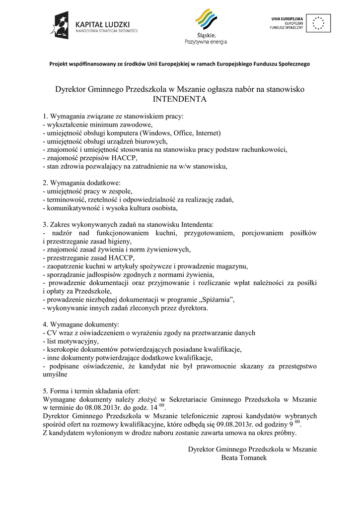 Projekt współfinansowany ze środków Unii Europejskiej w ramach Europejskiego Funduszu Społecznego Dyrektor Gminnego Przedszkola w Mszanie ogłasza nabór na stanowisko INTENDENTA 1. Wymagania związane ze stanowiskiem pracy: - wykształcenie minimum zawodowe, - umiejętność obsługi komputera (Windows, Office, Internet) - umiejętność obsługi urządzeń biurowych, - znajomość i umiejętność stosowania na stanowisku pracy podstaw rachunkowości, - znajomość przepisów HACCP, - stan zdrowia pozwalający na zatrudnienie na w/w stanowisku, 2. Wymagania dodatkowe: - umiejętność pracy w zespole, - terminowość, rzetelność i odpowiedzialność za realizację zadań, - komunikatywność i wysoka kultura osobista, 3. Zakres wykonywanych zadań na stanowisku Intendenta: - nadzór nad funkcjonowaniem kuchni, przygotowaniem, porcjowaniem posiłków i przestrzeganie zasad higieny, - znajomość zasad żywienia i norm żywieniowych, - przestrzeganie zasad HACCP, - zaopatrzenie kuchni w artykuły spożywcze i prowadzenie magazynu, - sporządzanie jadłospisów zgodnych z normami żywienia, - prowadzenie dokumentacji oraz przyjmowanie i rozliczanie wpłat należności za posiłki i opłaty za Przedszkole, - prowadzenie niezbędnej dokumentacji w programie „Spiżarnia”, - wykonywanie innych zadań zleconych przez dyrektora. 4. Wymagane dokumenty: - CV wraz z oświadczeniem o wyrażeniu zgody na przetwarzanie danych - list motywacyjny, - kserokopie dokumentów potwierdzających posiadane kwalifikacje, - inne dokumenty potwierdzające dodatkowe kwalifikacje, - podpisane oświadczenie, że kandydat nie był prawomocnie skazany za przestępstwo umyślne 5. Forma i termin składania ofert: Wymagane dokumenty należy złożyć w Sekretariacie Gminnego Przedszkola w Mszanie w terminie do 08.08.2013r. do godz. 14 00. Dyrektor Gminnego Przedszkola w Mszanie telefonicznie zaprosi kandydatów wybranych spośród ofert na rozmowy kwalifikacyjne, które odbędą się 09.08.2013r. od godziny 9 00. Z kandydatem wyłonionym w drodze naboru zostanie zawarta umowa na okres próbny. Dyrektor Gminnego Przedszkola w Mszanie Beata Tomanek