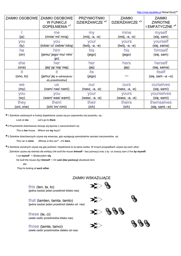 http://mql.republika.pl Michał Kluz©06 ZAIMKI OSOBOWE ZAIMKI OSOBOWE W FUNKCJI DOPEŁNIENIA *1 PRZYMIOTNIKI DZIERŻAWCZE *2 ZAIMKI DZIERŻAWCZE *3 ZAIMKI ZWROTNE I EMFATYCZNE *4 I me my mine myself (ja) (mnie/ mi/ mną) (mój, -a, -e) (mój, -a, -e) (się, sam) you you your yours yourself (ty) (tobie/ ci/ ciebie/ tobą) (twój, -a, -e) (twój, -a, -e) (się, sama) he him his his himself (on) (jemu/ jego/ mu/ nim/ go) (jego) (jego) (się, sam) she her her hers herself (ona) (jej/ ją/ nią/ niej) (jej) (jej) (się, sama) it it its (ono, to) (jemu/ jej w odniesieniu do przedmiotów) (jego) --- (się, sam –a –o) itself we us our ours ourselves (my) (nam/ nas/ nami) (nasz, -a, -e) (nasz, -a, -e) (się, sami) you you your yours yourselves (wy) (wam/ was/ wami) (wasz, -a, -e) (wasz, -a, -e) (się, sami) they them their theirs themselves (oni, one) (ich/ im/ nimi) (ich) (ich) (się, sami –e) *1 Zaimków osobowych w funkcji dopełnienia używa się po czasowniku lub przyimku. np.: Look at me. Let’s go to them. *2 Przymiotniki dzierżawcze stosuje się łącznie z rzeczownikami np: This is her house. Where are my keys? *3 Zaimków dzierżawczych używa się wówczas, gdy występują samodzielnie zamiast rzeczowników np: This car is mine. -Whose is this car? –It’s hers. *4 Zaimków zwrotnych używa się gdy podmiot i dopełnienie to ta sama osoba. W innych przypadkach używa się each other. Zaimków używa się również dla emfazy (He built the house himself – bez pomocy) oraz z by co znaczy sam (I live by myself) I cut myself. = Skaleczyłem się. He built the house (by) himself. = On sam (bez pomocy) zbudował dom. ale: They’re looking at each other. ZAIMKI WSKAZUJĄCE this (ten, ta, to) (jedna osoba/ jeden przedmiot blisko nas) that (tamten, tamta, tamto) (jedna osoba/ jeden przedmiot daleko od nas) these (te, ci) (wiele osób/ przedmiotów blisko nas) those (tamte, tamci) (wiele osób/ przedmiotów daleko od nas) Hv v H H vvv vvv H
