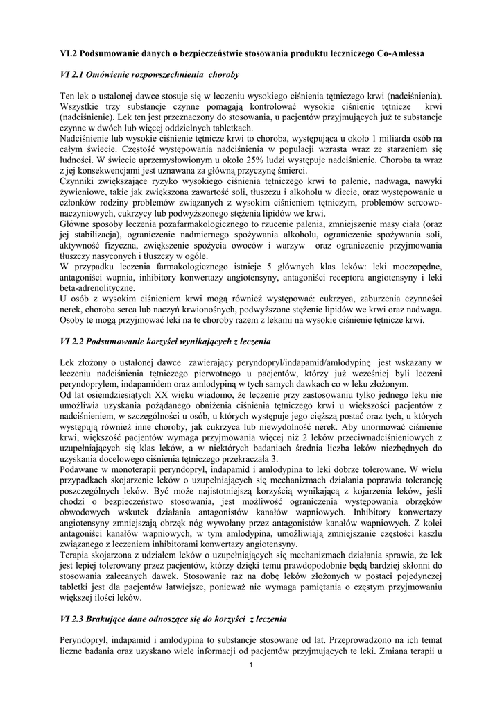 VI.2 Podsumowanie danych o bezpieczeństwie stosowania produktu leczniczego Co-Amlessa VI 2.1 Omówienie rozpowszechnienia choroby Ten lek o ustalonej dawce stosuje się w leczeniu wysokiego ciśnienia tętniczego krwi (nadciśnienia). Wszystkie trzy substancje czynne pomagają kontrolować wysokie ciśnienie tętnicze krwi (nadciśnienie). Lek ten jest przeznaczony do stosowania, u pacjentów przyjmujących już te substancje czynne w dwóch lub więcej oddzielnych tabletkach. Nadciśnienie lub wysokie ciśnienie tętnicze krwi to choroba, występująca u około 1 miliarda osób na całym świecie. Częstość występowania nadciśnienia w populacji wzrasta wraz ze starzeniem się ludności. W świecie uprzemysłowionym u około 25% ludzi występuje nadciśnienie. Choroba ta wraz z jej konsekwencjami jest uznawana za główną przyczynę śmierci. Czynniki zwiększające ryzyko wysokiego ciśnienia tętniczego krwi to palenie, nadwaga, nawyki żywieniowe, takie jak zwiększona zawartość soli, tłuszczu i alkoholu w diecie, oraz występowanie u członków rodziny problemów związanych z wysokim ciśnieniem tętniczym, problemów sercowonaczyniowych, cukrzycy lub podwyższonego stężenia lipidów we krwi. Główne sposoby leczenia pozafarmakologicznego to rzucenie palenia, zmniejszenie masy ciała (oraz jej stabilizacja), ograniczenie nadmiernego spożywania alkoholu, ograniczenie spożywania soli, aktywność fizyczna, zwiększenie spożycia owoców i warzyw oraz ograniczenie przyjmowania tłuszczy nasyconych i tłuszczy w ogóle. W przypadku leczenia farmakologicznego istnieje 5 głównych klas leków: leki moczopędne, antagoniści wapnia, inhibitory konwertazy angiotensyny, antagoniści receptora angiotensyny i leki beta-adrenolityczne. U osób z wysokim ciśnieniem krwi mogą również występować: cukrzyca, zaburzenia czynności nerek, choroba serca lub naczyń krwionośnych, podwyższone stężenie lipidów we krwi oraz nadwaga. Osoby te mogą przyjmować leki na te choroby razem z lekami na wysokie ciśnienie tętnicze krwi. VI 2.2 Podsumowanie korzyści wynikających z leczenia Lek złożony o ustalonej dawce zawierający peryndopryl/indapamid/amlodypinę jest wskazany w leczeniu nadciśnienia tętniczego pierwotnego u pacjentów, którzy już wcześniej byli leczeni peryndoprylem, indapamidem oraz amlodypiną w tych samych dawkach co w leku złożonym. Od lat osiemdziesiątych XX wieku wiadomo, że leczenie przy zastosowaniu tylko jednego leku nie umożliwia uzyskania pożądanego obniżenia ciśnienia tętniczego krwi u większości pacjentów z nadciśnieniem, w szczególności u osób, u których występuje jego cięższą postać oraz tych, u których występują również inne choroby, jak cukrzyca lub niewydolność nerek. Aby unormować ciśnienie krwi, większość pacjentów wymaga przyjmowania więcej niż 2 leków przeciwnadciśnieniowych z uzupełniających się klas leków, a w niektórych badaniach średnia liczba leków niezbędnych do uzyskania docelowego ciśnienia tętniczego przekraczała 3. Podawane w monoterapii peryndopryl, indapamid i amlodypina to leki dobrze tolerowane. W wielu przypadkach skojarzenie leków o uzupełniających się mechanizmach działania poprawia tolerancję poszczególnych leków. Być może najistotniejszą korzyścią wynikającą z kojarzenia leków, jeśli chodzi o bezpieczeństwo stosowania, jest możliwość ograniczenia występowania obrzęków obwodowych wskutek działania antagonistów kanałów wapniowych. Inhibitory konwertazy angiotensyny zmniejszają obrzęk nóg wywołany przez antagonistów kanałów wapniowych. Z kolei antagoniści kanałów wapniowych, w tym amlodypina, umożliwiają zmniejszanie częstości kaszlu związanego z leczeniem inhibitorami konwertazy angiotensyny. Terapia skojarzona z udziałem leków o uzupełniających się mechanizmach działania sprawia, że lek jest lepiej tolerowany przez pacjentów, którzy dzięki temu prawdopodobnie będą bardziej skłonni do stosowania zalecanych dawek. Stosowanie raz na dobę leków złożonych w postaci pojedynczej tabletki jest dla pacjentów łatwiejsze, ponieważ nie wymaga pamiętania o częstym przyjmowaniu większej ilości leków. VI 2.3 Brakujące dane odnoszące się do korzyści z leczenia Peryndopryl, indapamid i amlodypina to substancje stosowane od lat. Przeprowadzono na ich temat liczne badania oraz uzyskano wiele informacji od pacjentów przyjmujących te leki. Zmiana terapii u 1 pacjentów przyjmujących te trzy leki w postaci dwóch lub trzech tabletek na terapię obejmującą wszystkie trzy substancje w jednej tabletce nie powinna prowadzić do zmian w zakresie oczekiwanych korzyści oraz bezpieczeństwa. Dobrze zbadano pacjentów ze szczególnymi schorzeniami, jak choroba nerek, serca, wątroby, oraz pacjentów w podeszłym wieku i kobiety w ciąży. Brak badań dotyczących dzieci i młodzieży, jednakże ten lek nie jest przeznaczony dla tej grupy wiekowej, dlatego też nie należy go stosować u dzieci i młodzieży. VI 2.4 Podsumowanie kwestii dotyczących bezpieczeństwa Istotne zidentyfikowane ryzyka Ryzyko Niskie ciśnienie tętnicze krwi (niedociśnienie) Kaszel Problemy z wątrobą (niewydolność wątroby) Zaburzenia czynności nerek (niewydolność nerek) Reakcje alergiczne, w tym obrzęk twarzy, szyi, warg, Aktualna wiedza U pacjentów z wysokim ciśnieniem tętniczym krwi peryndopryl i amlodypina powodują rozszerzenie naczyń krwionośnych, dzięki czemu krew łatwiej przez nie przepływa. Indapamid zwiększa ilość moczu produkowaną przez nerki. Każda z substancji czynnych obniża ciśnienie krwi, a razem skutecznie kontrolują one jego poziom. Suchy kaszel pojawia się przy stosowaniu inhibitorów konwertazy angiotensyny (peryndoprylu) i ustępuje po przerwaniu leczenia. Leczenie można kontynuować, nawet jeżeli pacjent ma kaszel. W badaniach klinicznych wykazano, że inhibitory konwertazy angiotensyny, w tym perynd