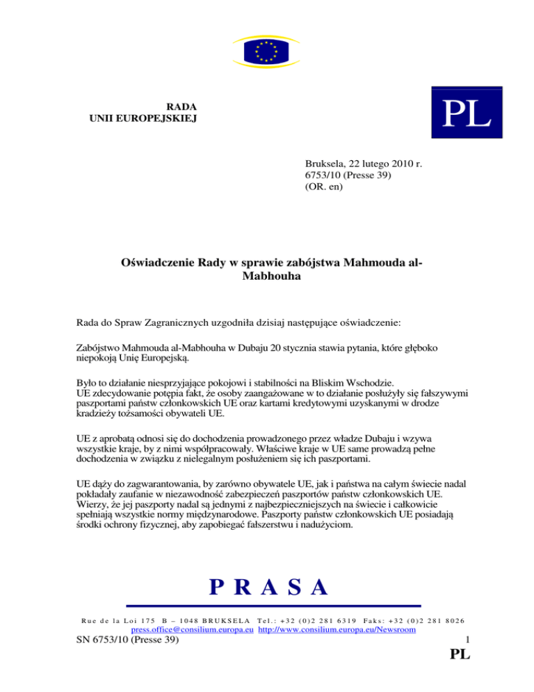 PL RADA UNII EUROPEJSKIEJ Bruksela, 22 lutego 2010 r. 6753/10 (Presse 39) (OR. en) Oświadczenie Rady w sprawie zabójstwa Mahmouda alMabhouha Rada do Spraw Zagranicznych uzgodniła dzisiaj następujące oświadczenie: Zabójstwo Mahmouda al-Mabhouha w Dubaju 20 stycznia stawia pytania, które głęboko niepokoją Unię Europejską. Było to działanie niesprzyjające pokojowi i stabilności na Bliskim Wschodzie. UE zdecydowanie potępia fakt, że osoby zaangażowane w to działanie posłużyły się fałszywymi paszportami państw członkowskich UE oraz kartami kredytowymi uzyskanymi w drodze kradzieży tożsamości obywateli UE. UE z aprobatą odnosi się do dochodzenia prowadzonego przez władze Dubaju i wzywa wszystkie kraje, by z nimi współpracowały. Właściwe kraje w UE same prowadzą pełne dochodzenia w związku z nielegalnym posłużeniem się ich paszportami. UE dąży do zagwarantowania, by zarówno obywatele UE, jak i państwa na całym świecie nadal pokładały zaufanie w niezawodność zabezpieczeń paszportów państw członkowskich UE. Wierzy, że jej paszporty nadal są jednymi z najbezpieczniejszych na świecie i całkowicie spełniają wszystkie normy międzynarodowe. Paszporty państw członkowskich UE posiadają środki ochrony fizycznej, aby zapobiegać fałszerstwu i nadużyciom. PRASA Rue de la Loi 175 B – 1048 BRUKSELA Tel.: +32 (0)2 281 6319 Faks: +32 (0)2 281 8026 [email protected] http://www.consilium.europa.eu/Newsroom SN 6753/10 (Presse 39) 1 PL SN 6753/10 (Presse 39) 2 PL