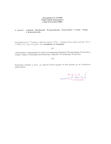 REGULAMIN WYNAGRADZANIA DLA PRACOWNIKÓW URZĘDU GMINY W KOŁCZYGŁOWACH 1. Przepisy wstępne §1 1. Na podstawie art. 77 K.P. ustalam warunki wynagradzania za pracę i przyznawania innych świadczeń mających związek z pracą dla pracowników Urzędu Gminy w Kołczygłowach. 2. Postanowienia regulaminu stosuje się wobec wszystkich pracowników bez względu na rodzaj umowy o pracę i zajmowane stanowisko. 3. KaŜdy pracownik zostaje zapoznany z treścią regulaminu w momencie podjęcia zatrudnienia, a jego oświadczenie w tej sprawie załącza się do akt osobowych. 2 §2 1. Pracownikowi przysługuje wynagrodzenie odpowiednie do rodzaju wykonywanej pracy i posiadanych kwalifikacji, zgodnie z kategorią osobistego zaszeregowania określoną w umowie o pracę. 2. Wynagrodzenie otrzymywane za pracę w pełnym wymiarze czasu pracy nie moŜe być niŜsze od obowiązującego na dany rok wynagrodzenia minimalnego. 3. Pracownik zatrudniony w niepełnym wymiarze czasu pracy otrzymuje wynagrodzenie zasadnicze oraz pozostałe składniki wynagrodzenia za pracę proporcjonalnie do wymiaru czasu pracy ustalonego w umowie o pracę. 4. Wynagrodzenie przysługuje za pracę wykonaną. Za czas niewykonywania pracy pracownik zachowuje prawo do wynagrodzenia wówczas, gdy przepisy prawa tak stanowią. II Zasady wynagradzania za pracę §3 1. Pracownicy otrzymują wynagrodzenie zasadnicze określone stawką miesięczną wynikające z kategorii zaszeregowania, dodatki do wynagrodzenia, a pracownicy obsługi premię uznaniową do 30 % wynagrodzenia zasadniczego. §4 1. W urzędzie są wypłacane następujące składniki wynagrodzenia : • wynagrodzenie zasadnicze, • dodatek funkcyjny, • dodatek staŜowy, • dodatek specjalny • premia uznaniowa. 2. Ponadto pracownikom przysługują następujące świadczenia związane z pracą : • nagroda jubileuszowa, • wynagrodzenie albo zasiłek za czas choroby, • diety i inne naleŜności z tytułu podróŜy słuŜbowej, • odprawa w związku z przejściem na emeryturę lub rentę §5 1. Wynagrodzenie zasadnicze ustalane jest na etapie rekrutacji pracownika. W oparciu o wykaz stanowisk i tabelę plac następuje zaszeregowanie pracownika do kategorii osobistego zaszeregowania. 2. Taryfikator kwalifikacyjny obejmujący wszystkie stanowiska występujące u pracodawcy, wymagane kwalifikacje pracownika i kategorie zaszeregowań zgodnie z wykazem stanowisk pracowniczych, w tym pracowników zatrudnionych na kierowniczych stanowiskach urzędniczych i stanowiskach urzędniczych, szczegółowe wymagania kwalifikacyjne, kwoty wynagrodzenia zasadniczego i dodatku funkcyjnego, zaszeregowanie do kategorii wynagrodzenia zasadniczego i stawek dodatku funkcyjnego – rozporządzenie Rady Ministrów z dnia 02 sierpnia 2005r. w sprawie zasad wynagradzania pracowników samorządowych zatrudnionych w urzędach gmin, starostwach powiatowych i urzędach marszałkowskich (Dz .U. Nr 146, poz. 1223 z późn. zm.). 3. Wysokość stawki wynagrodzenia miesięcznego odpowiadającej kategorii zaszeregowania określa tabela miesięcznych kwot wynagrodzenia zasadniczego zgodnie z rozporządzeniem Rady Ministrów z dnia 02 sierpnia 2005r. (Dz.U. Nr 146, poz. 1223 z późn.zm.) §6 Pracownikom zatrudnionym na stanowiskach kierowniczych przysługuje dodatek funkcyjny zgodnie z tabelą stawek dodatku funkcyjnego rozporządzenia Rady Ministrów z dnia 02 sierpnia 2005r. (Dz.U. Nr 146, poz.1223 z późn.zm.). §7 Pracownikom mogą być przyznane nagrody pienięŜne za szczególne osiągnięcia w pracy zawodowej. §8 1. Po pięciu latach pracy przysługuje dodatek za wieloletnią pracę zwany „dodatkiem staŜowym” w wysokości 5 % wynagrodzenia zasadniczego, wzrastający o 1 % za kaŜdy następny rok przepracowany u pracodawcy. 2. Zaliczeniu do okresu wpływającego na wysokość dodatku staŜowego podlegają takŜe okresy wcześniejszego zatrudnienia u pracodawcy. 3. Maksymalna wysokość dodatku wynosi 20 % wynagrodzenia zasadniczego. 4. Dodatek staŜowy przysługuje pracownikowi za dni pracy, za które otrzymuje wynagrodzenie oraz za dni nieobecności w pracy, za które otrzymuje wynagrodzenie i zasiłek z ubezpieczenia społecznego. 5. Dodatek jest wypłacany w terminie wypłaty wynagrodzenia za pracę i przysługuje poczynając od pierwszego miesiąca kalendarzowego następującego po miesiącu, w którym pracownik nabył do niego prawo lub do jego wyŜszej stawki. §9 Za pracę w godzinach nadliczbowych pracownikowi przysługuje czas wolny od pracy. III. Wypłacanie wynagrodzeń § 10 1. Wypłaty wynagrodzenia za pracę dokonuje się jeden raz w miesiącu do 30 dnia kaŜdego miesiąca (w lutym do ostatniego dnia) 2. Składniki wynagrodzenia za pracę przysługujące pracownikowi za okresy dłuŜsze niŜ jeden miesiąc wypłaca się z dołu w terminach określonych w przepisach prawa pracy. 3. Na Ŝądanie pracownika pracodawca jest obowiązany udostępnić do wglądu dokumenty, na podstawie których zostało obliczone jego wynagrodzenie. 4. Indywidualne wynagrodzenia za pracę objęte są tajemnicą słuŜbową. § 11 Wynagrodzenia wypłacane są w formie pienięŜnej do rąk pracownika. Dopuszczalnym sposobem wypłaty jest przelew na konto bankowe pracownika za jego uprzednią zgodą wyraŜoną na piśmie. IV Świadczenia pienięŜne związane z pracą § 12 1. Za czas niezdolności pracownika do pracy wskutek : • choroby lub odosobnienia w związku z chorobą zakaźną, trwającej łącznie do 33 dni w ciągu roku kalendarzowego, pracownik zachowuje prawo do 80% wynagrodzenia, • wypadku w drodze do pracy lub z pracy, albo choroby przypadającej w czasie ciąŜy w okresie wskazanym wyŜej pracownik zachowuje prawo do 100% wynagrodzenia. 2. Wynagrodzenie za czas niezdolności do pracy oblicza się według zasad obowiązujących przy ustalaniu podstawy wymiaru zasiłku chorobowego i wypłaca za kaŜdy dzień niezdolności do pracy nie wyłączając dni wolnych od pracy. 3. Wynagrodze