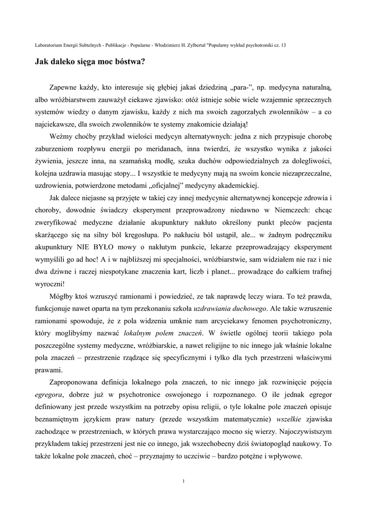 Laboratorium Energii Subtelnych - Publikacje - Popularne - Włodzimierz H. Zylbertal "Popularny wykład psychotroniki cz. 13 Jak daleko sięga moc bóstwa? Zapewne każdy, kto interesuje się głębiej jakaś dziedziną „para-”, np. medycyna naturalną, albo wróżbiarstwem zauważył ciekawe zjawisko: otóż istnieje sobie wiele wzajemnie sprzecznych systemów wiedzy o danym zjawisku, każdy z nich ma swoich zagorzałych zwolenników – a co najciekawsze, dla swoich zwolenników te systemy znakomicie działają! Weźmy choćby przykład wielości medycyn alternatywnych: jedna z nich przypisuje chorobę zaburzeniom rozpływu energii po meridanach, inna twierdzi, że wszystko wynika z jakości żywienia, jeszcze inna, na szamańską modłę, szuka duchów odpowiedzialnych za dolegliwości, kolejna uzdrawia masując stopy... I wszystkie te medycyny mają na swoim koncie niezaprzeczalne, uzdrowienia, potwierdzone metodami „oficjalnej” medycyny akademickiej. Jak dalece niejasne są przyjęte w takiej czy innej medycynie alternatywnej koncepcje zdrowia i choroby, dowodnie świadczy eksperyment przeprowadzony niedawno w Niemczech: chcąc zweryfikować medyczne działanie akupunktury nakłuto określony punkt pleców pacjenta skarżącego się na silny ból kręgosłupa. Po nakłuciu ból ustąpił, ale... w żadnym podręczniku akupunktury NIE BYŁO mowy o nakłutym punkcie, lekarze przeprowadzający eksperyment wymyślili go ad hoc! A i w najbliższej mi specjalności, wróżbiarstwie, sam widziałem nie raz i nie dwa dziwne i raczej niespotykane znaczenia kart, liczb i planet... prowadzące do całkiem trafnej wyroczni! Mógłby ktoś wzruszyć ramionami i powiedzieć, ze tak naprawdę leczy wiara. To też prawda, funkcjonuje nawet oparta na tym przekonaniu szkoła uzdrawiania duchowego. Ale takie wzruszenie ramionami spowoduje, że z pola widzenia umknie nam arcyciekawy fenomen psychotroniczny, który moglibyśmy nazwać lokalnym polem znaczeń. W świetle ogólnej teorii takiego pola poszczególne systemy medyczne, wróżbiarskie, a nawet religijne to nic innego jak właśnie lokalne pola znaczeń – przestrzenie rządzące się specyficznymi i tylko dla tych przestrzeni właściwymi prawami. Zaproponowana definicja lokalnego pola znaczeń, to nic innego jak rozwinięcie pojęcia egregora, dobrze już w psychotronice oswojonego i rozpoznanego. O ile jednak egregor definiowany jest przede wszystkim na potrzeby opisu religii, o tyle lokalne pole znaczeń opisuje beznamiętnym językiem praw natury (przede wszystkim matematycznie) wszelkie zjawiska zachodzące w przestrzeniach, w których prawa wystarczająco mocno się wierzy. Najoczywistszym przykładem takiej przestrzeni jest nie co innego, jak wszechobecny dziś światopogląd naukowy. To także lokalne pole znaczeń, choć – przyznajmy to uczciwie – bardzo potężne i wpływowe. 1 Laboratorium Energii Subtelnych - Publikacje - Popularne - Włodzimierz H. Zylbertal "Popularny wykład psychotroniki cz. 13 Mechanizm działania lokalnego pola znaczeń nie jest dziś do końca rozpoznany; najbardziej obiecująca hipoteza głosi, że ma ono charakter jednocześnie informacyjny i energetyczny. Informacja to prawa rządzące tym, co się dzieje wewnątrz pola (np. przekonanie, że taki a nie inny punkt na skórze człowieka odpowiada akurat za żołądek a nie za np. nerki), zaś energia to czynnik sprawczy, niejako pilnujący, żeby prawa były przestrzegane. W psychotronice doskonale znany jest fenomen sterowania energiami subtelnymi (niefizykalnymi) przez informację, np. siłą myśli człowieka. Przy odpowiednim skupieniu tej infoenergii potrafi ona oddziaływać i na świat fizyczny, stąd wszelkie zjawiska "psi". Lokalne pole znaczeń tworzy się tam, gdzie kształtująca energię informacja jest względnie trwała i niezależna od chwilowych zaburzeń info-energetycznych, a ponadto zapewniony jest stały dopływ energii tworzącej pole. Aby te warunki były spełnione potrzeby jest generator pola. Można go skonstruować na wiele sposobów. Jednym z nich jest opisywana już wcześniej na tych łamach megaprojekcja (skojarzenie treści psychicznych z symbolem). Inny to stworzenie silnego centrum propagowania utrzymującej pole informacji - wpływowego ośrodka opiniotwórczego i/lub szkoleniowego. Można użyć także pamięci materii, choćby posągu bóstwa, lub poświęconej mu budowli; jeśli materię rzeźb lub murów nasyci się informacją o mocach i kompetencjach bóstwa, powstanie lokalne pole znaczeń i związany z nim kult. Nawet nie zawsze potrzebny jest materialny przedmiot emitujący informację w otoczenie, czasem wystarczy myślokształt, czyli forma subtelna (w praktyce najczęściej astralna lub mentalna) która zgromadzi informację w stopniu wystarczającym do ukształtowania energii i tym samym utworzenia lokalnego pola znaczeń. Jeszcze inna metoda wytwarzania lokalnego pola znaczeń, to użycie istniejącego już generatora, który przystosowuje się do nowych zadań. Przykład tej ostatniej techniki widać na rysunku 1: Rys 1 2 Laboratorium Energii Subtelnych - Publikacje - Popularne - Włodzimierz H. Zylbertal "Popularny wykład psychotroniki cz. 13 archetypowe treści liczb, a raczej ich graficzne wyobrażenia mogą tworzyć lokalne pole znaczeń raz dla religii (krzyż, Oko Opatrzności, Gwiazda Dawida), raz dla systemu psychologicznego (symbol enneagramu), kiedy indziej dla ezoteryki (pentagram), dla „ogólnej teorii wszystkiego” (Ba-Gua), dla zbiorowości ludzkiej (krzyż maltański), czy nawet dla ścisłych rozważań matematycznych (koło i symbol nieskończoności). Zastosowanie bardziej praktyczne – pomiarowe – uwidacznia fot 1. Fot. 1 Jest to nic innego jak materialna realizacja znanego ze szkolnej fizyki wzoru na siłę przyciągania się ciał w polu grawitacyjnym lub elektrostatycznym. Odsuwając kulę zasilaną energią subtelną od kuli odbiorczej zmniejsza się natężenie ene