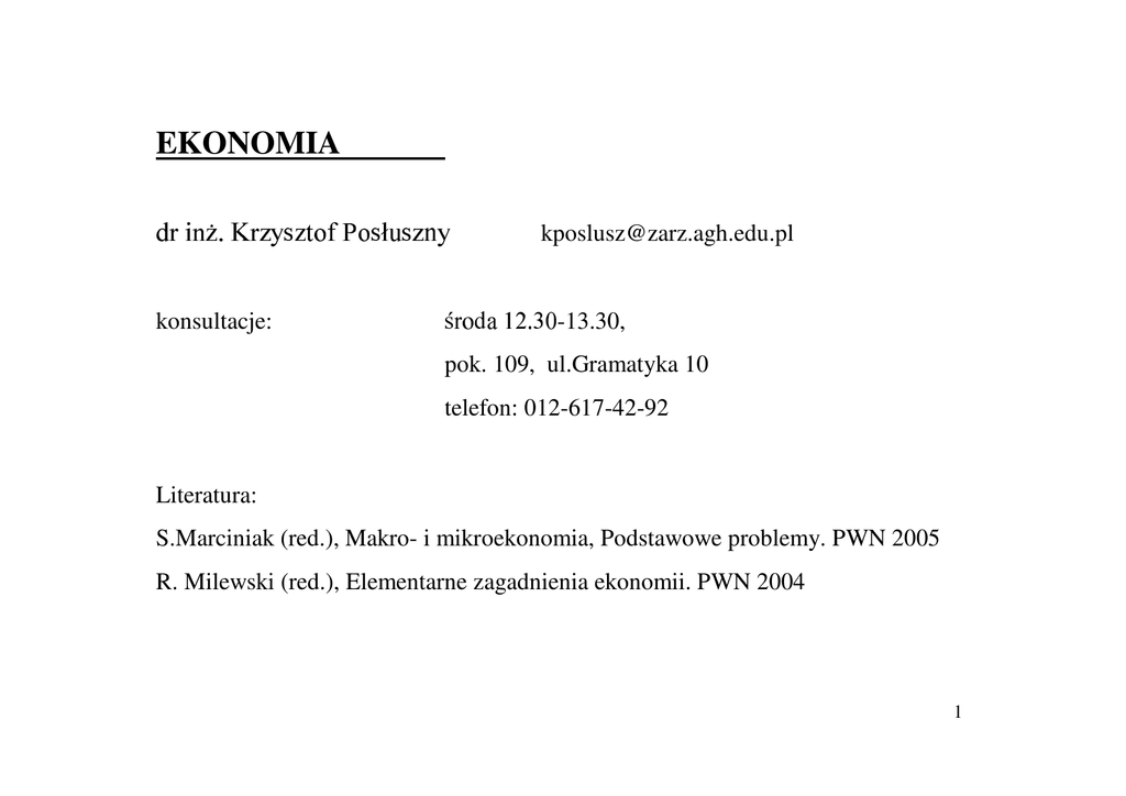konsultacje: ! [email protected] EKONOMIA -13.30, pok. 109, ul.Gramatyka 10 telefon: 012-617-42-92 Literatura: S.Marciniak (red.), Makro- i mikroekonomia, Podstawowe problemy. PWN 2005 R. Milewski (red.), Elementarne zagadnienia ekonomii. PWN 2004 1 12. Ì 13. Gospodarka otwarta. Ð à Ñ á Û Ú Ü É ÈÇ Æ Í È ÅÄ Æ Ëà ΠÀ À À ÅÄ Ç Â ËgÊ ÅÉ ÈÇ © ¦ · «ª ¨ ±º ¹ ´± ¨¸ ¯ ¬ « ¯ ¨± ´¶ ¥ ®¦ ® § ® ¥ ¯ ¬ ¨ ¨±¬ ¯ ¥ ° ¨ ®¦ $«ª © ¨ @ ¥$¤ §¦ £ ¢¡ } } $ } ~ } {| zyw xw uv r gts q Rynek pracy. Bezrobocie. Þß Ø ÐÑ Ô Ý Æ Æ ¾ $opn 5. ÕÙ Ø Û Ú Ü À ÅÄ µ¦ ¨±¬ ´± 4. Ì ×ÐÑ À Ä ÁÂà ³¯ ÓÒ ÕgÔ ÐÖ g¿À¾ 11. ÕÙØ Ñ 10. ® 6. 9. ² a a mh l j dk [ h \ \ i j hi gfe $cdb ]^ `_ \ \Z[ XW YK M V$UT 3. ¨± P RQ N P O @ MN SK J LK IH CB F E G DC $BA 2. » ½¼ ) 6= <; 7 ;: 9 87 * 56 4 &3 * < ?@9 > 2 2, . ' + $*" 0 ) 1 ( */ * - & &. # - , + % ) *) (' & %$#" 1. $ÐÑÏ 352*5$0:<.à$'Ï: 7. Gospodarka. Pomiar, czynniki wzrostu i rozwoju gospodarczego. 8. Inflacja i jej pomiar. 2 Funkcje ekonomii: 4 ( 6 . 1 , & +' *)( )+ 5 " " 5 " 6 , &' $%# 9 0 " ' 1! & ;' + 2 +' )( ) 6 . 1 , & )( ' - , -( & '( / ' 6 7$%# 42 &- > 0 " : 5 5 " 1 5 ); +- & ' = $ - " ) & ! - 2 4/ '( 0 . ' 1 0 / ' 6 < ' " $%# ; 2 , &2 ! -( $ 5 " 1! +' / 9 , 14 "5 ' 3 $ +2 01+ / . &- +' *)( 9 - &' 8 $ % "# ! - " & - 04 0 7! 1 6 ( ) 3 +2 / . 7- 2 '( / + $ % # ' 6 1 )( &' Zasoby: '( / ' 6 ú ú ü ù ù ø þ û ù ü ÷ þ þ ÷ø þ ø û ÿ þ úþûüý ÷øù Przedmiot ekonomii: optymalna alokacja rzadkich zasobów, poszukiwanie praw ekonomicznych hardware/software) poznawcza (wiedza o zjawiskach), aplikacyjna (wiedza o sposobach realizacji celów). 3 ã ò õ ï ö ôì í óñ òñ ð ïî íì êë ã â èé è ç æå äã â ¡± ¨ ´¦ ª ¬ ± ¡ ¨ ¦ ¦ ¦ ¦ ª ¬ ¨ ¬ ¨ ¦ ¡ ° % « ¯ ¦ ® ¡ ¬ ª ¨ « ¨ ¦ § ¦ ¤ £ ¥ ¢ ¡ c ¡ ¬ © ª ¡ ¨ v i s s s t v ~{ % r kl kj l k ~ ij ks u x x w v ~ | { p { | s ijo ~s {~ t l{ r k lu x i s i s v { z o sy r~ ls ~ jo m ~ }~ | l r ijo w l p o s i *ut l r ijo q p o mn T Q V Z Y _ ^ ^ W S S W T h Y _ RV T ` _ Z Z Y [ d [ f [ g [ ] R ] Z SU ^ ` WT ^ UT ` Q 4 _ R SR SU V b Z c f [ [de T SR ] ` a] R SR _ ^Y ^ W Q [ ] \ [ WV W S W YZ X U WUVT SQR - ¢ ¦ ³ © ¬ ² © ¦ « « ¤ ¤ ³ ² © ± Modele ekonomiczne: l klij Prawa ekonomiczne: @ D O F P L NI J M@ L@ K F JI GH @ ? EF E D CB A@ ? ¾ É ¹ ¶ È · Ê Å Í » È É¸¹ ¶ » ¾Ö ¶ Å ¸¹ µ Æ ¼ ɯĹ ¶Ä ¸ Ï Ò¹ Ç Â º¶ ¾ Ò · À É - i mikro- 5 Î ¾È ¼ Ë È ¼ ¹ ¹ Æ » » · » È » ɶ Ê Å Ê Ê Å ¾ Á Í » È · à » ÆÄ¹ Ó ºÆ Ï µ º Ê º Ê Æ » » · ¶ ·  ¼ Á Æ » ¸ É ¼ º¶ Ò Ê À ¸¹ à » º Ê Â ¹ » À Ï Æ ¼ ¼ » Ï » · Ñ Ç » Ð · ¸  à µ º¶ ¾ Ð º ¾ ¶ ÉÆÄ ¶Ä Æ ¼ Å Æ µ · ¶ µ Ê » ¶ ¶ ¼ ¶ Ë ¶¹ Ë ¶ µ ¹ É ¶ Å ¸¹ À Ĺ Æ » ¼ ¶ Å ¶ ½ ¼ ¹ ¶Ë º¶ Ê Ò ÉÆÄ Ì Ð Ó ¶ » c Ï À Ò Ä Ð Ò Ï ¼ Ç · º  Á · Ò Å É ¹ Ñ Á ¸ Ì ¼ ¹ ÉÆ ¹ · » Í Ð ¶ ¾Ë º Á · » ½ Ä » É ¹Â Æ À É À ¾É Ê º Ï º Å Í » ¹ À Æ ÊÉ ¸  ÃË Á Ï % Ì º¾Ë ¹ È Å º¹ É À ¶ Å ¸¹ À Ĺ ÍÎ · É ¶ Å ¸¹ À ¹ Ì Ä ¾Ë ÊÉ º ºÂ ¹ ¼ Æ ÆÈ Ç Æ Æ » ¼ ¶ Å ¶ ½ º ¶ µ º » · à ¼ ¿ ÃÄ » À ¹ Á ¹ ½ À ¸¹ À » ¶ µ ¿ ¾ ½ ¼ ¹ ¼ » ¸¹ · pozytywna (opisowa) – jak jest i dlaczego normatywna – º¶ Ê Ò ¾ ¸¹ ¹ É ¶ µ ÆÄ Â Ï ¶Ë ÔÇ ¼ » ºÊ¹ ¼ ÆÄ¹É ¶Ä Ï Æ » Ë ½ ¹ É º¶ Ê Æ » ¼ º¶ Ì ¶ ¼ Makroekonomia: Ê Ê¹ Æ ½ Mikroekonomia: ¹ ¶Ë Õ Ekonomia: À ½ Mezoekonomia: ¹ MIKROEKONOMIA i MAKROEKONOMIA i PROCES GOSPODAROWANIA Produkcja, dystrybucja, konsumpcja w celu zaspokojenia potrzeb. Charakter potrzeb: å ä Ü Û ï ê Ø Ù Ü æ ã ß âî ì î í Ü ãë Ù â í Ü ì ã Û ï ê Ù è â Ù á è Ý æÙ ê ograniczone co do jednorazowej konsumpcji komplementarne – – powtarzalne ã Þ Û Ú Üé è Þ Þ Û ã æ Þ æ âÛ Ü Ù á Þç ã Ü ã æ • • • • egzystencjalny, socjalny, konsumpcyjny i produkcyjny, indywidualny i zbiorowy. Þ Þ âáà ß Ü Û Ú Þ Û Ú Ý Ü × ÙØ • • • 6 PROCES GOSPODAROWANIA ñ ð rodki zaspokojenia potrzeb maj charakter materialny i niematerialny: ñ ò ñ ò õ ý ñþ ú ò ÿ þ ý þ ý ü û÷ ú ù ø õ ÷ö ñ ô ñ ó s nimi dobra rzadkie czyli wyst puj ce w ograniczonej ilo ci: produkty lub us ugi oraz dobra wolne: nadaj ce si wprost do wykorzystania i nie b d ce wynikiem produkcji przekszta caj cej otoczenie ñ ú ô ÿ þ û ÷ ô ó ó ô pracy, czyli wiadomej i celowej dzia alno ÿ ò Produkcja jest mo liwa dzi ki wykorzystaniu czynników produkcji: ziemi (zasobów naturalnych) ò ó Niektórzy wskazuj jeszcze na przedsi biorczo ñ ô ó ô ó ô kapita u, czyli rodków potrzebnych do prowadzenia dzia alno ci (kapita rzeczowy i finansowy). i innowacje jako czynniki produkcji. 7 $ ( B A # ( # - ) # ! # ! # ( ( ) " ) # - ! $ # % $ ( ) + + ' * # , # # # # ! "! ( ( "' & $ # % PROCES GOSPODAROWANIA ukty A i B. o dukcyjnych. B a*A + b*B = 100 8 A