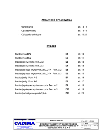 ZAWARTOŚĆ OPRACOWANIA - Uprawnienia str. 2 - 3 - Opis techniczny str. 4 - 9 - Obliczenia techniczne str. 10-20 RYSUNKI Rozdzielnica RA2 E1 str. 10 Rozdzielnica RS2 E2 str. 11 Instalacja oświetlenia Pom. A-2 E3 str. 12 Instalacja oświetlenia Pom. A-3 E4 str. 13 Instalacja gniazd wtykowych 220V, 24V Pom. A-2 E5 str. 14 Instalacja gniazd wtykowych 220V, 24V Pom. A-3 E6 str. 15 Instalacja siły Pom. A-2 E7 str. 16 Instalacja siły Pom. A-3 E8 str. 17 Instalacja połączeń wyrównawczych Pom. A-2 E9 str. 18 Instalacja połączeń wyrównawczych Pom. A-3 E10 str. 19 Instalacje elektryczne przekrój A-A E11 str. 20 Nr proj.: OPIS TECHNICZNY 67-200 Głogów ul. Oriona 1/13 tel. 0604 264 328 [email protected] www.cadima.pl BUDYNEK WARSZATÓW GŁOGOWSKIEGO CENTRUM KSZTAŁCENIA PRAKTYCZNEGO W GŁOGOWIE POM. A-2, A-3 PM-03/11/2008 Nr rys.: Data: Opr.: 000 2008.11.10 Paweł Macher Zmiana: A 4 Strona.: OPIS TECHNICZNY 1. Przedmiot opracowania Przedmiotem opracowania jest projekt techniczny wewnętrznych instalacji elektrycznych w pomieszczeniach A-2, A-3 Warszatów Głogowskiego Centrum Kształcenia Praktycznego w Głogowie ul. Piotra Skargi 29 Dz. nr 169. 2. Podstawa opracowania - Umowa Inwentaryzacja instalacji elektrycznych Uzgodnienia z użytkownikiem Obowiązujące przepisy i normy 3. Zakres opracowania W zakres projektu wchodzi : - zasilanie i urządzenia rozdzielcze instalacje oświetleniowe wewnętrzne instalacja gniazd wtykowych 220V, 24V instalacja siłowa instalacje ochronne od porażeń elektrycznych instalacje połączenia wyrównawcze ochrona przeciwprzepięciowa 4. Charakterystyka techniczna - Sieć zasilająca kablowa System ochrony od porażeń Moc zapotrzebowana - - Prąd szczytowy - 400/230 V układ TN-S Pz = 29,60 kW Pom. A-2, Pz = 27,72 kW Pom. A-3, Isz = 19,86 A Pom. A-2 Isz = 18,60 A Pom. A-3 5. Zasilanie i pomiar energii elektrycznej Zasilanie rozdzielnic pozostaje bez zmian - wg projektu E-2001-06-5. Pomiar energii elektrycznej istniejący , zlokalizowany w piwnicy , rozdzielnica TL . Główny wyłącznik pożarowy - WG Istniejący zlokalizowany przy wejściach głównych do budynku – wg projektu E-2001-06-5. Nr proj.: OPIS TECHNICZNY 67-200 Głogów ul. Oriona 1/13 tel. 0604 264 328 [email protected] www.cadima.pl BUDYNEK WARSZATÓW GŁOGOWSKIEGO CENTRUM KSZTAŁCENIA PRAKTYCZNEGO W GŁOGOWIE POM. A-2, A-3 PM-03/11/2008 Nr rys.: Data: Opr.: 000 2008.11.10 Paweł Macher Zmiana: A 5 Strona.: 6. Urządzenia rozdzielcze i wewnętrzne linie zasilające Rozdzielnia RA2, RS2 Dla potrzeb rozdziału energii elektrycznej zaprojektowano nową rozdzielnicę RS2 . Ze względu na zmianę funkcjonalna pomieszczenia A-2 zaprojektowano nową rozdzielnicę RA2. Dla zasilania odbiorów obiektu projektuje się montaż n/w urządzeń rozdzielczych zasilanych z rozdzielni głównej RG. Projektowane tablice rozdzielcze wykonać z zastosowaniem typowych obudów naściennych dla osprzętu modułowego prod. Hager : - Tablica rozdzielcza RS2 – pomieszczenia A-3 - Tablica rozdzielcza RA2 – pomieszczenia A-2 Wewnętrzne linie zasilające Sieć rozdzielczą przewidziano w układzie TN-S z zastosowaniem 5-żyłowych kabli i przewodów z żyłami miedzianymi. W obiekcie projektuje się niżej wymienione wewnętrzne linie zasilające ( wlz ) : - RG – RA2 – typ YKY 5*25 mm2 - RG – RS2 – typ YKY 5*25 mm2 Wewnętrzne linie zasilające układać na korytkach kablowych. Szczegóły połączeń i przekroje w części rysunkowej projektu. 7. Instalacje oświetleniowe – wewnętrzne Na obiekcie projektuje się niżej wymienione oświetlenie : - oświetlenie podstawowe - oświetlenie zewnętrzne Natężenie oświetlenia na obiekcie dobrano na podstawie normy PN-84/E-02033 - warsztat – 500 lx - komunikacja, węzły sanitarne – 100 lx Oświetlenie podstawowe - w pomieszczeniu warsztatów projektuje się oprawy f-my LUG typ ATLANTYK IP 65 2x58W mocowane za pomocą linek do stropu na wys. H=4,70m. Oświetlenie stołów roboczych przez zastosowanie opraw f-my LUG typ LUGLINE 1x36W mocowanych do ściany. w obiekcie montować osprzęt instalacyjny produkcji Hager-Polo lub Berker. w pomieszczeniach technologicznych, technicznych zastosować osprzęt hermetyczny min. IP44. Sterowanie oświetlenia podstawowego w budynku realizowane będzie następująco : - załączanie i wyłączanie oświetlenia odbywać się będzie ręcznie za pomocą włączników. Oświetlenie zewnętrzne – na budynku Oświetlenie zewnętrzne realizowane będzie za pomocą opraw f-myAGA LIGHT typ OLYMPIA 1 o mocy 150W montowanych na zewnętrznych ścianach budynku. Sterowanie oświetlenia elewacji frontowych realizowane będzie automatycznie za pomocą czujnika zmierzchowego. Nr proj.: OPIS TECHNICZNY 67-200 Głogów ul. Oriona 1/13 tel. 0604 264 328 [email protected] www.cadima.pl BUDYNEK WARSZATÓW GŁOGOWSKIEGO CENTRUM KSZTAŁCENIA PRAKTYCZNEGO W GŁOGOWIE POM. A-2, A-3 PM-03/11/2008 Nr rys.: Data: Opr.: 000 2008.11.10 Paweł Macher Zmiana: A 6 Strona.: Zastosowane typy i przekroje przewodów pokazano na schematach ideowych. Przewody układać pod tynkiem oraz w korytkach i w rurkach instalacyjnych. W rurkach instalacyjnych oraz na korytkach układać przewody okrągłe, natomiast w tynku przewody płaskie. Rozmieszczenie opraw pokazano na rysunkach. W obiekcie montować osprzęt instalacyjny produkcji Hager-Polo lub Berker. W pomieszczeniach technologicznych, technicznych zastosować osprzęt hermetyczny min. IP44. 8. Instalacja gniazd wtykowych Na obiekcie projektuje się montaż : - gniazda wtykowe ogólnego przeznaczenia - gniazda wtykowe zasilające urządzenia technologiczne 24 V - gniazda wtykowe zasilające urządzenia technologiczne 230V - gniazda wtykowe zasilające urządzenia technologiczne 400V W obiekcie montować osprzęt instalacyjny produkcji Hager-Polo lub Berker. W pomieszczeniach technologicznych, technicznych i sanitariatach zastosować osprzęt hermetyczny min. IP44. Zestawy gniazd 2x230V, 1x400V, 1x24V m