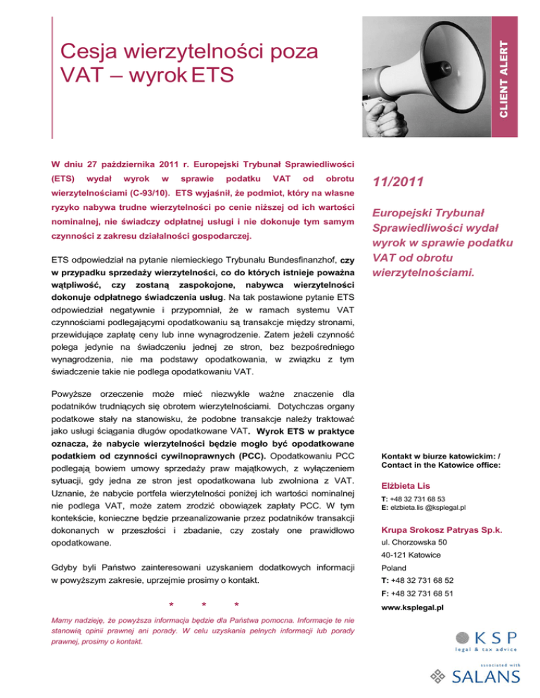 Cesja wierzytelności poza VAT – wyrok ETS W dniu 27 października 2011 r. Europejski Trybunał Sprawiedliwości (ETS) wydał wyrok w sprawie podatku VAT od obrotu wierzytelnościami (C-93/10). ETS wyjaśnił, że podmiot, który na własne ryzyko nabywa trudne wierzytelności po cenie niższej od ich wartości nominalnej, nie świadczy odpłatnej usługi i nie dokonuje tym samym czynności z zakresu działalności gospodarczej. ETS odpowiedział na pytanie niemieckiego Trybunału Bundesfinanzhof, czy w przypadku sprzedaży wierzytelności, co do których istnieje poważna 11/2011 Europejski Trybunał Sprawiedliwości wydał wyrok w sprawie podatku VAT od obrotu wierzytelnościami. wątpliwość, czy zostaną zaspokojone, nabywca wierzytelności dokonuje odpłatnego świadczenia usług. Na tak postawione pytanie ETS odpowiedział negatywnie i przypomniał, że w ramach systemu VAT czynnościami podlegającymi opodatkowaniu są transakcje między stronami, przewidujące zapłatę ceny lub inne wynagrodzenie. Zatem jeżeli czynność polega jedynie na świadczeniu jednej ze stron, bez bezpośredniego wynagrodzenia, nie ma podstawy opodatkowania, w związku z tym świadczenie takie nie podlega opodatkowaniu VAT. Powyższe orzeczenie może mieć niezwykle ważne znaczenie dla podatników trudniących się obrotem wierzytelnościami. Dotychczas organy podatkowe stały na stanowisku, że podobne transakcje należy traktować jako usługi ściągania długów opodatkowane VAT. Wyrok ETS w praktyce oznacza, że nabycie wierzytelności będzie mogło być opodatkowane podatkiem od czynności cywilnoprawnych (PCC). Opodatkowaniu PCC podlegają bowiem umowy sprzedaży praw majątkowych, z wyłączeniem sytuacji, gdy jedna ze stron jest opodatkowana lub zwolniona z VAT. Uznanie, że nabycie portfela wierzytelności poniżej ich wartości nominalnej nie podlega VAT, może zatem zrodzić obowiązek zapłaty PCC. W tym Kontakt w biurze katowickim: / Contact in the Katowice office: Elżbieta Lis T: +48 32 731 68 53 E: elzbieta.lis @ksplegal.pl kontekście, konieczne będzie przeanalizowanie przez podatników transakcji dokonanych w przeszłości i zbadanie, czy zostały one prawidłowo Krupa Srokosz Patryas Sp.k. opodatkowane. ul. Chorzowska 50 40-121 Katowice Gdyby byli Państwo zainteresowani uzyskaniem dodatkowych informacji Poland w powyższym zakresie, uprzejmie prosimy o kontakt. T: +48 32 731 68 52 F: +48 32 731 68 51 * * * Mamy nadzieję, że powyższa informacja będzie dla Państwa pomocna. Informacje te nie stanowią opinii prawnej ani porady. W celu uzyskania pełnych informacji lub porady prawnej, prosimy o kontakt. Warsaw 5074286.1 www.ksplegal.pl