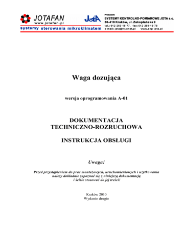 Waga dozująca wersja oprogramowania A-01 DOKUMENTACJA TECHNICZNO-ROZRUCHOWA INSTRUKCJA OBSŁUGI Uwaga! Przed przystąpieniem do prac montaŜowych, uruchomieniowych i uŜytkowania naleŜy dokładnie zapoznać się z niniejszą dokumentacją i ściśle stosować do jej treści! Kraków 2010 Wydanie drugie Instalacja elektryczna, do której jest dołączone urządzenie MUSI POSIADAĆ zgodne z aktualnymi przepisami, sprawne technicznie obwody ochrony przeciwporaŜeniowej. Musi posiadać takŜe przynajmniej drugi stopień ochrony przeciwprzepięciowej. Urządzenie jest przeznaczone do pracy ciągłej i nie posiada wyłącznika zasilania. JeŜeli zachodzi potrzeba wyłączania urządzenia, naleŜy zainstalować wyłącznik zewnętrzny. UWAGA !!! Wszelkie prace związanie z montaŜem i uruchomieniem urządzenia powinna wykonywać osoba posiadająca odpowiednie kwalifikacje i uprawnienia. Jakiekolwiek elektryczne czynności łączeniowe oraz prace mechaniczne (elektromechaniczne) przy urządzeniu Z DOŁĄCZONYM ZASILANIEM SĄ NIEDOPUSZCZALNE. GROśĄ PORAśENIEM PRĄDEM ELEKTRYCZNYM – ZAGROśENIEM ZDROWIA LUB śYCIA Przed przystąpieniem do prac wyłączyć napięcie zasilania, wykonać widoczną przerwę w obwodzie elektrycznym zasilania urządzenia i upewnić się o braku napięcia. Instalacja elektryczna, do okresowych przeglądów i badań! której jest dołączone urządzenie wymaga Spis treści 1. Zastosowanie urządzenia........................................................................................ 6 2. Wskazówki bezpieczeństwa.................................................................................... 6 3. Transport, magazynowanie.................................................................................... 7 4. Dane techniczne i wymagania sprzętowe.............................................................. 7 5. MontaŜ i dołączenie regulatora do instalacji elektrycznej ................................. 7 6. Przed pierwszym uruchomieniem ......................................................................... 9 7. Obsługa urządzenia............................................................................................... 10 7.1. Załączenie zasilania............................................................................................... 10 7.2. Znaczenie lampek kontrolnych i wyświetlanych symboli ................................. 11 7.3. Podstawowe funkcje klawiatury.......................................................................... 11 7.4. Kody dostępu ......................................................................................................... 12 7.5. MENU urządzenia................................................................................................. 14 7.6. Poruszanie się po MENU urządzenia.................................................................. 18 7.7. MENU podglądu stanu urządzenia ..................................................................... 18 7.8. MENU kodów dostępu.......................................................................................... 20 7.9. MENU nastaw systemu......................................................................................... 21 7.10. MENU Wagi ....................................................................................................... 22 7.11. MENU Silosy....................................................................................................... 23 7.12. MENU Receptury............................................................................................... 24 8. Gwarancja.............................................................................................................. 25 9. Zasady serwisowania urządzeń systemu sterowania mikroklimatem oraz ich instalacji elektrycznej ........................................................................................... 26 Waga dozująca UWAGA! Wskazuje na moŜliwość zagroŜenia Ŝycia lub uszkodzenie urządzenia. Przed przystąpieniem do pracy naleŜy zapoznać się z instrukcją. WAśNE! Wskazują na waŜną lub poŜyteczną informację. 1. Zastosowanie urządzenia Waga dozująca WGJ-S słuŜy do automatycznego przygotowania mieszanek paszowych na podstawie zaprogramowanych receptur (maks. 16). Waga moŜe obsługiwać do 8 silosów (podajników) oraz do 8 wag, wyposaŜonych łącznie, w maksymalnie 16 modułów pomiarowych. System składa się z pulpitu z wyświetlaczem LCD, modułów pomiarowych (waŜących) i modułu przekaźników do sterowania pracą podajników. Pulpit umoŜliwia pełną kontrolę procesu nawaŜania, w tym takŜe sygnalizację błędów spowodowanych np. nieprawidłową pracą elementów wykonawczych. Posiada takŜe funkcję rejestratora, zapisując na karcie SD informacje o przebiegu waŜenia, dzięki czemu moŜliwe jest odtworzenie dokładnego składu przygotowanej mieszanki z datą i godziną. Pulpit wyposaŜony jest w interfejs RS485 i USB do połączenia z komputerem. Dzięki zastosowaniu modułów pomiarowych przetwarzających sygnał z mostków tensometrycznych na postać cyfrową, moŜliwe jest oddalenie pulpitu od wagi, bez utraty dokładności, nawet do 500m. Zakres wskazań i rejestracji to 3000,0kg z rozdzielczością 0,1kg (moŜliwa zmiana zakresu na zamówienie). Zastosowanie niezaleŜnych modułu pomiarowego dla kaŜdego mostka daje dodatkowo moŜliwość łatwej diagnostyki uszkodzeń, a co za tym idzie szybkiego serwisu. 2. Wskazówki bezpieczeństwa Urządzenie zostało skonstruowany zgodnie z powszechnie uznawanymi wymogami bezpieczeństwa. Nieprzestrzeganie tych reguł moŜe spowodować zagroŜenie Ŝycia lub zdrowia osób, zwierząt lub straty materialne. Regulator jest przeznaczony do montaŜu, uruchomienia, obsługi (przeglądy techniczne urządzeń i instalacji elektrycznej) i usuwania awarii przez osoby posiadające wymagane przez przepisy państwowe uprawnienia do prac elektrycznych z zakresu wymagan