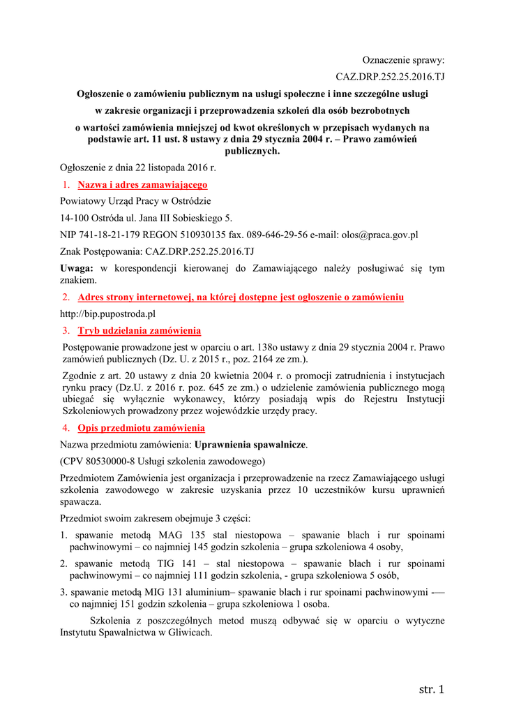 Oznaczenie sprawy: CAZ.DRP.252.25.2016.TJ Ogłoszenie o zamówieniu publicznym na usługi społeczne i inne szczególne usługi w zakresie organizacji i przeprowadzenia szkoleń dla osób bezrobotnych o wartości zamówienia mniejszej od kwot określonych w przepisach wydanych na podstawie art. 11 ust. 8 ustawy z dnia 29 stycznia 2004 r. – Prawo zamówień publicznych. Ogłoszenie z dnia 22 listopada 2016 r. 1. Nazwa i adres zamawiającego Powiatowy Urząd Pracy w Ostródzie 14-100 Ostróda ul. Jana III Sobieskiego 5. NIP 741-18-21-179 REGON 510930135 fax. 089-646-29-56 e-mail: [email protected] Znak Postępowania: CAZ.DRP.252.25.2016.TJ Uwaga: w korespondencji kierowanej do Zamawiającego należy posługiwać się tym znakiem. 2. Adres strony internetowej, na której dostępne jest ogłoszenie o zamówieniu http://bip.pupostroda.pl 3. Tryb udzielania zamówienia Postępowanie prowadzone jest w oparciu o art. 138o ustawy z dnia 29 stycznia 2004 r. Prawo zamówień publicznych (Dz. U. z 2015 r., poz. 2164 ze zm.). Zgodnie z art. 20 ustawy z dnia 20 kwietnia 2004 r. o promocji zatrudnienia i instytucjach rynku pracy (Dz.U. z 2016 r. poz. 645 ze zm.) o udzielenie zamówienia publicznego mogą ubiegać się wyłącznie wykonawcy, którzy posiadają wpis do Rejestru Instytucji Szkoleniowych prowadzony przez wojewódzkie urzędy pracy. 4. Opis przedmiotu zamówienia Nazwa przedmiotu zamówienia: Uprawnienia spawalnicze. (CPV 80530000-8 Usługi szkolenia zawodowego) Przedmiotem Zamówienia jest organizacja i przeprowadzenie na rzecz Zamawiającego usługi szkolenia zawodowego w zakresie uzyskania przez 10 uczestników kursu uprawnień spawacza. Przedmiot swoim zakresem obejmuje 3 części: 1. spawanie metodą MAG 135 stal niestopowa – spawanie blach i rur spoinami pachwinowymi – co najmniej 145 godzin szkolenia – grupa szkoleniowa 4 osoby, 2. spawanie metodą TIG 141 – stal niestopowa – spawanie blach i rur spoinami pachwinowymi – co najmniej 111 godzin szkolenia, - grupa szkoleniowa 5 osób, 3. spawanie metodą MIG 131 aluminium– spawanie blach i rur spoinami pachwinowymi -–– co najmniej 151 godzin szkolenia – grupa szkoleniowa 1 osoba. Szkolenia z poszczególnych metod muszą odbywać się w oparciu o wytyczne Instytutu Spawalnictwa w Gliwicach. str. 1 Każda z części stanowi osoby przedmiot zamówienia. Na każdą część składa się osobną ofertę. Wykonawca w ramach przedmiotu zamówienia między innymi musi zapewnić: 1. Osiągnięcie 100% wskaźnika uzyskania przez absolwentów kursu kwalifikacji zawodowych (wszyscy uczestnicy kursu muszą zdać egzamin państwowy z wynikiem pozytywnym); 2. Kadrę dydaktyczną posiadającą kwalifikacje zawodowe odpowiednie do rodzaju prowadzonego kształcenia. 3. Odpowiednie pomieszczenia wyposażone w sprzęt i pomoce dydaktyczne umożliwiające prawidłową realizację kształcenia. 4. Zabezpieczyć odpowiednie warunki oraz maszyny i urządzenia umożliwiające prawidłową realizację kształcenia praktycznego. 5. Bezpieczne i higieniczne warunki pracy i nauki. 6. Nadzór służący podnoszeniu jakości prowadzonego kształcenia. 7. Dostępność szkolenia dla osób niepełnosprawnych. Wykonawca również musi: 1. Uczestnikom w trakcie zajęć zapewnić poczęstunek w formie: kawy, herbaty, wody mineralnej i zimnych napojów, kanapek, itp. 2. Wyposażyć uczestników w niezbędną odzież ochronną do zajęć praktycznych. 3. Wyposażyć uczestników w materiały dydaktyczne, biurowe, tj. długopisy, notatniki, ołówki, gumki do ścierania, podręczniki, itp. Wszystkie materiały dydaktyczne i biurowe uczestnicy muszą otrzymać na własność. 4. Uczestnikom przygotować identyfikatory. 5. Prowadzić stały nadzór nad przebiegiem kursu. 6. Prowadzić dokumentację księgową kursu w postaci: faktur zakupu, umów zlecenia, rachunków, itp. poświadczających poniesione wydatki. 7. Prowadzić dokumentację przebiegu kursu w postaci: dzienników zajęć wypełnianych codziennie w oparciu o realizowany program zajęć i frekwencję, imiennej listy obecności, list potwierdzonych przez uczestników otrzymania materiałów biurowych, dydaktycznych, odzieży ochronnej, arkuszy i protokołów z egzaminów, itp. 8. Absolwentom, którzy ukończyli kurs zaświadczenia o ukończeniu kursu wg wzoru określonego w Załączniku nr 5 Rozporządzenia Ministra Edukacji Narodowej z dnia 16 października 2012 r. zmieniające rozporządzenie w sprawie kształcenia ustawicznego w formach pozaszkolnych (Dz. U. z 2014 r. poz. 622) oraz suplement zawierający następujące informacje: okres trwania szkolenia, tematy i wymiar godzin zajęć edukacyjnych oraz wydać certyfikat odbycia kursu finansowanego przez Unię Europejską ze środków EFS. Szkolenie finansowane jest między innymi z: Regionalnego Programu Operacyjnego Województwa Warmińsko-Mazurskiego na lata 2014-2020 Oś 10: Regionalny Rynek Pracy, Działanie 10.1 Poprawa dostępu do zatrudnienia osób bezrobotnych i poszukujących pracy – projekty poza konkursowe realizowana przez powiatowe urzędy pracy i programu pt. Aktywizacja osób młodych pozostających bez pracy w powiecie ostródzkim (II) realizowanego z Programu Operacyjnego Wiedza Edukacja Rozwój 2014-2020, Osi str. 2 priorytetowej I Osoby młode na rynku pracy, Działania 1.1 Wsparcie osób pozostających bez pracy na regionalnym rynku pracy – projekty pozakonkursowe, Poddziałania 1.1.2 Wsparcie udzielane z Inicjatywy na rzecz zatrudnienia ludzi młodych oraz innych środków Funduszu Pracy pozostających w dyspozycji Powiatowego Urzędu Pracy w Ostródzie. Jest to kurs zamknięty i nie dopuszcza się do udziału w tym szkoleniu innych osób niż tylko skierowane przez Zamawiającego. Zasady ogólne organizacji kursów: Szkolenie musi być realizowane w oparciu o obowiązujące w tym zakresie akty prawne oraz obejmować tematykę dostosowaną do identyfikowanego na rynku pracy zapotrzebowania na kwalifikacje, w oparciu