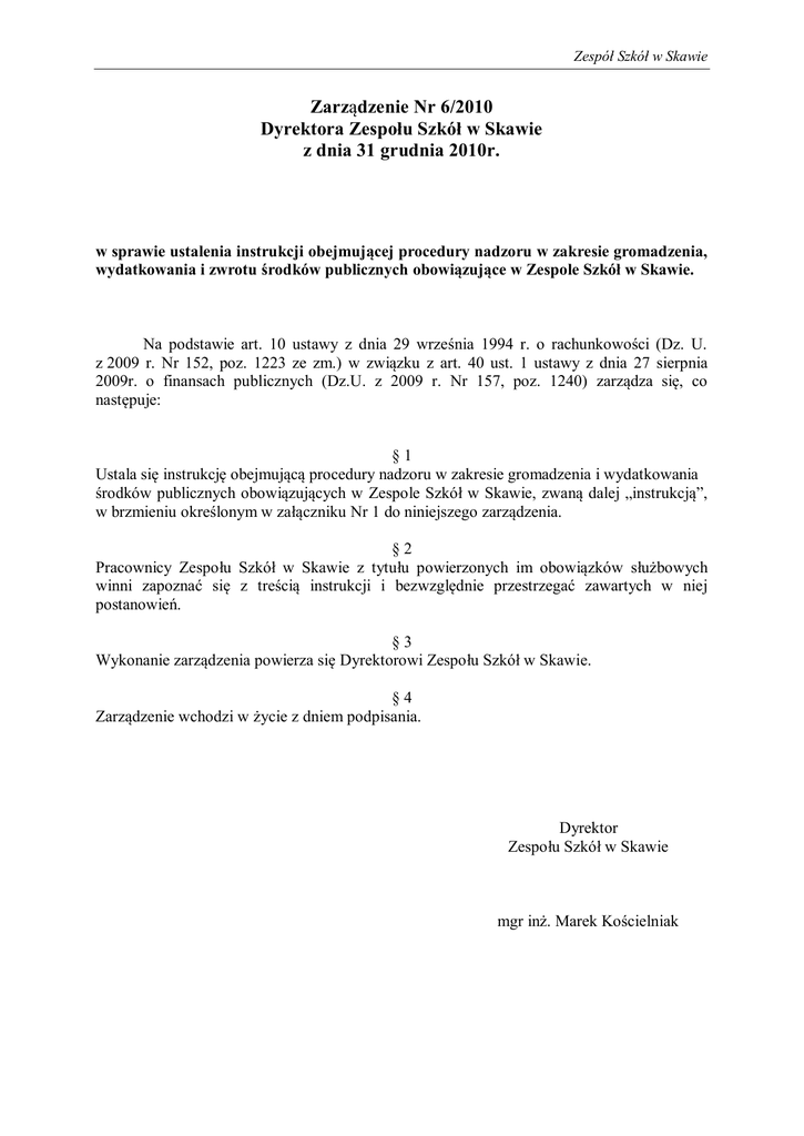 Zespół Szkół w Skawie Zarządzenie Nr 6/2010 Dyrektora Zespołu Szkół w Skawie z dnia 31 grudnia 2010r. w sprawie ustalenia instrukcji obejmującej procedury nadzoru w zakresie gromadzenia, wydatkowania i zwrotu środków publicznych obowiązujące w Zespole Szkół w Skawie. Na podstawie art. 10 ustawy z dnia 29 września 1994 r. o rachunkowości (Dz. U. z 2009 r. Nr 152, poz. 1223 ze zm.) w związku z art. 40 ust. 1 ustawy z dnia 27 sierpnia 2009r. o finansach publicznych (Dz.U. z 2009 r. Nr 157, poz. 1240) zarządza się, co następuje: §1 Ustala się instrukcję obejmującą procedury nadzoru w zakresie gromadzenia i wydatkowania środków publicznych obowiązujących w Zespole Szkół w Skawie, zwaną dalej „instrukcją”, w brzmieniu określonym w załączniku Nr 1 do niniejszego zarządzenia. §2 Pracownicy Zespołu Szkół w Skawie z tytułu powierzonych im obowiązków służbowych winni zapoznać się z treścią instrukcji i bezwzględnie przestrzegać zawartych w niej postanowień. §3 Wykonanie zarządzenia powierza się Dyrektorowi Zespołu Szkół w Skawie. §4 Zarządzenie wchodzi w życie z dniem podpisania. Dyrektor Zespołu Szkół w Skawie mgr inż. Marek Kościelniak Zespół Szkół w Skawie Załącznik Nr 1 do Zarządzenia Nr 6/2010 Dyrektora Zespołu Szkół w Skawie z dnia 31 grudnia 2010 r. PROCEDURY NADZORU W ZAKRESIE GROMADZENIA, WYDATKOWANIA I ZWROTU ŚRODKÓW PUBLICZNYCH, OBOWIĄZUJĄCE W ZESPOLE SZKÓŁ W SKAWIE §1 KONTROLA PROCESÓW GROMADZENIA ŚRODKÓW: 1. Procedury kontroli gromadzenia dochodów zapewniają zgodne z prawem pobieranie należnych środków w prawidłowej wysokości, terminowo i zgodnie ze stanem faktycznym. 2. Kontrolą wewnętrzną należy objąć klasyfikacje, ewidencję i sprawozdawczość z zakresie dochodów budżetowych. 3. Procedury dotyczą następujących rodzajów dochodów budżetowych: 1) dochody ze świadczonych usług i wynajmu pomieszczeń biurowych, 2) inne dochody (odsetki bankowe). 3. Zadania kontrolne polegają na: a) wprowadzeniu do planu dochodów kwot szacunkowych na dany rok budżetowy, b) prawidłowości klasyfikacji, ewidencji oraz sporządzenia sprawozdań w zakresie tych dochodów, c) sporządzenie tytułów wykonawczych lub kierowanie spraw na drogę postępowania sądowego. §2 KONTROLA PROCESÓW WYDATKOWANIA ŚRODKÓW: 1. Kontrola wydatków budżetowych ma na celu zbadanie czy posiadane środki zostały wydatkowane w sposób gospodarny i oszczędny, stosownie do opracowanego planu finansowego w granicach przyznanych kwot oraz z zachowaniem przepisów ustawy o finansach publicznych i ustawy – Prawo zamówień publicznych. 2. Środki publiczne mogą być wydatkowane po stwierdzaniu wcześniejszego zastosowania procedur kontroli celowości ich poniesienia. 3. Procedury kontroli celowości wydatkowania środków publicznych określone są odrębnym zarządzeniem dyrektora Zespołu Szkół w Skawie. 4. Wydatkowanie środków publicznych może nastąpić na zasadach i w sposób określony w ustawie Prawo zamówień publicznych. 5. W przypadku wydatku niepodlegającego ustawie Prawo zamówień publicznych, realizacja następuje na podstawie zlecenia podpisanego przez Dyrektora Zespołu Szkół w Skawie. Zespół Szkół w Skawie 6. Zasady udzielania zamówień publicznych obowiązujące w Zespole Szkół w Skawie określone są odrębnym zarządzeniem. 7. Wydatkowanie środków publicznych może nastąpić do wysokości kwot wskazanych w uchwale budżetowej i na cele w niej wskazane. 8. Wydatkowanie środków publicznych powinno być dokonywane: 1) w sposób celowy i oszczędny, z zachowaniem zasady uzyskiwania najlepszych efektów z danych nakładów finansowych, 2) w sposób umożliwiający terminową realizację zadań będących w kompetencji jednostki, 3) w wysokości i terminach wynikających z wcześniej zaciągniętych zobowiązań. 9. Zmiana przeznaczenia części środków publicznych może być dokonana po uzgodnieniu z jej dysponentem. 10. Zlecenie zadania innej jednostce lub osobie fizycznej może nastąpić w przypadku, gdy zadanie to nie może zostać zrealizowane w ramach obowiązków służbowych pracowników. §3 1. Dyrektor Zespołu Szkół w Skawie wraz z wicedyrektorem dokonuje oceny wydatków na bieżącą działalność w zakresie: a) zakupu sprzętu komputerowego i wyposażenia biurowego, b) zakupu materiałów biurowych, c) zakupu środków czystości, d) konserwacji sprzętu BHP i przeciwpożarowego, e) zakupu na potrzeby remontowe materiałów, 2. Dla dokonania prawidłowej oceny wydatków Dyrektor Zespołu szkół w Skawie podejmuje następujące działania: a) zbiera dane potrzebne do analizy kosztów zamierzonych działań i stopnia ich użyteczności, b) na podstawie zebranych informacji określa alternatywne linie działania, c) wybiera rozwiązanie pozwalające na zminimalizowanie wydatków przy maksymalizacji efektów, uwzględniając przy tym jakość produktów i usług wymaganą dla realizacji celów Zespołu Szkół. §4 Potwierdzanie konieczności wyjazdu w celu załatwienia spraw służbowych dokonują: 1) pracownikom: a) dyrektor Zespołu Szkół w Skawie 2) dyrektorowi: a) wójt gminy b) wicewójt gminy. §5 Wstępną ocenę pozostałych wydatków z budżetu przeprowadza dyrektor Zespołu Szkół w Skawie, po dokonaniu badania celowości ich poniesienia. - z tym, że propozycje w sprawie zakupu sprzętu komputerowego przygotowuje po zasięgnięciu opinii nauczycieli informatyki. §6 1. Kontroli ponoszonych wydatków w zakresie ich zgodności z planem finansowym dokonuje główny księgowy ZEAS Raba Wyżna na zasadach określonych w ustawie o finansach publicznych. Zespół Szkół w Skawie 2. Główny księgowy ZEAS Raba Wyżna lub osoba przez niego upoważniona dokonuje sprawdzenia zgodności wydatku z wcześniej zaciągniętym – w formie umowy cywilnoprawnej – zobowiązaniem. 3. Potwierdzeniem dokonania kontroli jest złożenie podpisu na dowodzie księgow