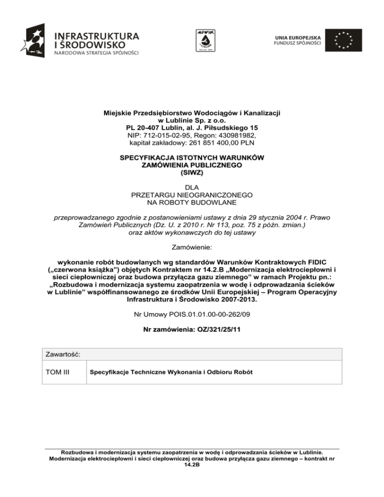 Tom III: Wymagania Zamawiającego Miejskie Przedsiębiorstwo Wodociągów i Kanalizacji w Lublinie Sp. z o.o. PL 20-407 Lublin, al. J. Piłsudskiego 15 NIP: 712-015-02-95, Regon: 430981982, kapitał zakładowy: 261 851 400,00 PLN SPECYFIKACJA ISTOTNYCH WARUNKÓW ZAMÓWIENIA PUBLICZNEGO (SIWZ) DLA PRZETARGU NIEOGRANICZONEGO NA ROBOTY BUDOWLANE przeprowadzanego zgodnie z postanowieniami ustawy z dnia 29 stycznia 2004 r. Prawo Zamówień Publicznych (Dz. U. z 2010 r. Nr 113, poz. 75 z późn. zmian.) oraz aktów wykonawczych do tej ustawy Zamówienie: wykonanie robót budowlanych wg standardów Warunków Kontraktowych FIDIC („czerwona ksiąŜka”) objętych Kontraktem nr 14.2.B „Modernizacja elektrociepłowni i sieci ciepłowniczej oraz budowa przyłącza gazu ziemnego” w ramach Projektu pn.: „Rozbudowa i modernizacja systemu zaopatrzenia w wodę i odprowadzania ścieków w Lublinie” współfinansowanego ze środków Unii Europejskiej – Program Operacyjny Infrastruktura i Środowisko 2007-2013. Nr Umowy POIS.01.01.00-00-262/09 Nr zamówienia: OZ/321/25/11 Zawartość: TOM III Specyfikacje Techniczne Wykonania i Odbioru Robót Rozbudowa i modernizacja systemu zaopatrzenia w wodę i odprowadzania ścieków w Lublinie. Modernizacja elektrociepłowni i sieci ciepłowniczej oraz budowa przyłącza gazu ziemnego – kontrakt nr 14.2B Tom III: Wymagania Zamawiającego WPROWADZENIE do stosowania tomu III : Wymagania Zamawiającego dla potrzeb kontraktu 14.2B pod nazwą: „Modernizacja elektrociepłowni i sieci ciepłowniczej oraz budowa przyłącza gazu ziemnego” Kontrakt pod nazwą „Modernizacja elektrociepłowni i sieci ciepłowniczej oraz budowa przyłącza gazu ziemnego” o oznaczeniu 14.2B stanowi część kontraktu 14B pod nazwą „Modernizacja gospodarki biogazem”; roboty objęte niniejszym zamówieniem obejmują zakres określony poniŜej: a) ogólny zakres robót objętych przedmiotowym kontraktem 14.2B zawarty jest w następujących opracowaniach projektowych: • Projekty budowlano-wykonawcze przebudowy elektrociepłowni: BranŜa technologiczna i konstrukcyjna (obejmująca wymiennikownię z rozbiórkami, kotłownię gazową z rozbiórkami, stację przygotowania wody kotłowej z rozbiórkami, rozbiórkę kotłowni węglowej, instalację systemu pomiaru stęŜeń gazów toksycznych i wybuchowych), BranŜa architektoniczna, BranŜa konstrukcyjna (dla branŜy architektonicznej), BranŜa elektryczna (instalacje odgromowe, instalacje wewnętrzne), BranŜa sanitarna (instalacje wewnętrzne – wod-kan z rozbiórkami, gaz, wentylacja z rozbiórkami, c.o. z rozbiórkami) • Przebudowa sieci cieplnych na terenie oczyszczalni ścieków BranŜa technologiczna (z rozbiórkami). • Budowa przyłącza gazu ziemnego do budynku elektrociepłowni BranŜa technologiczna (z zagospodarowaniem terenu). Wymienione wyŜej pozycje opracowań projektowych (objęte niniejszym kontraktem) są oznaczone w Specyfikacji Technicznej ST-00.00 (Wymagania ogólne) w punktach 1.3.1.oraz 1.3.4 poprzez pogrubienie druku, natomiast pozycje nie wchodzące w zakres niniejszego kontraktu zostały w tych punktach przekreślone; b) szczegółowy zakres robót objętych niniejszym kontraktem wskazany jest w Przedmiarze Robót w kolumnie 2 zawierającej kody pozycji przedmiarowych odnoszących się do specyfikacji szczegółowych o oznaczeniach: ST-01.00 ÷ ST-08.01; Rozbudowa i modernizacja systemu zaopatrzenia w wodę i odprowadzania ścieków w Lublinie. Modernizacja elektrociepłowni i sieci ciepłowniczej oraz budowa przyłącza gazu ziemnego – kontrakt nr 14.2B Tom III: Wymagania Zamawiającego Oznaczenie przedmiotu zamówienia według terminologii wspólnego słownika zamówień – CPV . kod: 45252127-4 – Roboty budowlane w zakresie oczyszczalni ścieków Adres obiektu budowlanego: Oczyszczalnia Ścieków „Hajdów” w Lublinie 20-407 Lublin ul. Łagiewnicka 5 Nazwa i adres Zamawiającego. Miejskie Przedsiębiorstwo Wodociągów i Kanalizacji w Lublinie Sp. z o.o. ul. Piłsudskiego 15 20-407 Lublin Spis zawartości Specyfikacji Technicznych Wykonania i Odbioru Robót Budowlanych (TOM III) ST – 00.00 ST – 01.00 ST – 02.00 ST – 03.00 ST – 04.00 ST – 05.00 ST – 06.01 ST – 06.02 ST – 07.01 ST – 07.02 ST – 07.03 ST – 07.04 ST – 08.01 Wykaz specyfikacji Wymagania ogólne Roboty rozbiórkowe Roboty budowlane Wymiana i montaŜ wyposaŜenia technologicznego Instalacja wodna, kanalizacyjna, gazowa, wentylacyjna i centralnego ogrzewania Sieci międzyobiektowe Roboty drogowe, podbudowy Roboty drogowe, nawierzchnie Zewnętrzne linie kablowe niskiego napięcia oraz kable teletechniczne Elektryczne instalacje obiektowe Elektryczne instalacje ochronne Obiektowe rozdzielnice siłowe i sterownicze Modernizacja systemu sterowania i wizualizacji Str. 7 50 63 147 166 183 237 253 273 287 299 311 323 Rozbudowa i modernizacja systemu zaopatrzenia w wodę i odprowadzania ścieków w Lublinie. Modernizacja elektrociepłowni i sieci ciepłowniczej oraz budowa przyłącza gazu ziemnego – kontrakt nr 14.2B Tom III: Wymagania Zamawiającego ST – 00.00 Wymagania ogólne SPECYFIKACJA TECHNICZNA WYKONANIA I ODBIORU ROBÓT ST – 00.00 WYMAGANIA OGÓLNE Rozbudowa i modernizacja systemu zaopatrzenia w wodę i odprowadzania ścieków w Lublinie. Modernizacja elektrociepłowni i sieci ciepłowniczej oraz budowa przyłącza gazu ziemnego – kontrakt nr 14.2B Tom III: Wymagania Zamawiającego ST – 00.00 Wymagania ogólne SPIS TREŚCI: 1. CZĘŚĆ OGÓLNA ......................................................................................................................................... 7 1.1. PRZEDMIOT SPECYFIKACJI TECHNICZNEJ WYKONANIA I ODBIORU ROBÓT BUDOWLANYCH ......................................... 7 1.2. ZAKRES STOSOWANIA SPECYFIKACJI TECHNICZNEJ WYKONANIA I ODBIORU ROBÓT BUDOWLANYCH ............................. 7 1.3. PRZEDMIOT I ZAKRES ROBÓT OBJĘTYCH SPECYFIKACJAMI TECHNICZNYMI WYKO