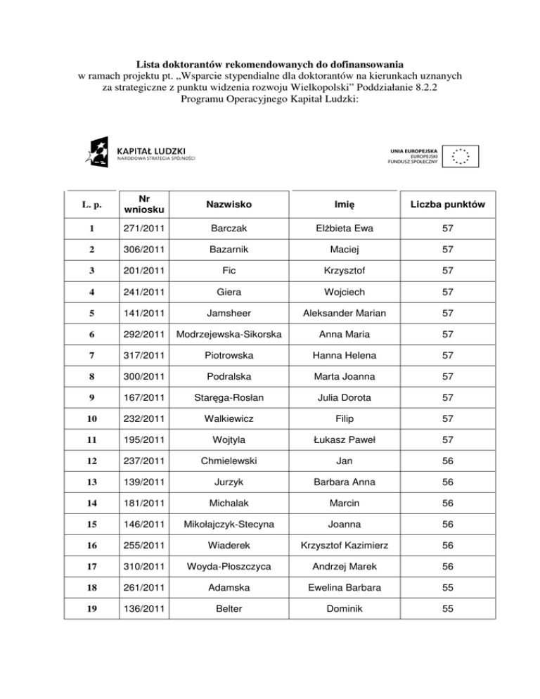 Lista doktorantów rekomendowanych do dofinansowania w ramach projektu pt. „Wsparcie stypendialne dla doktorantów na kierunkach uznanych za strategiczne z punktu widzenia rozwoju Wielkopolski” Poddziałanie 8.2.2 Programu Operacyjnego Kapitał Ludzki: L. p. Nr wniosku Nazwisko Imię Liczba punktów 1 271/2011 Barczak Elżbieta Ewa 57 2 306/2011 Bazarnik Maciej 57 3 201/2011 Fic Krzysztof 57 4 241/2011 Giera Wojciech 57 5 141/2011 Jamsheer Aleksander Marian 57 6 292/2011 Modrzejewska-Sikorska Anna Maria 57 7 317/2011 Piotrowska Hanna Helena 57 8 300/2011 Podralska Marta Joanna 57 9 167/2011 Staręga-Rosłan Julia Dorota 57 10 232/2011 Walkiewicz Filip 57 11 195/2011 Wojtyla Łukasz Paweł 57 12 237/2011 Chmielewski Jan 56 13 139/2011 Jurzyk Barbara Anna 56 14 181/2011 Michalak Marcin 56 15 146/2011 Mikołajczyk-Stecyna Joanna 56 16 255/2011 Wiaderek Krzysztof Kazimierz 56 17 310/2011 Woyda-Płoszczyca Andrzej Marek 56 18 261/2011 Adamska Ewelina Barbara 55 19 136/2011 Belter Dominik 55 20 178/2011 Gałgańska Hanna Maria 55 21 179/2011 Gałgański Łukasz 55 22 307/2011 Gojżewski Hubert 55 23 110/2011 Górzyńska Karolina 55 24 120/2011 Jakubowska-Burek Ludwika Ewa 55 25 156/2011 Janus Łukasz Piotr 55 26 297/2011 Mizgajski Jan Tadeusz 55 27 176/2011 Pieczyński Marcin Andrzej 55 28 99/2011 Rojewska Monika Maria 55 29 5/2011 Szulc Alicja 55 30 16/2011 Walczak-Zeidler Katarzyna 55 31 305/2011 Acznik Ilona 54 32 11/2011 Borucka Nina Anna 54 33 70/2011 Kalak Małgorzata Maria 54 34 229/2011 Milanowski Bartłomiej 54 35 225/2011 Milewska Justyna Agata 54 36 247/2011 Pawłowski Andrzej 54 37 131/2011 Burzyński Grzegorz Władysław 53 38 129/2011 Kot Mariusz Janusz 53 39 21/2011 Kuśnierek Krzysztof Piotr 53 40 148/2011 Laurentowska Agnieszka 53 41 320/2011 Osiński Jędrzej Jan 53 42 22/2011 Sądej-Bajerlein Mariola Elżbieta 53 43 82/2011 Barczewski Mateusz 52 44 262/2011 Biegański Wojciech 52 45 235/2011 Cieśla Agata 52 46 267/2011 Cieślak Karolina Agnieszka 52 47 200/2011 Dziadas Mariusz Tomasz 52 48 132/2011 Emmons Magdalena 52 49 90/2011 Fierek Szymon 52 50 278/2011 Fularz Michał 52 51 147/2011 Gornowicz Justyna Anna 52 52 26/2011 Jarzębski Maciej 52 53 104/2011 Jóźwiak Weronika 52 54 161/2011 Kietrys Anna Maria 52 55 125/2011 Kownacka Agnieszka Maria 52 56 233/2011 Kubis Marek Damian 52 57 251/2011 Kujawski Jacek Rafał 52 58 174/2011 Ławniczak Łukasz Krzysztof 52 59 212/2011 Marciniak Lidia Regina 52 60 106/2011 Modlińska Anna 52 61 153/2011 Moritz Michał Piotr 52 62 197/2011 Mucha Sebastian Łukasz 52 63 259/2011 Nowicka Ariadna Barbara 52 64 113/2011 Olejnik Anna 52 65 198/2011 Paczyńska Paulina 52 66 303/2011 Piechota Michał 52 67 304/2011 Pietruczuk Karol 52 68 243/2011 Pilarska Agnieszka Anna 52 69 182/2011 Piwecka Monika 52 70 221/2011 Szlachcic Wojciech Jan 52 71 108/2011 Tobółka Marcin 52 72 112/2011 Wichniarek Radosław Hieronim 52 73 34/2011 Wiśniewski Krzysztof 52 74 321/2011 Ziółkowska Angelika Julia 52 75 263/2011 Orsztynowicz Maciej 51