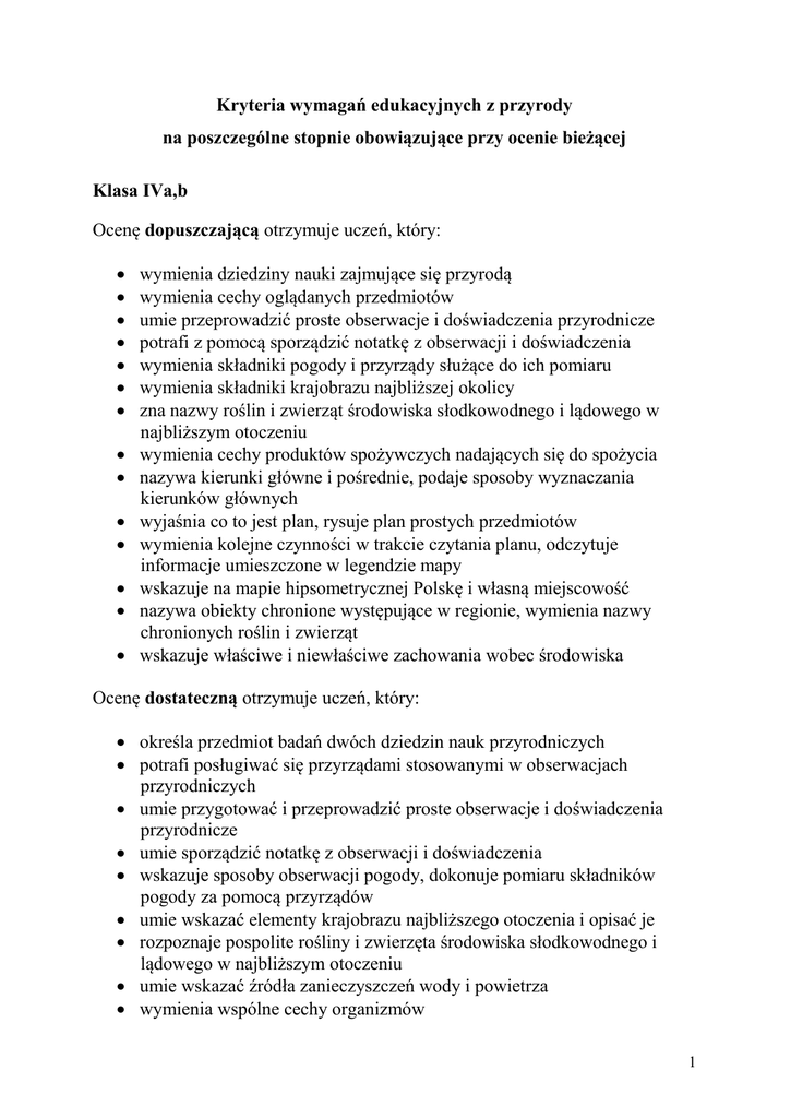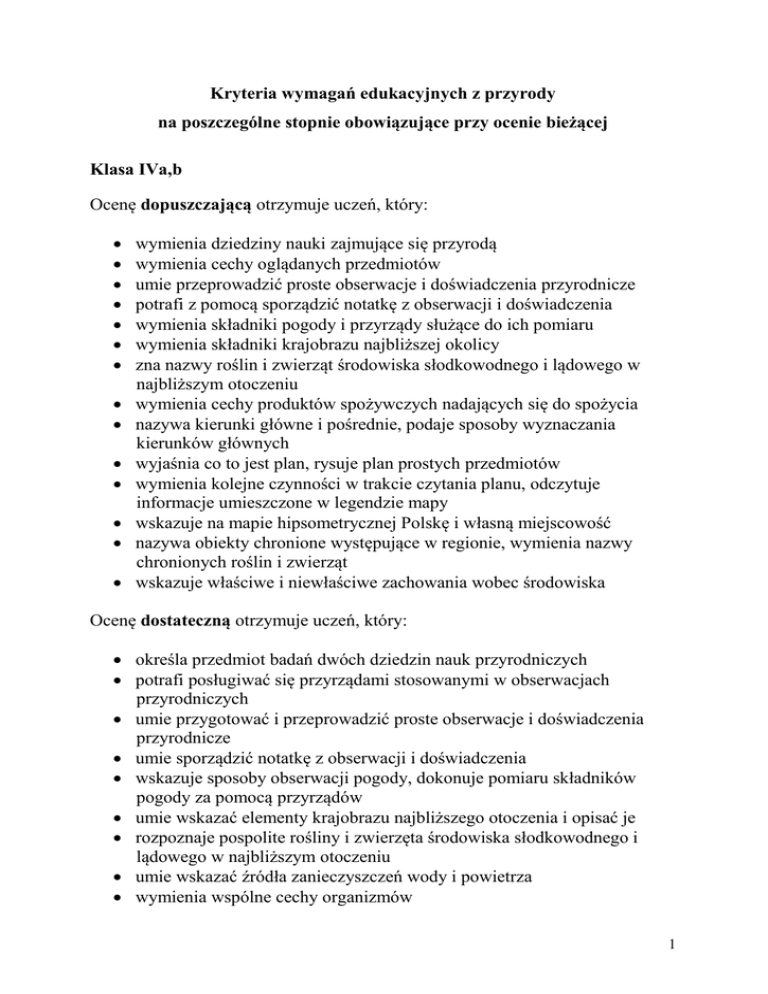Kryteria wymagań edukacyjnych z przyrody na poszczególne stopnie obowiązujące przy ocenie bieżącej Klasa IVa,b Ocenę dopuszczającą otrzymuje uczeń, który: wymienia dziedziny nauki zajmujące się przyrodą wymienia cechy oglądanych przedmiotów umie przeprowadzić proste obserwacje i doświadczenia przyrodnicze potrafi z pomocą sporządzić notatkę z obserwacji i doświadczenia wymienia składniki pogody i przyrządy służące do ich pomiaru wymienia składniki krajobrazu najbliższej okolicy zna nazwy roślin i zwierząt środowiska słodkowodnego i lądowego w najbliższym otoczeniu wymienia cechy produktów spożywczych nadających się do spożycia nazywa kierunki główne i pośrednie, podaje sposoby wyznaczania kierunków głównych wyjaśnia co to jest plan, rysuje plan prostych przedmiotów wymienia kolejne czynności w trakcie czytania planu, odczytuje informacje umieszczone w legendzie mapy wskazuje na mapie hipsometrycznej Polskę i własną miejscowość nazywa obiekty chronione występujące w regionie, wymienia nazwy chronionych roślin i zwierząt wskazuje właściwe i niewłaściwe zachowania wobec środowiska Ocenę dostateczną otrzymuje uczeń, który: określa przedmiot badań dwóch dziedzin nauk przyrodniczych potrafi posługiwać się przyrządami stosowanymi w obserwacjach przyrodniczych umie przygotować i przeprowadzić proste obserwacje i doświadczenia przyrodnicze umie sporządzić notatkę z obserwacji i doświadczenia wskazuje sposoby obserwacji pogody, dokonuje pomiaru składników pogody za pomocą przyrządów umie wskazać elementy krajobrazu najbliższego otoczenia i opisać je rozpoznaje pospolite rośliny i zwierzęta środowiska słodkowodnego i lądowego w najbliższym otoczeniu umie wskazać źródła zanieczyszczeń wody i powietrza wymienia wspólne cechy organizmów 1 zna strony świata i umie je wyznaczyć za pomocą zmian długości cienia umie szkicować uproszczone plany klasy, boiska umie posługiwać się planem miasta i mapą turystyczną w celu znalezienia danego miejsca dostrzega wpływ swoich działań na stan środowiska przyrodniczego Ocenę dobrą otrzymuje uczeń, który: określa przedmiot badań kilku dziedzin nauk przyrodniczych umiejętnie posługuje się przyrządami stosowanymi w obserwacjach przyrodniczych sprawnie przygotowuje i przeprowadza obserwacje i doświadczenia przyrodnicze umiejętnie sporządza notatkę z obserwacji i doświadczeń przyrodniczych omawia sposoby prowadzenia obserwacji pogody podaje różnice między krajobrazem naturalnym a przekształconym przez człowieka proponuje sposoby ochrony roślin i zwierząt podaje przykłady działalności człowieka, której skutkiem są korzystne zmiany w środowisku wskazuje sposoby wyznaczania kierunku północnego w terenie bez użycia przyrządów wymienia czynności umożliwiające narysowanie planu, rysuje plan klasy, szkoły, boiska stosując odpowiednią skalę odczytuje skalę mapy i oblicza odległość rzeczywistą między dwoma punktami, omawia znaczenie umiejętności czytania planu. odczytuje na mapie Polski wysokość położenia własnej miejscowości w m n. p. m. podaje różnice między rezerwatem przyrody a parkiem narodowym wskazuje możliwości ochrony środowiska w trakcie wykonywania codziennych zajęć Ocenę bardzo dobrą otrzymuje uczeń, który: wyjaśnia dlaczego obserwacje i doświadczenia są podstawowymi metodami poznawania przyrody zna wszystkie przyrządy służące do obserwacji i zawsze potrafi się nimi posługiwać podaje różnice między patrzeniem a obserwowaniem 2 wyciąga i formułuje wnioski z obserwacji i doświadczeń uzasadnia potrzebę prowadzenia obserwacji pogody opisuje krajobraz najbliższej okolicy określa swoją rolę w ochronie środowiska wykazuje skutki nieprzemyślanej działalności człowieka w środowisku określa cechy istot żywych Ocenę celującą otrzymuje uczeń, który: posiadł wiedzę i umiejętności znacznie wykraczające poza program nauczania przyrody w klasie 4 samodzielnie i twórczo rozwija zainteresowania przyrodnicze biegle posługuje się zdobytymi wiadomościami i umiejętnościami w rozwiązywaniu problemów teoretycznych i praktycznych. osiąga sukcesy w konkursach przyrodniczych Klasa Va,b Ocenę dopuszczającą otrzymuje uczeń ,który: zna i objaśnia znaczenie wprowadzonych pojęć, podaje przykłady zastosowań i oddziaływań poznanych zjawisk i organizmów w życiu codziennym, przeprowadza doświadczenia według podanej instrukcji, z pomocą nauczyciela, dokonuje obserwacji przyrodniczych według podanych wskazówek, wskazuje na mapie krainy geograficzne i rzeki Polski, Morze Bałtyckie, Polskę i jej sąsiadów na mapie Europy, Ocenę dostateczną otrzymuje uczeń , który: wymienia właściwości i cechy poznanych zjawisk, substancji, pojęć i organizmów, opisuje poznane krainy geograficzne i ich osobliwości, wskazuje miasta i rzeki, samodzielnie pracuje z mapą. rozpoznaje różne zjawiska, substancje, organizmy w rzeczywistości i na ilustracjach. 3 Ocenę dobrą otrzymuje uczeń , który: charakteryzuje oddziaływania w środowisku poznanych zjawisk, substancji i organizmów, objaśnia ich rolę i pochodzenie, określa charakterystyczne cechy zjawisk, substancji, organizmów i krajobrazów, porównuje i podaje przykłady, poprawnie stosuje i odróżnia poznane pojęcia i określenia, analizuje i wyciąga wnioski na podstawie zdobytej wiedzy, samodzielnie przeprowadza doświadczenia przyrodnicze w oparciu o instrukcję, poprawnie odczytuje dane z tekstu, mapy i wykresu. określa położenie krain geograficznych na mapie Polski. określa położenie Polski w Europie. zna położenie sąsiadów Polski . Ocenę bardzo dobrą otrzymuje uczeń, który: czynnie posługuje się poznanymi terminami. biegle posługuje się mapą w określonym zakresie, projektuje i przeprowadza doświadczenia przyrodnicze, korzysta z różnych źródeł wiedzy, przygotowuje na lekcj