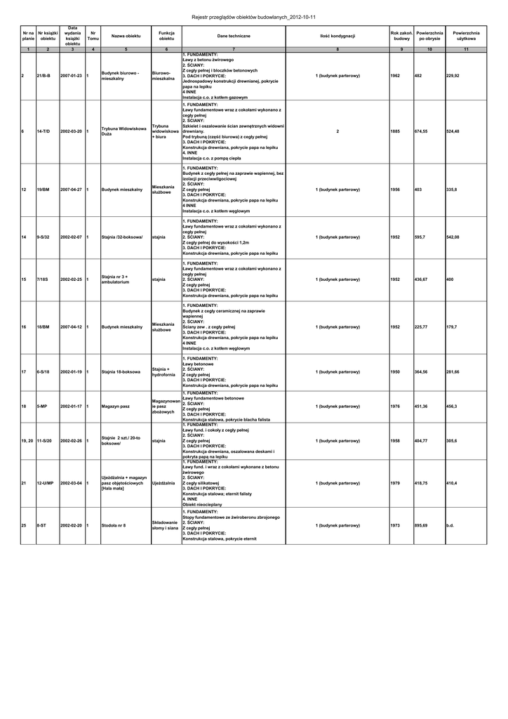 Rejestr przeglądów obiektów budowlanych_2012-10-11 2 Data wydania książki obiektu 3 21/B-B 2007-01-23 Nr na Nr książki planie obiektu 1 2 6 12 14 15 16 17 18 14-T/D 19/BM 9-S/32 7/18S 18/BM 6-S/18 2007-04-27 2002-02-07 2002-02-25 2007-04-12 2002-01-19 Nazwa obiektu Funkcja obiektu 4 5 6 1 1 1 1 1 1 1 Trybuna Widowiskowa Duża 1. FUNDAMENTY: Ławy fundamentowe wraz z cokołami wykonano z cegły pełnej 2. ŚCIANY: Trybuna Szkielet i oszalowanie ścian zewnętrznych widowni widowiskowa drewniany. + biura Pod trybuną (część biurowa) z cegły pełnej 3. DACH I POKRYCIE: Konstrukcja drewniana, pokrycie papa na lepiku 4. INNE Instalacja c.o. z pompą ciepła Budynek mieszkalny Stajnia /32-boksowa/ Stajnia nr 3 + ambulatorium Budynek mieszkalny Stajnia 18-boksowa Magazyn pasz 19, 20 11-S/20 2002-02-26 1 Stajnie 2 szt./ 20-to boksowe/ 21 2002-03-04 1 Ujeżdżalnia + magazyn pasz objętościowych [Hala mała] 8-ST 2002-02-20 1 7 1. FUNDAMENTY: Ławy z betonu żwirowego 2. ŚCIANY: Z cegły pełnej i bloczków betonowych 3. DACH I POKRYCIE: Jednospadowy konstrukcji drewnianej, pokrycie papa na lepiku 4 INNE Instalacja c.o. z kotłem gazowym Biurowomieszkalna 1 12-U/MP Dane techniczne Budynek biurowo mieszkalny 2002-01-17 25 5-MP 2002-03-20 Nr Tomu Stodoła nr 8 Ilość kondygnacji Rok zakoń. Powierzchnia budowy po obrysie 8 9 Powierzchnia użytkowa 10 11 1 (budynek parterowy) 1962 482 229,92 2 1885 674,55 524,48 Mieszkania służbowe 1. FUNDAMENTY: Budynek z cegły pełnej na zaprawie wapiennej, bez izolacji przeciwwilgociowej 2. ŚCIANY: Z cegły pełnej 3. DACH I POKRYCIE: Konstrukcja drewniana, pokrycie papa na lepiku 4 INNE Instalacja c.o. z kotłem węglowym 1 (budynek parterowy) 1956 403 335,8 stajnia 1. FUNDAMENTY: Ławy fundamentowe wraz z cokołami wykonano z cegły pełnej 2. ŚCIANY: Z cegły pełnej do wysokości 1,2m 3. DACH I POKRYCIE: Konstrukcja drewniana, pokrycie papa na lepiku 1 (budynek parterowy) 1952 595,7 542,08 stajnia 1. FUNDAMENTY: Ławy fundamentowe wraz z cokołami wykonano z cegły pełnej 2. ŚCIANY: Z cegły pełnej 3. DACH I POKRYCIE: Konstrukcja drewniana, pokrycie papa na lepiku 1 (budynek parterowy) 1952 436,67 400 Mieszkania służbowe 1. FUNDAMENTY: Budynek z cegły ceramicznej na zaprawie wapiennej 2. ŚCIANY: Ściany zew . z cegły pełnej 3. DACH I POKRYCIE: Konstrukcja drewniana, pokrycie papa na lepiku 4 INNE Instalacja c.o. z kotłem węglowym 1 (budynek parterowy) 1952 225,77 179,7 Stajnia + hydrofornia 1. FUNDAMENTY: Ławy betonowe 2. ŚCIANY: Z cegły pełnej 3. DACH I POKRYCIE: Konstrukcja drewniana, pokrycie papa na lepiku 1 (budynek parterowy) 1950 364,56 281,66 1 (budynek parterowy) 1976 451,36 456,3 1 (budynek parterowy) 1958 404,77 305,6 1 (budynek parterowy) 1979 418,75 410,4 1 (budynek parterowy) 1973 895,69 b.d. 1. FUNDAMENTY: Ławy fundamentowe betonowe Magazynowan 2. ŚCIANY: ie pasz Z cegły pełnej zbożowych 3. DACH I POKRYCIE: Konstrukcja stalowa, pokrycie blacha falista 1. FUNDAMENTY: Ławy fund. i cokoły z cegły pełnej 2. ŚCIANY: stajnia Z cegły pełnej 3. DACH I POKRYCIE: Konstrukcja drewniana, oszalowana deskami i pokryta papą na lepiku 1. FUNDAMENTY: Ławy fund. i wraz z cokołami wykonane z betonu żwirowego 2. ŚCIANY: Ujeżdżalnia Z cegły silikatowej 3. DACH I POKRYCIE: Konstrukcja stalowa; eternit falisty 4. INNE Obiekt nieocieplany Składowanie słomy i siana 1. FUNDAMENTY: Stopy fundamentowe ze żwiroberonu zbrojonego 2. ŚCIANY: Z cegły pełnej 3. DACH I POKRYCIE: Konstrukcja stalowa, pokrycie eternit Rejestr przeglądów obiektów budowlanych_2012-10-11