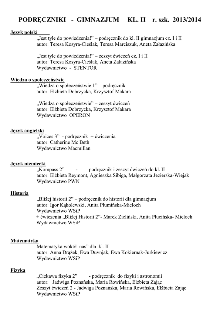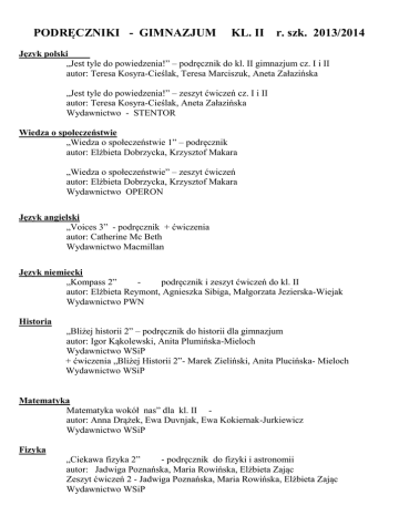 PODRĘCZNIKI - GIMNAZJUM KL. II r. szk. 2013/2014 Język polski „Jest tyle do powiedzenia!” – podręcznik do kl. II gimnazjum cz. I i II autor: Teresa Kosyra-Cieślak, Teresa Marciszuk, Aneta Załazińska „Jest tyle do powiedzenia!” – zeszyt ćwiczeń cz. I i II autor: Teresa Kosyra-Cieślak, Aneta Załazińska Wydawnictwo - STENTOR Wiedza o społeczeństwie „Wiedza o społeczeństwie 1” – podręcznik autor: Elżbieta Dobrzycka, Krzysztof Makara „Wiedza o społeczeństwie” – zeszyt ćwiczeń autor: Elżbieta Dobrzycka, Krzysztof Makara Wydawnictwo OPERON Język angielski „Voices 3” - podręcznik + ćwiczenia autor: Catherine Mc Beth Wydawnictwo Macmillan Język niemiecki „Kompass 2” podręcznik i zeszyt ćwiczeń do kl. II autor: Elżbieta Reymont, Agnieszka Sibiga, Małgorzata Jezierska-Wiejak Wydawnictwo PWN Historia „Bliżej historii 2” – podręcznik do historii dla gimnazjum autor: Igor Kąkolewski, Anita Plumińska-Mieloch Wydawnictwo WSiP + ćwiczenia „Bliżej Historii 2”- Marek Zieliński, Anita Plucińska- Mieloch Wydawnictwo WSiP Matematyka Matematyka wokół nas” dla kl. II autor: Anna Drążek, Ewa Duvnjak, Ewa Kokiernak-Jurkiewicz Wydawnictwo WSiP Fizyka „Ciekawa fizyka 2” - podręcznik do fizyki i astronomii autor: Jadwiga Poznańska, Maria Rowińska, Elżbieta Zając Zeszyt ćwiczeń 2 - Jadwiga Poznańska, Maria Rowińska, Elżbieta Zając Wydawnictwo WSiP Chemia Podręcznik dla gimnazjum cz. 2 autor: Hanna Gulińska, Janina Smolińska Zbiór zadań „Zadania od łatwych do trudnych” autor: K.M. Pazdro, M. Koszmider Wydawnictwo – Oficyna Wydawnicza Krzysztof Pazdro Biologia „Puls życia 2” – podręcznik do biologii gimnazjum autor: Małgorzata Jefimow „Puls życia 2” - zeszyt ćwiczeń do biologii dla gimnazjum autor: Alicja Kasińska, Ewa Niemczewska-Borowczak, Jacek Pawłowski Wydawnictwo „NOWA ERA” Geografia „Puls Ziemi 2” – podręcznik do geografii dla gimnazjum autor: Bożena Dobosik, Adam Hibszer, Józef Soja „Puls Ziemi 2” – zeszyt ćwiczeń do geografii dla gimnazjum autor: J. Knopik, E. Koral Wydawnictwo Nowa Era Zajęcia techniczne „Zajęcia techniczne” – podręcznik autor: Urszula Białka Wydawnictwo OPERON Zajęcia artystyczne Podręcznik dla gimnazjum „Plastyka” autor: Katarzyna Czernicka Wydawnictwo OPERON (ten, który obowiązuje w kl. I) Wychowanie do życia w rodzinie „Wędrując ku dorosłości” – podręcznik do „Wychowania do życia w rodzinie’ autorzy: Teresa Król, Krystyna Maśnik, Wojciech Śledziński, Grażyna Węglarczyk Wydawnictwo Rubikon Religia „Wolni przez miłość” Autorzy: Danuta Jackowiak, Jan Szpet Wydawnictwo: Księgarnia św. Wojciecha Poznań