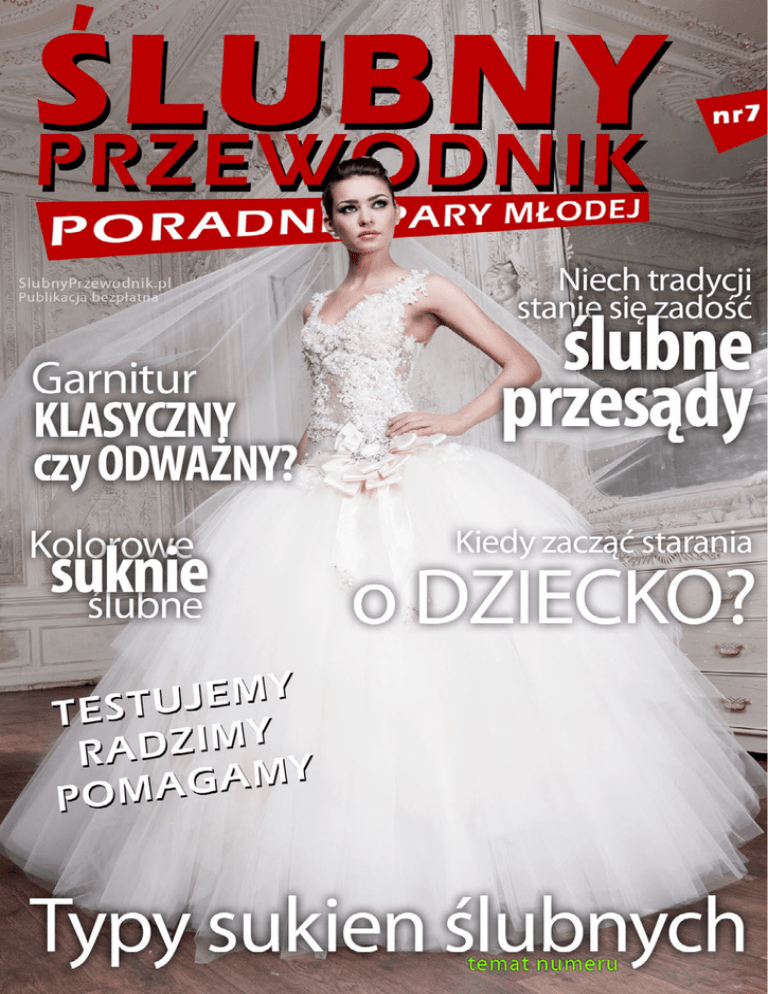 1 SPIS TREŚCI Moi Drodzy, 03 07 miesięcznika dla par planujących ślub. Niech tradycji stanie się zadość - ślubne przesądy 10 Grube uda - to nie problem 12 SuknieJaniny.pl - Suknie Twoich marzeń... 15 przed Wami kolejny numer Typy sukien ślubnych Poznacie w nim między innymi typy sukien ślubnych, dzięki czemu Panie będą mogły zdecydować, jaka suknia do nich będzie pasować. Przedstawimy Wam kilka prostych ćwiczeń, dzięki którym można szybko i skutecznie pozbyć się grubych ud. Doradzimy Wam kiedy najlepiej zacząć starania o dziecko. Ponad to Ślubny Przewodnik przedstawi Wam idealne kolekcje sukien Janiny i garniturów Giacomo Conti. Garnitur KLASYCZNY czy ODWAŻNY? 21 Kolorowe suknie ślubne 26 Kiedy zacząć starania o DZIECKO? 28 Kolekcja obrączek ślubnych 30 Zawieszki na WÓDKĘ - teksty Ślubny Przewodnik to idealny magazyn dla wszystkich Par, planujących ślub i wesele. Zapraszamy do czytania. Magdalena Pochroń Redaktor Naczelna [email protected] 2 TYPY SUKIEN ŚLUBNYCH 3 Jak wiadomo, wybór sukni ślubnej jest niezwykle ważny i trzeba się przy nim kierować kilkoma ważnymi zasadami. Suknia musi być elegancka, powinna uwidaczniać wszystkie mocne strony Twojej sylwetki, a jednocześnie maskować to, co ma być odpowiednio zakryte i zretuszowane. W tym numerze Ślubnego Przewodnika, nasza Redakcja pragnie przedstawić Ci najważniejsze typy sukien ślubnych, dzięki którym z łatwością będziesz mogła wybrać taką, która będzie idealnie pasować do Twojej figury. 1 Princessa Inaczej nazywana także Księżniczką. I nie bez powodu… suknia ta charakteryzuje się bardzo obcisłą i dopasowaną górą, natomiast dół jest bardzo poszerzony, z mnóstwem falban i warstw tiulu. Często suknie te są bogato zdobione, by Panna Młoda czuła się w nich jak typowa Księżniczka z bajki. 4 2 Suknia typu A Góra sukni jest dopasowana, natomiast dół stopniowo i delikatnie się rozszerza, tak jak litera A. Szerokość dołu sukni można oczywiście samemu regulować, w zależności od szerokości halki, która znajduje się pod suknią. Należy jednak pamiętać, że nie może być on tak szeroki, jak w sukni typu Princessa. Ma on być subtelnie i delikatnie poszerzany. 3 Empire Suknia ta charakteryzuje się klasycznym odcięciem pod biustem i swobodnie opadającym dołem. Często mówi się, że jest to lejący dół – subtelny i zwiewny. Odcięcie pod biustem może być oczywiście zdobione, a suknia dodatkowo może mieć delikatne rękawki. www.sukniejaniny.pl 5 4 Suknia prosta Głównym celem owej sukni jest pokazanie skromności i prostoty. Suknia na całej swojej długości ma jednakową szerokość. Jest zwiewna i delikatna. Nie posiada halki. 5 Rybka, syrenka Suknia dopasowana i obcisła, opinająca biodra, od kolan rozszerzająca się ku dołowi, często zakończona długim trenem . Suknie te mogą być bogato zdobione, koronkowe bądź skromne i delikatne. www.sukniejaniny.pl 6 Niech tradycji stanie się zadość... ...czyli ślubne PRZESĄDY Jak w każdym numerze, tak i w tym prezentujemy Wam kolejną część ślubnych przesądów. Dla niektórych jest to dawka śmiechu, inni jednak odbierają je poważnie i starają się o nich pamiętać. To, jednak, w jaki sposób je odczytujecie, zostawiamy Wam do własnej interpretacji. Poczytajmy więc, jakie jeszcze znane są ślubne przesądy. 7 1 Nie należy często przymierzać swojej obrączki przed ślubem. Wróży to bowiem niezbyt dobrze dla przyszłego małżeństwa. Po zakupie powinno się je schować i założyć dopiero w dzień ślubu. 2 Gdy podczas przymierzania bądź ubierania już gotowej sukni ślubnej, w którymś miejscu popruje się, nie należy jej zszywać. Trzeba rozprute miejsce spiąć szpilką czy agrafką. 3 Gdy do ślubu podchodzi dojrzała kobieta bądź wdowa, powinna ona wybrać suknię w kolorze beżu czy pudrowego różu. Białe suknie są dla młodych kobiet. 4 5 Ślub najlepiej zawierać w sobotę bądź środę. Poniedziałek i piątek odpadają, gdyż wtedy nie warto zaczynać nowego etapu w swoim życiu. 6 7 8 9 10 Do ślubu auto Młodych może prowadzić wyłącznie mężczyzna. Nie powinna ich zawozić kobieta, gdyż przyniesie to pecha. Gdy podczas ceremonii Panna Młoda wzruszy się, oznaczać to będzie, że w małżeństwie będzie bardzo szczęśliwa i nigdy więcej płakać nie będzie. Kto pierwszy wstanie z klęcznika przy Ołtarzu, ten będzie miał władzę w małżeństwie. Obca osoba będąca na Mszy i składająca życzenia Parze Młodej zagwarantować im może szczęście i powodzenia w życiu. Podczas sprzątania rozbitych kieliszków, jeśli szufelkę trzymać będzie Panna Młoda, to ona będzie kierować związkiem. Koszulę ślubną powinna zawsze kupować przyszła Panna Młoda swemu ukochanemu, natomiast on musi jej kupić buciki ślubne. 8 11 Bukiet ślubny, który ma Panna Młoda w dniu ślubu, pod żadnym pozorem nie powinien składać się z róż. Mają one bowiem kolce, które przynieść mogą ból i cierpienie. 12 Panna Młoda powinna zrezygnować w dniu ślubu, aby mieć na sobie coś różowego. Może to spowodować, że jej małżeństwo dopadnie pech. 13 14 Pan Młody musi pamiętać o tym, aby sam nie podwoził się w dniu ślubu. Jeśli mężczyzna włoży swojej żonie obrączkę to końca palca może to oznaczać, że to on będzie zdecydowanie górą w ich małżeństwie. 15 Potknięcia małżonków podczas ich pierwszego tańca będą oznaczać, że w życiu także 16 Kobiety, zaproszone na uroczystość, nie powinni zakładać białej sukienki czy kreacji, bowiem jest ona zarezerwowana tylko i wyłącznie dla Panny Młodej. 17 18 19 20 Napotkane w drodze do Kościoła gołębie czy sroki wróżyć mają szczęście i pomyślność Młodej Parze. Gdy Panna Młoda potknie się o próg domu sprowadzi tym samym na swoją nową rodzinę same nieszczęścia. Po Mszy Świętej ślubnej nowo upieczony małżonek musi pocałow