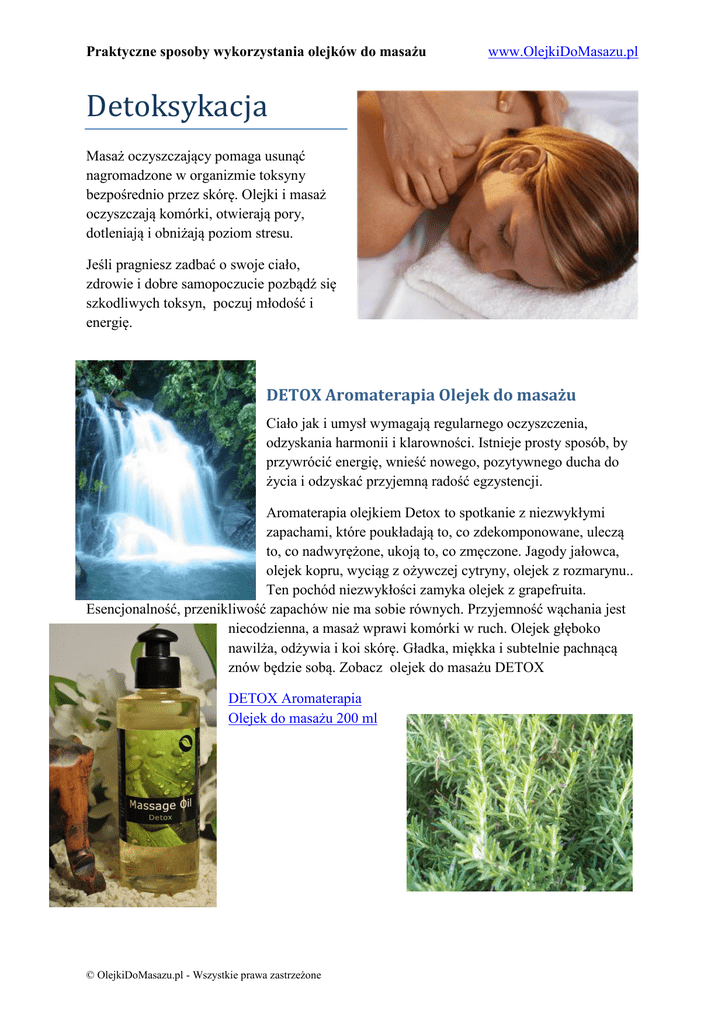 Praktyczne sposoby wykorzystania olejków do masażu www.OlejkiDoMasazu.pl Detoksykacja Masaż oczyszczający pomaga usunąć nagromadzone w organizmie toksyny bezpośrednio przez skórę. Olejki i masaż oczyszczają komórki, otwierają pory, dotleniają i obniżają poziom stresu. Jeśli pragniesz zadbać o swoje ciało, zdrowie i dobre samopoczucie pozbądź się szkodliwych toksyn, poczuj młodość i energię. DETOX Aromaterapia Olejek do masażu Ciało jak i umysł wymagają regularnego oczyszczenia, odzyskania harmonii i klarowności. Istnieje prosty sposób, by przywrócić energię, wnieść nowego, pozytywnego ducha do życia i odzyskać przyjemną radość egzystencji. Aromaterapia olejkiem Detox to spotkanie z niezwykłymi zapachami, które poukładają to, co zdekomponowane, uleczą to, co nadwyrężone, ukoją to, co zmęczone. Jagody jałowca, olejek kopru, wyciąg z ożywczej cytryny, olejek z rozmarynu.. Ten pochód niezwykłości zamyka olejek z grapefruita. Esencjonalność, przenikliwość zapachów nie ma sobie równych. Przyjemność wąchania jest niecodzienna, a masaż wprawi komórki w ruch. Olejek głęboko nawilża, odżywia i koi skórę. Gładka, miękka i subtelnie pachnącą znów będzie sobą. Zobacz olejek do masażu DETOX DETOX Aromaterapia Olejek do masażu 200 ml © OlejkiDoMasazu.pl - Wszystkie prawa zastrzeżone Praktyczne sposoby wykorzystania olejków do masażu Detox - Massu Olejek w Świecy do masażu Oczyszczanie ciała i ducha jest zajęciem przyjemnym. Bardzo przyjemnym. I naprawdę nie wymagającym wysiłku, mikstur czy specjalnych działań. Massu Olejek w Świecy do Masażu z całą pewnością wystarczy, by przywrócić harmonię, dobre samopoczucie i energię. A czyni to bardzo przekonująco ze względu na kompozycję niezwykłych zapachów. Mamy jałowiec, koper włoski, cyprys, cytrynę. Tę już wyjątkową kompozycję wzmacniają i dopełniają bardziej słodkie: jojoba, masełka shea, awokado oraz oliwy ze słonecznika. Kontemplując ogień i zapach szybko pozbędziemy się negatywnych emocji, napięć czy zmęczenia. Detox, czyli głębokie oczyszczenie organizmu, będzie się kojarzyć z naprawdę przyjemnymi chwilami. Zobacz olejki do masażu w świecy DETOX: DETOX- Massu Olejek w Świecy do masażu 75g DETOX- Massu Olejek w Świecy do masażu 150g © OlejkiDoMasazu.pl - Wszystkie prawa zastrzeżone www.OlejkiDoMasazu.pl Praktyczne sposoby wykorzystania olejków do masażu www.OlejkiDoMasazu.pl OCZYSZCZENIE Olejek do masażu i kąpieli Nadchodzą momenty, gdy zrzucenie wszystkich trosk, napięć, skumulowanego stresu stanie się i waszym przeznaczeniem. Bywają dni, które znamionuje turkus. To dni oczyszczenia. To czas, by odłożyć wszystko na później, odegnać złe myśli, zapomnieć o trudach i ze spokojem przywitać nową energię życiową. Turkus w naszych kolorystycznych zestawieniach to kosmetyk oparty na olejkach z warzyw, ekstraktach z drzewa herbacianego, eukaliptusa i mięty pieprzowej. Prawda, że niesamowicie ekscytujące zestawienie? Połączony aromat jest obłędny. Masaż, hydromasaż czy kąpiel będzie niesamowitym przeżyciem. Odżyjecie! Rozprowadź i ogrzej olejek na dłoniach przed masażem. Kąpiel aromatyczna: Dodaj 1-2 nakrętki olejku do wanny. Olejek nadaje się do wanien z hydromasażem. Zobacz wszystkie olejki do masażu i kąpieli: OCZYSZCZENIE Olejek do masażu i kąpieli 50 ml OCZYSZCZENIE Olejek do masażu i kąpieli 150 ml © OlejkiDoMasazu.pl - Wszystkie prawa zastrzeżone