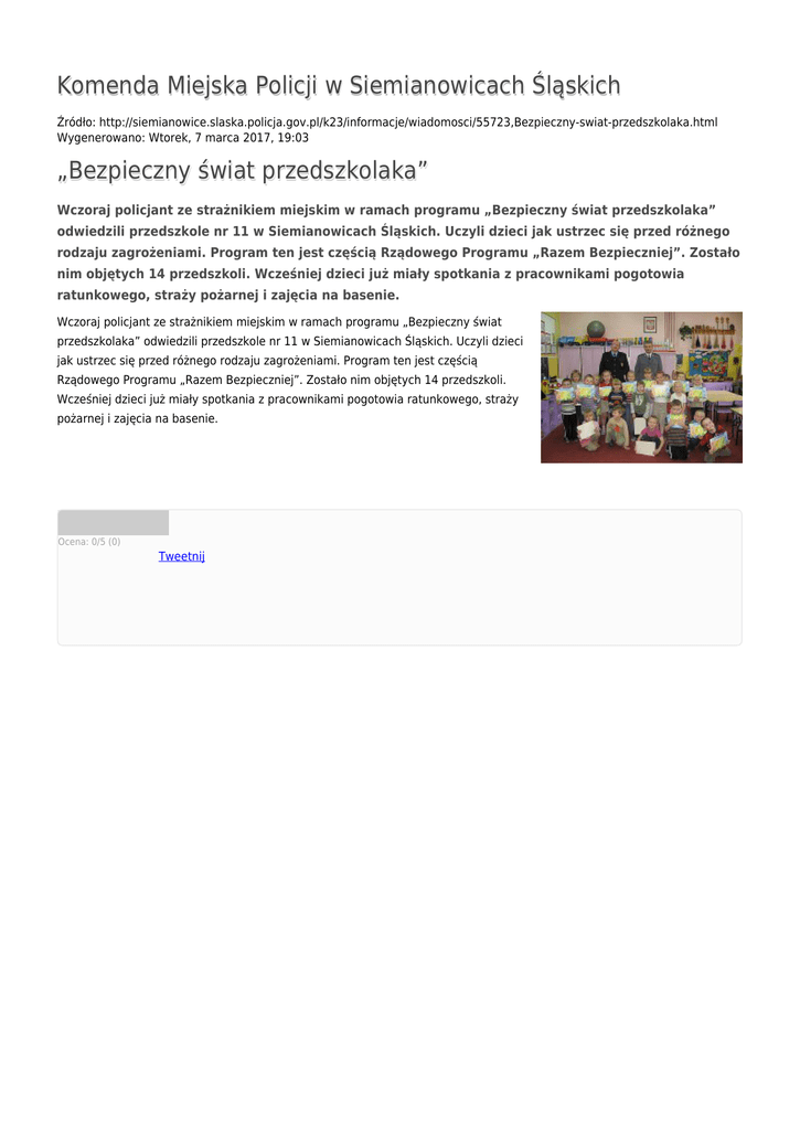 Komenda Miejska Policji w Siemianowicach Śląskich Źródło: http://siemianowice.slaska.policja.gov.pl/k23/informacje/wiadomosci/55723,Bezpieczny-swiat-przedszkolaka.html Wygenerowano: Wtorek, 7 marca 2017, 19:03 „Bezpieczny świat przedszkolaka” Wczoraj policjant ze strażnikiem miejskim w ramach programu „Bezpieczny świat przedszkolaka” odwiedzili przedszkole nr 11 w Siemianowicach Śląskich. Uczyli dzieci jak ustrzec się przed różnego rodzaju zagrożeniami. Program ten jest częścią Rządowego Programu „Razem Bezpieczniej”. Zostało nim objętych 14 przedszkoli. Wcześniej dzieci już miały spotkania z pracownikami pogotowia ratunkowego, straży pożarnej i zajęcia na basenie. Wczoraj policjant ze strażnikiem miejskim w ramach programu „Bezpieczny świat przedszkolaka” odwiedzili przedszkole nr 11 w Siemianowicach Śląskich. Uczyli dzieci jak ustrzec się przed różnego rodzaju zagrożeniami. Program ten jest częścią Rządowego Programu „Razem Bezpieczniej”. Zostało nim objętych 14 przedszkoli. Wcześniej dzieci już miały spotkania z pracownikami pogotowia ratunkowego, straży pożarnej i zajęcia na basenie. Ocena: 0/5 (0) Tweetnij