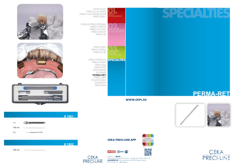 SPECIALTIES CEKA AXIAL PRECI-CLIX AXIAL PRECI-CLIX RADICULAR AX AXIA IALL PRECI-BALL ATTACHMENTS CEKA EXTRACORONAL PRECI-VERTIX PRECI-CLIX EC EXTRACORONA EXTR EX TRAC ACOR ORON ONAL AL ATTA TACH CHME MENT NTS S PRECI-SAGIX AT PRECI-52 PRECI-BAR PRECI-HORIX PRECI-CLIP PROFILE ATTACHMENTS PRECI-PROFILE PRECI-POST CEKA SOL CEKA SITE CEKA BOND 3C-BOND PERMA-RET PRECI-SEP PLASTICWAX EXPANDO CEKA Multi SPECIALTIES PERMA-RET WWW.CKPL.EU # 1601 1x 100 cm 3x CEKA PRECI-LINE APP # 1602 100 cm Prospectus n° 260.M1 © Copyright ALPHADENT NV 9/2014 - BTW BE 0414.789.321 RPR Kortrijk ALPHADENT NV • Mannebeekstraat 33 8790 Waregem, Belgium T +32 56 629 531 - E [email protected] PERMA-RET Mechanical retention for acrylic and composite teeth. A recess is drilled with the twist drill. The precious metal wire is threaded into the recess and cut. Bend for additional retention. PERMA-RET PERMA-RET Mechanische retentie voor kunststof- en composiettanden. De edelmetaaldraad wordt in de voorgeboorde opening gedraaid en afgesneden. Buig de draad voor bijkomende retentie. 1 Mechanische Retention für Kunststoff- und Kompositzähne. Der Edelmetalldraht wird in die vorgebohrte Öffnung gedreht und abgeschnitten. Durch Biegen erreichen Sie zusätzliche Retention. Mechaniczne retencje dla zębów z akrylu i kompozytu. Drut z metalu szlachetnego wkręcamy do wywierconego otworu w zębie i odcinany. Przez zagięcie drutu otrzymujemy dodatkową retencję. La rétention mécanique pour des dents acryliques et composites. Un logement est foré à l’aide d’une fraise. Le fil en métal précieux est vissé dans le logement et raccourcie. Pliez pour une rétention supplémentaire. Μηχανική συγκράτηση ακρυλικών δοντιών στην οδοντοστοιχία. Με το ειδικό τρυπάνι ανοίγουμε την οπή υποδοχής του σύρματος. Βιδώνουμε το σύρμα από πολύτιμο κράμα στην διανοιχθείσα οπή και κόβουμε την περίσσια. Κάμπτουμε το σύρμα για μεγαλύτερη συγκράτηση. La ritenzione meccanica per denti in resina acrilica e composito. Usare una fresa speciale per realizzare un foro. Avvitare il filo in lega preziosa nel foro e accorciarlo. Piegare il filo per ottenere una ritenzione supplementare. Для механической ретенции композитных и акриловых зубов. Сделайте отверстие спиральным сверлом. Проволока из драгоценного металла с резьбой вворачивается в отверстие и обрезается. Согните проволоку для дополнительной ретенции. La retención mecánica para los dientes acrílicos y composites. El diente será taladrado con la fresa. El hilo será atornillado en el diente y cortado. Doblar para una retención suplementaria. Mechanická retencia pre akrylové a kompozitné zuby. Otvor je vyvŕtaný so špirálovým vrtákom. Drôt z drahého kovu je zašróbovaný do otvoru a odrezaný. Ohnite pre zvýšenie retencie. 2 3 4