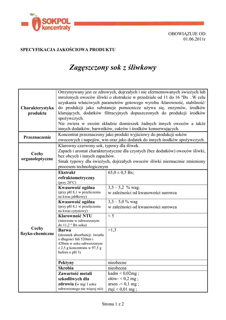 OBOWIĄZUJE OD 01.06.2011r SPECYFIKACJA JAKOŚCIOWA PRODUKTU Zagęszczony sok z śliwkowy Otrzymywany jest ze zdrowych, dojrzałych i nie sfermentowanych świeżych lub mrożonych owoców śliwki o ekstrakcie w przedziale od 11 do 16 °Bx . W celu uzyskania właściwych parametrów gotowego wyrobu /klarowność, stabilność/ Charakterystyka do produkcji jako substancje pomocnicze używa się, enzymów, środków klarujących, dodatków filtracyjnych dopuszczonych do produkcji środków produktu spożywczych. Nie zwiera w swoim składzie domieszek żadnych innych owoców a także innych dodatków, barwników, cukrów i środków konserwujących. Koncentrat przeznaczony jako produkt wyjściowy do produkcji soków Przeznaczenie owocowych i napojów, win oraz jako dodatek do innych środków spożywczych. Klarowny czerwony sok, typowy dla śliwek. Zapach i aromat charakterystyczne dla czystych (bez dodatków) owoców śliwki, Cechy bez obcych i innych zapachów. organoleptyczne Smak typowy dla świeżych, dojrzałych owoców śliwki nieznacznie zmieniony procesem technologicznym 65,0 ± 0,5 Bx; Ekstrakt refraktometryczny (przy 20°C) 3,5 – 5,2 % wag. w zależności od kwasowości surowca Kwasowość ogólna (przy pH 8,1 w przeliczeniu na kwas jabłkowy) 3,3 – 5,0 % wag w zależności od kwasowości surowca Kwasowość ogólna (przy pH 8,1 w przeliczeniu na kwas cytynowy) Klarowność NTU <5 (mierzona w odtworzonym do 11,2 ° Bx soku) Cechy >1,3 Barwa fizyko-chemiczne (stosunek absorbancji światła o długości fali 520nm i 420nm w soku odtworzonym z 2,5 g koncentratu w 97,5 g buforu o pH 3) Pektyny Skrobia Zawartość metali szkodliwych dla zdrowia (w mg/ l soku odtworzonego nie więcej niż) nieobecne nieobecna kadm < 0,02mg ; ołów- < 0,2 mg ; arsen -< 0,1 mg ; rtęć < 0,01 mg ; Strona 1 z 2 Ogólna liczba drobnoustrojów mezofilnych Cechy mikrobiologiczne Ogólna liczba drożdży Ogólna liczba pleśni Bakterie z grupy Coli Temperatura Warunki przechowywania Czas Cysterny Opakowania Wzór etykiety (w języku polskim) Beczki < 1000 w 1g < 300 w 1g < 100 w 1g nieobecne 4°C 24 miesiące cysterny o ładowności netto 25ton. z potwierdzonym certyfikatem myciem. Cysterna po załadunku jest plombowana. beczki metalowe, nowe lub rekondycjonowane zabezpieczone workiem osłonowym oraz workiem z zamknięciem ELPO 1’, rozlane aseptycznie lub nieasepycznie. Napełnione beczki po zadeklowaniu są plombowane. Towar bez palet. Producent Nazwa produktu oraz Brix Nr partii Waga netto Data produkcji Data przydatności do spożycia Temperatura przechowywania Strona 2 z 2