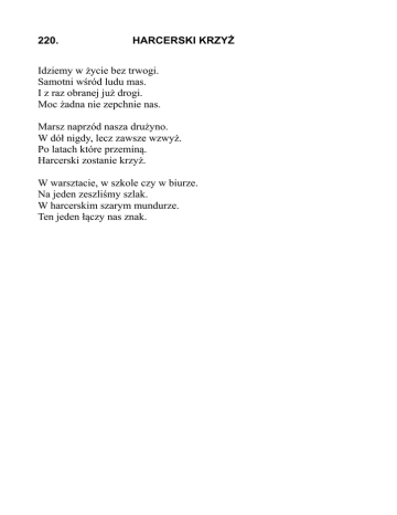 220. HARCERSKI KRZYŻ Idziemy w życie bez trwogi. Samotni wśród ludu mas. I z raz obranej już drogi. Moc żadna nie zepchnie nas. Marsz naprzód nasza drużyno. W dół nigdy, lecz zawsze wzwyż. Po latach które przeminą. Harcerski zostanie krzyż. W warsztacie, w szkole czy w biurze. Na jeden zeszliśmy szlak. W harcerskim szarym mundurze. Ten jeden łączy nas znak.