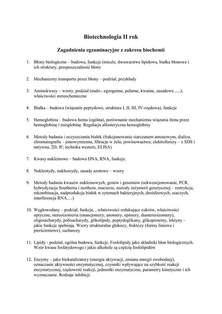 Biotechnologia II rok Zagadnienia egzaminacyjne z zakresu biochemii 1. Błony biologiczne – budowa, funkcje (micele, dwuwarstwa lipidowa, białka błonowe i ich struktury, przepuszczalność błon) 2. Mechanizmy transportu przez błony – podział, przykłady 3. Aminokwasy – wzory, podział (endo-, egzogenne, polarne, kwaśne, zasadowe .....), właściwości stereochemiczne 4. Białka – budowa (wiązanie peptydowe, struktura I, II, III, IV-rzędowa), funkcje 5. Hemoglobina – budowa hemu (ogólna), porównanie mechanizmu wiązania tlenu przez hemoglobinę i mioglobinę. Regulacja allosteryczna hemoglobiny 6. Metody badania i oczyszczania białek (frakcjonowanie siarczanem amonowym, dializa, chromatografie – jonowymienna, filtracja w żelu, powinowactwa; elektroforezy – z SDS i natywna, 2D, IF; technika western, ELISA) 7. Kwasy nukleinowe – budowa DNA, RNA, funkcje. 8. Nukleotydy, nukleozydy, zasady azotowe – wzory 9. Metody badania kwasów nukleinowych, genów i genomów (sekwencjonowanie, PCR, hybrydyzacja Southerna i northern, macierze, metody inżynierii genetycznej – restrykcja, rekombinacja, nadprodukcja białek w sytemach bakteryjnych, drożdżowych, ssaczych, interferencja RNA.....) 10. Węglowodany – podział, funkcje, , właściwości redukujące cukrów, właściwości optyczne, stereoizomeria (enancjomery, anomery, epimery, diastereoizomery), oligosacharydy, polisacharydy, glikolipidy, peptydoglikany, glikoproteiny, lektyny – jakie funkcje spełniają. Wzory strukturalne glukozy, fruktozy (formy liniowe i pierścieniowe), sacharozy 11. Lipidy - podział, ogólna budowa, funkcje. Fosfolipidy jako składniki błon biologicznych. Wzór kwasu fosfatydowego i jakie alkohole są częścią fosfolipidów 12. Enzymy – jako biokatalizatory (energia aktywacji, zmiana energii swobodnej), oznaczanie aktywności enzymatycznej, czynniki wpływające na szybkość reakcji enzymatycznej, rzędowość reakcji, jednostki enzymatyczne, parametry kinetyczne i ich wyznaczanie. Rodzaje inhibicji. 13. Strategie katalityczne – kataliza kowalencyjna, kwasowo-zasadowa, przez przybliżenie, z udziałem jonów metali. Przykłady 14. Strategie regulacyjne – kontrola allosteryczna, izoenzymy, odwracalna modyfikacja kowalencyjna (np fosforylacja), aktywacja proteolityczna, regulacja ilości białka na poziomie transkrypcji genów, translacji mRNA i degradacji białka (ubikwitynacja). Przykłady 15. Szlaki przekazywania sygnału – receptory błonowe, wtórne przekaźniki sygnału, kaskady fosforylacji. Szlaki przekazywania sygnału zapoczątkowane przez adrenalinę, insulinę i epidermalny czynnik wzrostu (EGF). Jakie są efekty uruchomienia danego szlaku i jak jest wyciszany. 16. Metabolizm – podstawowe pojęcia i organizacja, umiejscowienie poszczególnych cykli i szlaków metabolicznych w przedziałach komórkowych 17. Glikoliza, glukoneogeneza – funkcje tych szlaków, najważniejsze produkty, regulacja 18. Cykl Krebsa jako centralny element metabolizmu - rola w katabolizmie i anabolizmie, zdobywaniu energii 19. Fosforylacja oksydacyjna – łańcuch przenoszenia elektronów (skąd pochodzą elektrony? Jak są transportowane?, kompleksy I, II, III, IV), siła protonomotoryczna, hipoteza chemiosmotyczna Mitchella, syntaza ATP – co umożliwia syntezę ATP i w jaki sposób? Obchodzenie bariery przepuszczalności wewnętrznej błony mitochondrialnej – czółenka transportowe 20. Faza świetlna fotosyntezy – przebieg (rola fotonu, skąd elektrony?, fotosystemy I i II) rola fotosyntezy, co powstaje w jej wyniku 21. Cykl Calvina i szlak pentozofosforanowy – funkcje, najważniejsze produkty i ich wykorzystanie w metabolizmie 22. Cykl mocznikowy –funkcja, intermediaty, umiejscowienie 23. Synteza i rozpad glikogenu – budowa glikogenu, różnice między szlakami syntezy i rozpadu, regulacja hormonalna syntazy i fosforylazy glikogenu 24. Synteza i rozkład kwasów tłuszczowych – podstawowe różnice między tymi szlakami metabolicznymi (CoA, ACP), regulacja hormonalna, jak wykorzystywany jest produkt degradacji kw. tłuszczowych 25. Biosynteza lipidów błonowych i steroidów, regulacja, rola hormonów steroidowych, cholesterolu, soli żółciowych, witaminy D, rola systemu cytochromu P450 26. Przemiana białek, metabolizm aminokwasów – rozkład i synteza, reakcje transaminacji, ich znaczenie w metabolizmie 27. Biosynteza nukleotydów, regulacja na drodze sprzężeń zwrotnych 28. Integracja metabolizmu – rola ATP, kontrola metabolizmu, kluczowe intermediaty – losy pirogronianu, acetyloCoA, glukozo-6-fosforanu, zróżnicowanie metabolizmu w różnych tkankach, hormonalna regulacja metabolizmu w zależności od różnych czynników (głód, sytość, wysiłek fizyczny) 29. Replikacja DNA – kierunek syntezy nowej nici, nić wiodąca i nić opóźniona, białka zaangażowane w replikację (polimerazy, helikaza, topoizomeraza....), źródła uszkodzeń DNA i rodzaje systemów naprawy (MMR, BER, NER, NHEJ), 30. Cykl komórkowy i jego regulacja - kinazy zależne od cyklin. Wpływ uszkodzeń DNA na cykl komórkowy, rola białka p53 31. Kod genetyczny – definicja, cechy (degeneracja, brak przystanków, nienakładający się), kodony rozpoczęcia (start) i zakończenia (stop) transkrypcji, ramka odczytu 32. Synteza RNA (transkrypcja) – promotory prokariotyczne i eukariotyczne, dojrzewanie mRNA u eukariotów: obróbka końca 5’i 3’, edycja, alternatywny splicing; synteza rRNA i tRNA i ich dojrzewanie, polimerazy RNA, katalityczne właściwości RNA 33. Biosynteza białka – rola tRNA, rybosomy, mechanizm wydłużania łańcucha polipeptydowego, kierowanie białek do odpowiednich przedziałów komórkowych 34. Kontrola ekspresji genów – operony prokariotyczne, czynniki transkrypcyjne, budowa chromatyny i jej modyfikacje, potranskrypcyjna kontrola ekspresji genów u prokariotów (atenuacja) i eukariotów (wiązanie mRNA). 35. Odkrywanie i projektowanie nowych 