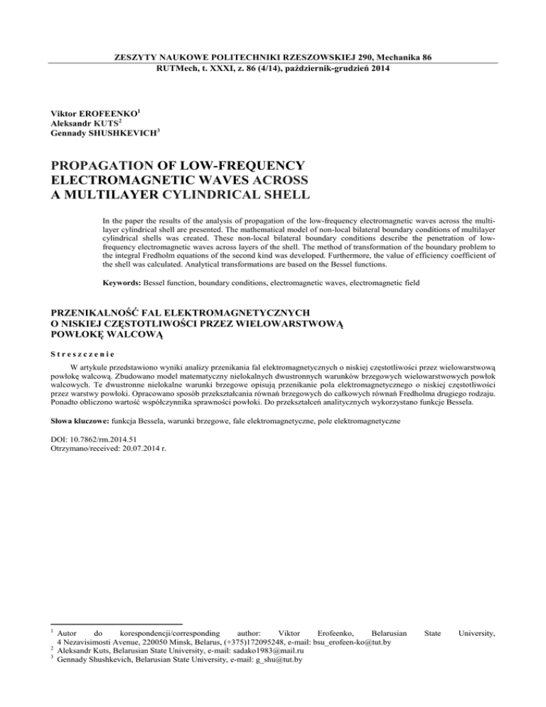 ZESZYTY NAUKOWE POLITECHNIKI RZESZOWSKIEJ 290, Mechanika 86 RUTMech, t. XXXI, z. 86 (4/14), październik-grudzień 2014 Viktor EROFEENKO1 Aleksandr KUTS2 Gennady SHUSHKEVICH3 PROPAGATION OF LOW-FREQUENCY ELECTROMAGNETIC WAVES ACROSS A MULTILAYER CYLINDRICAL SHELL In the paper the results of the analysis of propagation of the low-frequency electromagnetic waves across the multilayer cylindrical shell are presented. The mathematical model of non-local bilateral boundary conditions of multilayer cylindrical shells was created. These non-local bilateral boundary conditions describe the penetration of lowfrequency electromagnetic waves across layers of the shell. The method of transformation of the boundary problem to the integral Fredholm equations of the second kind was developed. Furthermore, the value of efficiency coefficient of the shell was calculated. Analytical transformations are based on the Bessel functions. Keywords: Bessel function, boundary conditions, electromagnetic waves, electromagnetic field PRZENIKALNOŚĆ FAL ELEKTROMAGNETYCZNYCH O NISKIEJ CZĘSTOTLIWOŚCI PRZEZ WIELOWARSTWOWĄ POWŁOKĘ WALCOWĄ Streszczenie W artykule przedstawiono wyniki analizy przenikania fal elektromagnetycznych o niskiej częstotliwości przez wielowarstwową powłokę walcową. Zbudowano model matematyczny nielokalnych dwustronnych warunków brzegowych wielowarstwowych powłok walcowych. Te dwustronne nielokalne warunki brzegowe opisują przenikanie pola elektromagnetycznego o niskiej częstotliwości przez warstwy powłoki. Opracowano sposób przekształcania równań brzegowych do całkowych równań Fredholma drugiego rodzaju. Ponadto obliczono wartość współczynnika sprawności powłoki. Do przekształceń analitycznych wykorzystano funkcje Bessela. Słowa kluczowe: funkcja Bessela, warunki brzegowe, fale elektromagnetyczne, pole elektromagnetyczne DOI: 10.7862/rm.2014.51 Otrzymano/received: 20.07.2014 r. 1 2 3 Autor do korespondencji/corresponding author: Viktor Erofeenko, Belarusian 4 Nezavisimosti Avenue, 220050 Minsk, Belarus, (+375)172095248, e-mail: [email protected] Aleksandr Kuts, Belarusian State University, e-mail: [email protected] Gennady Shushkevich, Belarusian State University, e-mail: [email protected] State University, Rafał GAŁEK4 Paweł GIL5 Sebastian GROSICKI6 Franciszek WOLAŃCZYK7 WYMIENNIKOWY ZASOBNIK CIEPŁA W MIKROKOGENERACJI Artykuł przedstawia wyniki eksperymentalne okresowego badania efektów pracy wolno stojącego wymiennika z węŜownicą spiralną jako zasobnika ciepła w instalacji kogeneracji opartej na małej jednostce kogeneracyjnej GECC60A2N firmy AISIN. Zasobnik jako bufor ciepła ma zapewnić moŜliwość dostarczenia czynnika grzewczego do odbiorcy przy chwilowym poborze większym niŜ wydajność źródła ciepła. Czasowy okres badań instalacji mikrokogeneracji wyznaczało rozpoczęcie ładowania zasobnika, a zakończenie badań to włączenie zewnętrzne chłodzenia kogeneratora. Otrzymane wartości pomiarów mocy cieplnej kogeneratora zasilającego zasobnik w ciepło mają tendencję spadkową, dochodzącą do 60% początkowej mocy. Słowa kluczowe: kogeneracja, mikro CHP, zasobnik ciepła STORAGE TANK WITH HEAT EXCHANGER AT MICROCOGENERATION SYSTEMS Summary This article presents the results of experimental periodic studies on the effect of work of a free-standing exchanger with a spiral coil as a heat storage tank in the cogeneration installation based on the small AISIN GECC60A2N cogeneration unit. The heat storage tank as a heat buffer is to deliver the heating medium during the temporary request greater than the heat source efficiency. Investigations of cogeneration were started at the moment of heat storage tank and it was finished at startup of external cooling of the cogenerator. The measurement values of thermal power of cogenerator feeding the heat accumulator tend to decrease to 60% of the initial power. Keywords: cogeneration, micro CHP, heat storage tank DOI: 10.7862/rm.2014.52 Otrzymano/received: 2.09.2014 r. Zaakceptowano/accepted: 22.11.2014 r. 4 5 6 7 Autor do korespondencji/corresponding author: Rafał Gałek, Politechnika Rzeszowska, al. Powstańców Warszawy 8, 35-959 Rzeszów, tel.: (17) 86251341, e-mail: [email protected] Paweł Gil, Politechnika Rzeszowska, e-mail: [email protected] Sebastian Grosicki, Politechnika Rzeszowska, e-mail: [email protected] Franciszek Wolańczyk, Politechnika Rzeszowska, e-mail: [email protected] Piotr GIERLAK8 ANALIZA KINEMATYKI MANIPULATORA O PIĘCIU STOPNIACH SWOBODY W artykule przestawiono analizę kinematyki manipulatora o pięciu stopniach swobody na przykładzie jednostki kinematycznej robota manipulacyjnego Scorbot-ER 4pc. Do opisu kinematyki układu zastosowano notację DenavitaHartenberga. Przyjęto schemat kinematyki manipulatora i podano parametry opisujące układ. Zapisano odpowiednie macierze transformacji, które zastosowano w dalszej analizie. Wyznaczono jakobian analityczny manipulatora oraz jakobian geometryczny w ciele i przeprowadzono analizę osobliwości. Są to takie konfiguracje manipulatora, w których wyznaczenie rozwiązania zadania odwrotnego kinematyki jest znacznie utrudnione, a przy zastosowaniu klasycznych metod – niemoŜliwe. Dlatego znajomość konfiguracji osobliwych jest niezbędna w celu poprawnego planowania i generowania trajektorii manipulatora. Zaprezentowana metodyka jest uniwersalna i moŜe być stosowana do analizy kinematyki manipulatorów o innej strukturze kinematycznej niŜ zaprezentowana w niniejszej pracy. Słowa kluczowe: jakobian, konfiguracje osobliwe, notacja Denavita-Hartenberga ANALYSIS OF THE KINEMATICS OF THE 5DOF MANIPULATOR Summary In the paper the kinematics analysis of 5 degrees of freedom manipulator is presented. The analysis was realised for the ScorbotER 4pc robotic manipulator. To describe the kinematics of the manipulator the Denavit-Hartenberg notation is used. The kinematics scheme and parameters of the manipulator as well