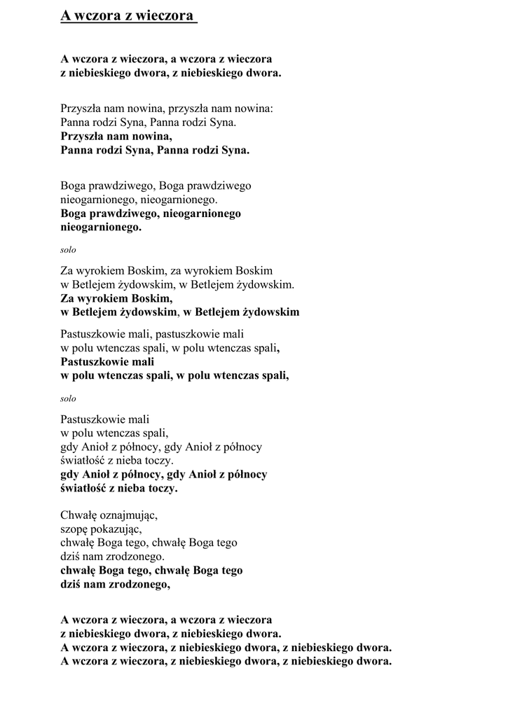 A wczora z wieczora A wczora z wieczora, a wczora z wieczora z niebieskiego dwora, z niebieskiego dwora. Przyszła nam nowina, przyszła nam nowina: Panna rodzi Syna, Panna rodzi Syna. Przyszła nam nowina, Panna rodzi Syna, Panna rodzi Syna. Boga prawdziwego, Boga prawdziwego nieogarnionego, nieogarnionego. Boga prawdziwego, nieogarnionego nieogarnionego. solo Za wyrokiem Boskim, za wyrokiem Boskim w Betlejem żydowskim, w Betlejem żydowskim. Za wyrokiem Boskim, w Betlejem żydowskim, w Betlejem żydowskim Pastuszkowie mali, pastuszkowie mali w polu wtenczas spali, w polu wtenczas spali, Pastuszkowie mali w polu wtenczas spali, w polu wtenczas spali, solo Pastuszkowie mali w polu wtenczas spali, gdy Anioł z północy, gdy Anioł z północy światłość z nieba toczy. gdy Anioł z północy, gdy Anioł z północy światłość z nieba toczy. Chwałę oznajmując, szopę pokazując, chwałę Boga tego, chwałę Boga tego dziś nam zrodzonego. chwałę Boga tego, chwałę Boga tego dziś nam zrodzonego, A wczora z wieczora, a wczora z wieczora z niebieskiego dwora, z niebieskiego dwora. A wczora z wieczora, z niebieskiego dwora, z niebieskiego dwora. A wczora z wieczora, z niebieskiego dwora, z niebieskiego dwora.