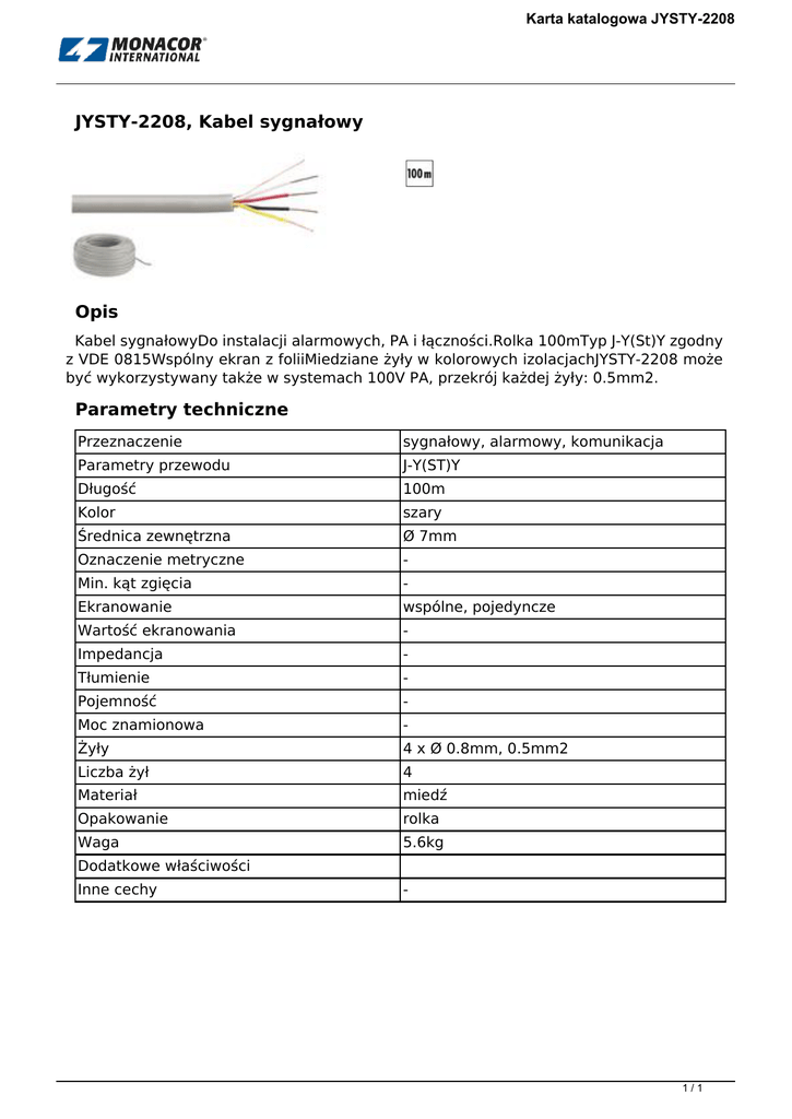 Karta katalogowa JYSTY-2208 JYSTY-2208, Kabel sygnałowy Opis Kabel sygnałowyDo instalacji alarmowych, PA i łączności.Rolka 100mTyp J-Y(St)Y zgodny z VDE 0815Wspólny ekran z foliiMiedziane żyły w kolorowych izolacjachJYSTY-2208 może być wykorzystywany także w systemach 100V PA, przekrój każdej żyły: 0.5mm2. Parametry techniczne Przeznaczenie sygnałowy, alarmowy, komunikacja Parametry przewodu J-Y(ST)Y Długość 100m Kolor szary Średnica zewnętrzna Ø 7mm Oznaczenie metryczne - Min. kąt zgięcia - Ekranowanie wspólne, pojedyncze Wartość ekranowania - Impedancja - Tłumienie - Pojemność - Moc znamionowa - Żyły 4 x Ø 0.8mm, 0.5mm2 Liczba żył 4 Materiał miedź Opakowanie rolka Waga 5.6kg Dodatkowe właściwości Inne cechy - 1/1 Powered by TCPDF (www.tcpdf.org)